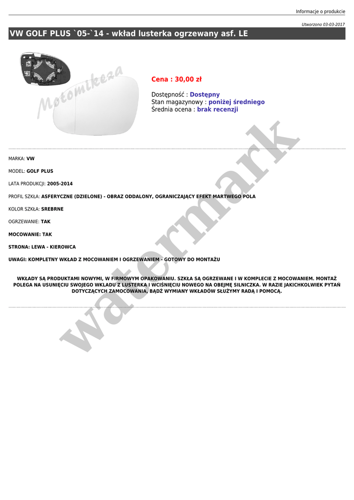 Informacje o produkcie Utworzono 03-03-2017 VW GOLF PLUS `05-`14 - wkład lusterka ogrzewany asf. LE Cena : 30,00 zł MARKA: VW MODEL: GOLF PLUS LATA PRODUKCJI: 2005-2014 er m ar k Dostępność : Dostępny Stan magazynowy : poniżej średniego Średnia ocena : brak recenzji PROFIL SZKŁA: ASFERYCZNE (DZIELONE) - OBRAZ ODDALONY, OGRANICZAJĄCY EFEKT MARTWEGO POLA KOLOR SZKŁA: SREBRNE OGRZEWANIE: TAK MOCOWANIE: TAK STRONA: LEWA - KIEROWCA UWAGI: KOMPLETNY WKŁAD Z MOCOWANIEM I OGRZEWANIEM - GOTOWY DO MONTAŻU w at WKŁADY SĄ PRODUKTAMI NOWYMI, W FIRMOWYM OPAKOWANIU. SZKŁA SĄ OGRZEWANE I W KOMPLECIE Z MOCOWANIEM. MONTAŻ POLEGA NA USUNIĘCIU SWOJEGO WKLADU Z LUSTERKA I WCIŚNIĘCIU NOWEGO NA OBEJMĘ SILNICZKA. W RAZIE JAKICHKOLWIEK PYTAŃ DOTYCZĄCYCH ZAMOCOWANIA, BĄDŹ WYMIANY WKŁADÓW SŁUŻYMY RADĄ I POMOCĄ.