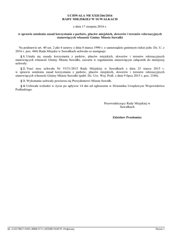 UCHWAŁA NR XXII/266/2016 RADY MIEJSKIEJ W SUWAŁKACH z dnia 17 sierpnia 2016 r. w sprawie ustalenia zasad korzystania z parków, placów miejskich, skwerów i terenów rekreacyjnych stanowiących własność Gminy Miasta Suwałki Na podstawie art. 40 ust. 2 pkt 4 ustawy z dnia 8 marca 1990 r. o samorządzie gminnym (tekst jedn. Dz. U. z 2016 r. poz. 446) Rada Miejska w Suwałkach uchwala co następuje: § 1. Ustala się zasady korzystania z parków, placów miejskich, skwerów i terenów rekreacyjnych stanowiących własność Gminy Miasta Suwałki, zawarte w regulaminie stanowiącym załącznik do niniejszej uchwały. § 2. Traci moc uchwała Nr VI/51/2015 Rady Miejskiej w Suwałkach z dnia 25 marca 2015 r. w sprawie ustalenia zasad korzystania z parków, placów miejskich, skwerów i terenów rekreacyjnych stanowiących własność Gminy Miasta Suwałki (publ. Dz. Urz. Woj. Podl. z dnia 9 lipca 2015 r. poz. 2346). § 3. Wykonanie uchwały powierza się Prezydentowi Miasta Suwałk. § 4. Uchwała wchodzi w życie po upływie 14 dni od ogłoszenia w Dzienniku Urzędowym Województwa Podlaskiego. Przewodniczący Rady Miejskiej w Suwałkach Zdzisław Przełomiec Id: A1EC9B27-F603-40B8-8711-492DB1564F59. Podpisany Strona 1 Załącznik do Uchwały Nr XXII/266/2016 Rady Miejskiej w Suwałkach z dnia 17 sierpnia 2016 r. REGULAMIN KORZYSTANIA Z PARKÓW, PLACÓW MIEJSKICH, SKWERÓW I TERENÓW REKREACYJNYCH STANOWIĄCYCH WŁASNOŚĆ GMINY MIASTA SUWAŁKI 1. Parki, place miejskie, skwery i tereny rekreacyjne przeznaczone są do wypoczynku i rekreacji. 2. Na terenach, o których mowa w pkt 1 niniejszego regulaminu zabrania się: a) zaśmiecania b) niszczenia roślinności i rozkopywania gruntu c) handlu i usług bez zezwolenia zarządcy terenu d) używania urządzeń nagłaśniających lub innych urządzeń wywołujących hałas bez stosownych zezwoleń e) palenia ognisk i grillowania z wyjątkiem imprez, na które zostały wydane stosowne zezwolenia f) spożywania alkoholu z wyłączeniem miejsc, w których prowadzona jest działalność gospodarcza w tym zakresie oraz w trakcie zorganizowanych imprez, na które zostały wydane stosowne zezwolenia g) ruchu pojazdów silnikowych, zaprzęgowych i motorowerów bez zezwolenia zarządcy terenu h) wjeżdżania na fontanny pojazdami silnikowymi, rowerem, hulajnogą, na rolkach lub wrotkach itp. i) picia wody z fontann j) niszczenia oraz przestawiania ławek, koszy na śmieci oraz innych urządzeń znajdujących się na tych terenach k) umieszczania tablic, reklam, itp. bez zgody zarządcy terenu l) umieszczania elementów małej architektury, kontenerów itp. bez zgody zarządcy terenu m) organizowania imprez bez stosownych zezwoleń. 3. Psy należy prowadzić na smyczy i w kagańcu. 4. Właścicielom zwierząt nakazuje się sprzątanie odchodów pozostawionych przez ich zwierzęta. 5. Stosowne zezwolenia, o których mowa w regulaminie można uzyskać w Zarządzie Dróg i Zieleni w Suwałkach, ul. Sejneńska 84, 16-400 Suwałki, tel. (87) 566 78 55, (87) 567 57 32. 6. NUMER ALARMOWY EMERGENCY NUMBER HOMEP ЭKCTPEHHOГO ВЬIЗOBA POLICJA STRAŻ POŻARNA RATOWNICTWO MEDYCZNE Numery dodatkowe: 986 - Straż Miejska (87) 566 78 55, (87) 567 57 32 - Zarząd Dróg i Zieleni w Suwałkach (zarządca terenu) Id: A1EC9B27-F603-40B8-8711-492DB1564F59. Podpisany Strona 1