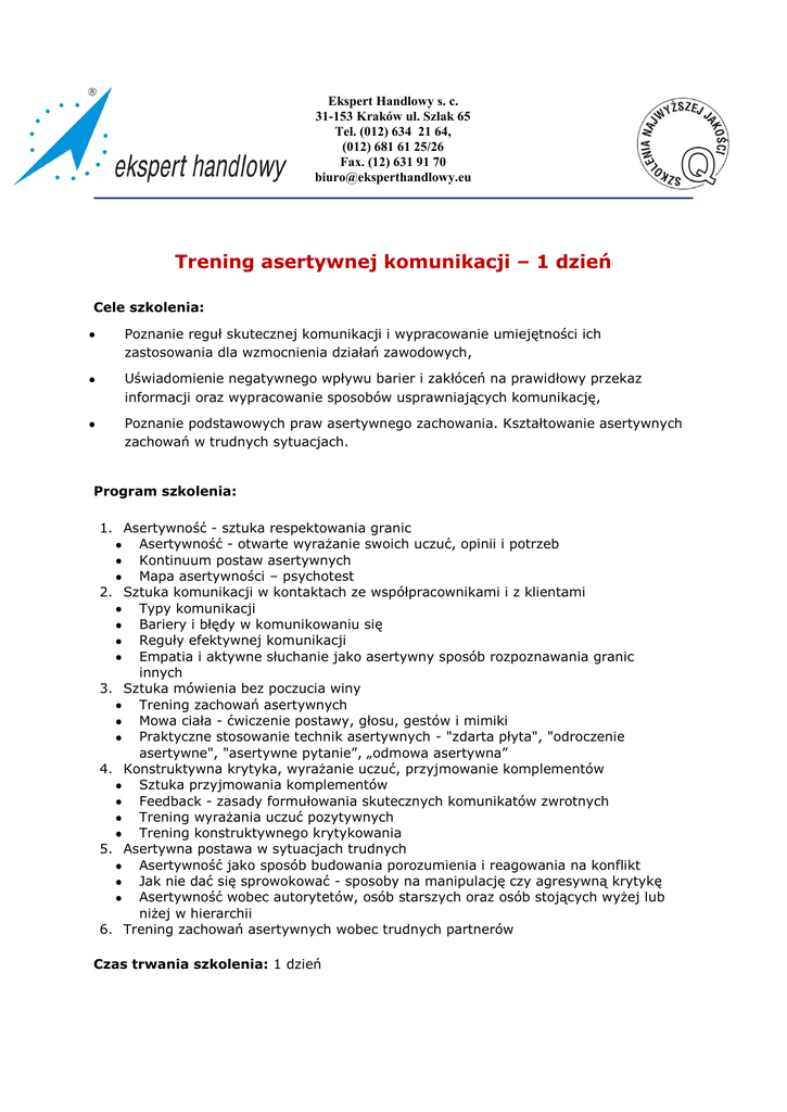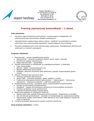 Ekspert Handlowy s. c. 31-153 Kraków ul. Szlak 65 Tel. (012) 634 21 64, (012) 681 61 25/26 Fax. (12) 631 91 70 [email protected] Trening asertywnej komunikacji – 1 dzień Cele szkolenia: Poznanie reguł skutecznej komunikacji i wypracowanie umiejętności ich zastosowania dla wzmocnienia działań zawodowych, Uświadomienie negatywnego wpływu barier i zakłóceń na prawidłowy przekaz informacji oraz wypracowanie sposobów usprawniających komunikację, Poznanie podstawowych praw asertywnego zachowania. Kształtowanie asertywnych zachowań w trudnych sytuacjach. Program szkolenia: 1. Asertywność - sztuka respektowania granic Asertywność - otwarte wyrażanie swoich uczuć, opinii i potrzeb Kontinuum postaw asertywnych Mapa asertywności – psychotest 2. Sztuka komunikacji w kontaktach ze współpracownikami i z klientami Typy komunikacji Bariery i błędy w komunikowaniu się Reguły efektywnej komunikacji Empatia i aktywne słuchanie jako asertywny sposób rozpoznawania granic innych 3. Sztuka mówienia bez poczucia winy Trening zachowań asertywnych Mowa ciała - ćwiczenie postawy, głosu, gestów i mimiki Praktyczne stosowanie technik asertywnych - "zdarta płyta", "odroczenie asertywne", "asertywne pytanie”, „odmowa asertywna” 4. Konstruktywna krytyka, wyrażanie uczuć, przyjmowanie komplementów Sztuka przyjmowania komplementów Feedback - zasady formułowania skutecznych komunikatów zwrotnych Trening wyrażania uczuć pozytywnych Trening konstruktywnego krytykowania 5. Asertywna postawa w sytuacjach trudnych Asertywność jako sposób budowania porozumienia i reagowania na konflikt Jak nie dać się sprowokować - sposoby na manipulację czy agresywną krytykę Asertywność wobec autorytetów, osób starszych oraz osób stojących wyżej lub niżej w hierarchii 6. Trening zachowań asertywnych wobec trudnych partnerów Czas trwania szkolenia: 1 dzień PROWADZĄCY: UZNANY W KRAJU Trener Biznesu, Doradca Manager – Praktyk z doświadczeniem w realizacji szkoleń i projektów doradczych; Menedżer – Praktyk; posiada wykształcenie biznesowe (AE w Krakowie – Handel Zagraniczny; Ecole Superieure de Commerce de Rouen – Bankowość i Finanse); zajmowała stanowiska menedżerskie w takich koncernach, jak Auchan Polska, Groupe Andre, PPG, głównie w obszarach zarządzania, sprzedaży i obsługi Klienta; w PPG stworzyła od podstaw nowoczesny i wysoce profesjonalny Dział Obsługi Klienta (telemarketing, zespół ds. reklamacji, zespół ds. szkoleń, zarządzanie programem lojalnościowym, Badania Satysfakcji Klientów i Pracowników i Mystery Shopping), którym zarządzała przez 7 lat.
