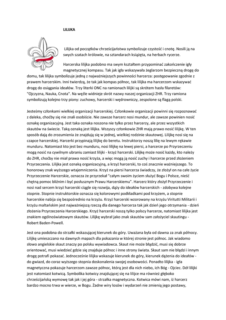 LILIJKA Lilijka od początków chrześcijaostwa symbolizuje czystośd i cnotę. Nosili ją na swych szatach królowie, na sztandarach książęta, na herbach rycerze. Harcerska lilijka podobno ma swym kształtem przypominad zakooczenie igły magnetycznej kompasu. Tak jak igła wskazywała żeglarzom bezpieczną drogę do domu, tak lilijka symbolizuje jedną z najważniejszych powinności harcerza: postępowanie zgodnie z prawem harcerskim. Inni twierdzą, że tak jak kompas północ, tak lilijka ma harcerzom wskazywad drogę do osiągania ideałów. Trzy literki ONC na ramionach lilijki są skrótem hasła filaretów: "Ojczyzna, Nauka, Cnota". Na węźle widnieje skrót nazwy naszej organizacji ZHR. Trzy ramiona symbolizują kolejno trzy piony: zuchowy, harcerski i wędrowniczy, zespolone są flagą polski. Jesteśmy członkami wielkiej organizacji harcerskiej. Członkowie organizacji powinni się rozpoznawad z daleka, chodby się nie znali osobiście. Nie zawsze harcerz nosi mundur, ale zawsze powinien nosid oznakę organizacyjną. Jest taka oznaka noszona nie tylko przez harcerzy, ale przez wszystkich skautów na świecie. Taką oznaką jest lilijka. Wszyscy członkowie ZHR mają prawo nosid lilijkę. W ten sposób dają do zrozumienia że znajdują się w jednej, wielkiej rodzinie skautowej. Lilijkę nosi się na czapce harcerskiej. Harcerki przypinają lilijkę do beretu. Instruktorzy noszą lilię na lewym rękawie munduru. Natomiast kto jest bez munduru, nosi lilijkę na lewej piersi, a harcerze po Przyrzeczeniu mogą nosid na cywilnym ubraniu zamiast lilijki - krzyż harcerski. Lilijkę może nosid każdy, kto należy do ZHR, chodby nie miał prawa nosid krzyża, a więc mogą ją nosid zuchy i harcerze przed złożeniem Przyrzeczenia. Lilijka jest oznaką organizacyjną, a krzyż harcerski, to coś znacznie ważniejszego. To honorowy znak wyższego wtajemniczenia. Krzyż na piersi harcerza świadczy, że złożył on na całe życie Przyrzeczenie Harcerskie, oznacza że przyrzekał "całym swoim życiem służyd Bogu i Polsce, nieśd chętną pomoc bliźnim i byd posłusznym Prawu Harcerskiemu". Harcerz który złożył Przyrzeczenie i nosi nad sercem krzyż harcerski ciągle się rozwija, dąży do ideałów harcerskich - zdobywa kolejne stopnie. Stopnie instruktorskie oznacza się kolorowymi podkładkami pod krzyżem, a stopnie harcerskie nabija się bezpośrednio na krzyżu. Krzyż harcerski wzorowany na krzyżu Viritutti Militarii i krzyżu maltaoskim jest najważniejszą rzeczą dla danego harcerza tak jak dzieo jego otrzymania - dzieo złożenia Przyrzeczenia Harcerskiego. Krzyż harcerski noszą tylko polscy harcerze, natomiast lilijka jest znakiem ogólnoświatowym skautów. Lilijkę wybrał jako znak skautów sam założyciel skautingu Robert Baden-Powell. Jest ona podobna do strzałki wskazującej kierunek do góry. Uważana była od dawna za znak północy. Lilijkę umieszczano na dawnych mapach dla pokazania w której stronie jest północ. Jak wiadomo słowo angielskie skaut znaczy po polsku wywiadowca. Skaut nie może błądzid, musi się dobrze orientowad, musi wiedzied gdzie się znajduje północ i inne strony świata. Skaut sam nie błądzi i innym drogę potrafi pokazad. Jednocześnie lilijka wskazuje kierunek do góry, kierunek dążenia do ideałów do gwiazd, do coraz wyższego stopnia doskonalenia swojej osobowości. Ponadto lilijka - igła magnetyczna pokazuje harcerzom zawsze północ, którą jest dla nich niebo, ich Bóg - Ojciec. Dół lilijki jest natomiast kotwicą. Symbolika kotwicy znajdującej się na lilijce ma również głęboko chrześcijaoską wymowę tak jak i jej góra - strzałka magnetyczna. Kotwica mówi nam, iż harcerz bardzo mocno trwa w wierze, w Bogu. Żadne wiry losów i wydarzeo nie zmienią jego postawy, zawsze będzie zawsze wierny trzem ideałom: Bogu, Ojczyźnie, Bliźnim. Dlatego Baden - Powell wybrał lilijkę na oznakę skautową. Jednak czym naprawdę jest symbol lilijki. Znak lilii ma swoją bardzo ciekawą historię, sięgającą przeszło 1000 lat. Lilia była znakiem królewskim, ale tylko niektóre rody królewskie mogły nosid w koronie lilię. Lilie można spotkad na sarkofagach, znajdują się one w królewskich koronach. Można je również zobaczyd na Wawelu gdzie znajdują się za sprawą naszej królowej - św. Jadwigi, która w swoim herbie rodowym miała lilię uważaną również za symbol czystości. Lilię znamy więc nie od skautów, lecz od naszej świętej królowej, już przeszło 500 lat. Stąd lilijka jest nam harcerzom bardziej bliska, niż innym skautom. Ponadto znak lilii, drogą przywilejów królewskich znalazł się w herbach wielu rodów rycerskich Europy. W Polsce dobrze znanym herbem szlacheckim był herb "Gozdawa" - biała lilia na czerwonym tle. Lilijka harcerska jest już inna niż przed kilkunastu laty. Jest taka, jaką w Polsce ustalił ją na początku Andrzej Małkowski. Może nie wiecie, ale kilkanaście lat temu zmuszano harcerzy aby nosili karykaturę lilijki. Otóż wówczas znaleźli się we władzach będącego pod władzami partii komunistycznej ZHP poprawiacze tradycji, którzy z zapałem usuwali cenne tradycje polskie i narodowe i harcerstwa. Na pierwszym miejscu usunęli z tradycji, obrzędowości i symboliki harcerskiej Boga. Następnie zmienili prawo, stopnie, sprawności, zniekształcili mundur instruktorski, usunęli czapkę - rogatywkę, wykoślawili lilijkę. Nadali jej kanciasty kształt. Lilijki wyglądały wtedy jakby wycięte z puszki po konserwach, nie miały liter ONC. Niewiadomo dlaczego te słowa: Ojczyzna, Nauka i Cnota (ONC) tamtym panom się nie podobały, że je usunęli. Toteż odrodzone harcerstwo w 1980 roku w pierwszym rzędzie przywróciło tradycyjną lilijkę, nie czekając na nowe regulaminy. Obecnie lilijka harcerska znów posiada owe litery. Znajdują się na górze, natomiast na dole widnieją litery ZHR. To skrót oficjalnie nazwy naszego Związ