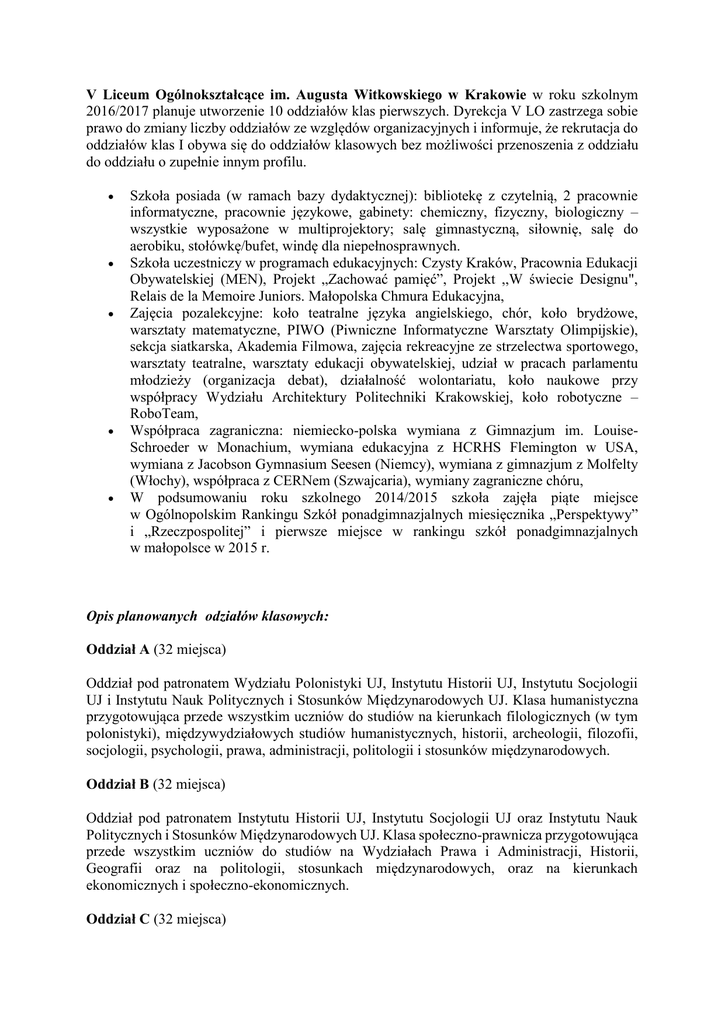 V Liceum Ogólnokształcące im. Augusta Witkowskiego w Krakowie w roku szkolnym 2016/2017 planuje utworzenie 10 oddziałów klas pierwszych. Dyrekcja V LO zastrzega sobie prawo do zmiany liczby oddziałów ze względów organizacyjnych i informuje, że rekrutacja do oddziałów klas I obywa się do oddziałów klasowych bez możliwości przenoszenia z oddziału do oddziału o zupełnie innym profilu. Szkoła posiada (w ramach bazy dydaktycznej): bibliotekę z czytelnią, 2 pracownie informatyczne, pracownie językowe, gabinety: chemiczny, fizyczny, biologiczny – wszystkie wyposażone w multiprojektory; salę gimnastyczną, siłownię, salę do aerobiku, stołówkę/bufet, windę dla niepełnosprawnych. Szkoła uczestniczy w programach edukacyjnych: Czysty Kraków, Pracownia Edukacji Obywatelskiej (MEN), Projekt „Zachować pamięć”, Projekt ,,W świecie Designu", Relais de la Memoire Juniors. Małopolska Chmura Edukacyjna, Zajęcia pozalekcyjne: koło teatralne języka angielskiego, chór, koło brydżowe, warsztaty matematyczne, PIWO (Piwniczne Informatyczne Warsztaty Olimpijskie), sekcja siatkarska, Akademia Filmowa, zajęcia rekreacyjne ze strzelectwa sportowego, warsztaty teatralne, warsztaty edukacji obywatelskiej, udział w pracach parlamentu młodzieży (organizacja debat), działalność wolontariatu, koło naukowe przy współpracy Wydziału Architektury Politechniki Krakowskiej, koło robotyczne – RoboTeam, Współpraca zagraniczna: niemiecko-polska wymiana z Gimnazjum im. LouiseSchroeder w Monachium, wymiana edukacyjna z HCRHS Flemington w USA, wymiana z Jacobson Gymnasium Seesen (Niemcy), wymiana z gimnazjum z Molfelty (Włochy), współpraca z CERNem (Szwajcaria), wymiany zagraniczne chóru, W podsumowaniu roku szkolnego 2014/2015 szkoła zajęła piąte miejsce w Ogólnopolskim Rankingu Szkół ponadgimnazjalnych miesięcznika „Perspektywy” i „Rzeczpospolitej” i pierwsze miejsce w rankingu szkół ponadgimnazjalnych w małopolsce w 2015 r. Opis planowanych odziałów klasowych: Oddział A (32 miejsca) Oddział pod patronatem Wydziału Polonistyki UJ, Instytutu Historii UJ, Instytutu Socjologii UJ i Instytutu Nauk Politycznych i Stosunków Międzynarodowych UJ. Klasa humanistyczna przygotowująca przede wszystkim uczniów do studiów na kierunkach filologicznych (w tym polonistyki), międzywydziałowych studiów humanistycznych, historii, archeologii, filozofii, socjologii, psychologii, prawa, administracji, politologii i stosunków międzynarodowych. Oddział B (32 miejsca) Oddział pod patronatem Instytutu Historii UJ, Instytutu Socjologii UJ oraz Instytutu Nauk Politycznych i Stosunków Międzynarodowych UJ. Klasa społeczno-prawnicza przygotowująca przede wszystkim uczniów do studiów na Wydziałach Prawa i Administracji, Historii, Geografii oraz na politologii, stosunkach międzynarodowych, oraz na kierunkach ekonomicznych i społeczno-ekonomicznych. Oddział C (32 miejsca) Oddział pod patronatem Wydziału Chemii UJ i Wydziału Biochemii, Biofizyki i Biotechnologii UJ. Klasa matematyczno-chemiczna przygotowująca przede wszystkim uczniów do studiów na kierunkach chemicznych i matematyczno-przyrodniczych. Odział D (32 miejsca) Klasa matematyczno-fizyczna przygotowująca przede wszystkim uczniów do studiów na kierunkach związanych z naukami ścisłymi oraz na studiach technicznych. Oddział pod patronatem Katedry Informatyki Akademii Górniczo-Hutniczej im. Stanisława Staszica w Krakowie z siedzibą w Krakowie, ul. Kawiory 21. Dodatkowe zajęcia z informatyki prowadzone będą w Katedrze Informatyki AGH w Krakowie. Odział E (32 miejsca) Oddział pod patronatem Instytutu Matematyki UJ oraz Instytutu Informatyki UJ. Klasa matematyczno-fizyczna przygotowująca przede wszystkim uczniów do studiów informatycznych, na kierunkach związanych z naukami ścisłymi oraz na studiach technicznych. Zajęcia z algorytmiki i częściowo z matematyki prowadzone na Kampusie UJ. Odział F H I (96 miejsc) Oddziały pod patronatem Wydziału Chemii UJ i Wydziału Biochemii, Biofizyki i Biotechnologii UJ. Klasy biologiczno-chemiczne przygotowujące uczniów przede wszystkim do studiowania na kierunkach medycznych oraz przyrodniczych. Odział G (32 miejsca) Oddział pod patronatem Instytutu Fizyki UJ. Klasa matematyczno-fizyczna przygotowująca uczniów do studiów na kierunkach związanych z naukami ścisłymi oraz na studiach technicznych. Zajęcia laboratoryjne z fizyki prowadzone w Instytucie Fizyki UJ. Odział J (32 miejsca) Klasa akademicka Wydziału Architektury Wnętrz ASP oraz objęta patronatem Instytutu Historii Sztuki UJ. Klasa przygotowująca przede wszystkim do studiowania na kierunkach artystycznych w Akademii Sztuk Pięknych, na Wydziale Architektury Politechniki Krakowskiej, na Wydziałach Prawa i Administracji oraz Historycznym. Część zajęć w klasie drugiej odbywać się będzie na Wydziale Architektury Wnętrz Akademii Sztuk Pięknych im. Jana Matejki w Krakowie. Dodatkowo zainteresowani uczniowie będą mogli brać udział w pracach i projektach realizowanych przez Koło Naukowe Studentów Wydziału Architektury Politechniki Krakowskiej im. Tadeusza Kościuszki.