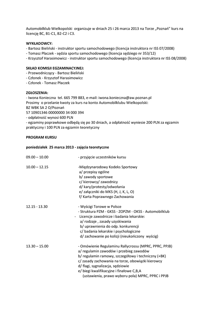 Automobilklub Wielkopolski organizuje w dniach 25 i 26 marca 2013 na Torze „Poznań” kurs na licencję BC, B1-C1, B2-C2 i C3. WYKŁADOWCY: - Bartosz Bieliński - instruktor sportu samochodowego (licencja instruktora nr ISS 07/2008) - Tomasz Płaczek - sędzia sportu samochodowego (licencja sędziego nr 353/12) - Krzysztof Harasimowicz - instruktor sportu samochodowego (licencja instruktora nr ISS 08/2008) SKŁAD KOMISJI EGZAMINACYJNEJ: - Przewodniczący - Bartosz Bieliński - Członek - Krzysztof Harasimowicz - Członek - Tomasz Płaczek ZGŁOSZENIA: - Iwona Konieczna tel. 665 799 883, e-mail: [email protected] Prosimy o przelanie kwoty za kurs na konto Automobilklubu Wielkopolski: BZ WBK SA 2 O/Poznań 57 10901346 00000000 34 000 394 - odpłatność wynosi 600 PLN - egzaminy poprawkowe odbędą się po 30 dniach, a odpłatność wyniesie 200 PLN za egzamin praktyczny i 100 PLN za egzamin teoretyczny PROGRAM KURSU poniedziałek 25 marca 2013 - zajęcia teoretyczne 09.00 – 10.00 - przyjęcie uczestników kursu 10.00 – 12.15 -Międzynarodowy Kodeks Sportowy a/ przepisy ogólne b/ zawody sportowe c/ kierowcy/ zawodnicy d/ kary/protesty/odwołania e/ załączniki do MKS (H, J, K, L, O) f/ Karta Poprawnego Zachowania 12.15 - 13.30 13.30 – 15.00 - Wyścigi Torowe w Polsce - Struktura PZM - GKSS - ZOPZM - OKSS - Automobilklub - Licencje zawodnicze i badania lekarskie: a/ rodzaje , zasady uzyskiwania b/ uprawnienia do odp. konkurencji c/ badania lekarskie i psychologiczne d/ zachowanie po kolizji (nieukończony wyścig) - Omówienie Regulaminu Rallycrossu (MPRC, PPRC, PPJB) a/ regulamin zawodów i przebieg zawodów b/ regulamin ramowy, szczegółowy i techniczny (+BK) c/ zasady zachowania na torze, obowiązki kierowcy d/ flagi, sygnalizacja, sędziowie e/ biegi kwalifikacyjne i finałowe C,B,A (ustawienia, prawo wyboru pola) MPRC, PPRC i PPJB 15.00 – 17.00 - Wyścigi samochodowe w Polsce /WSM,P WPP i Endurance) a/ regulamin zawodów, przebieg zawodów b/ regulamin ramowy i szczegółowy (+BK) c/ bezpieczeństwo i zasady zachowania się na torze d/flagi, sygnalizacja i polecenia wydawane przez sędziów e/ samochód zabezpieczenia SAFETY CAR i służby ratownicze f/ wyścigi w ramach strefy ,tory g/ Puchary (VW, Porsche, KIA) Wtorek 26 marca 2013 - zajęcia praktyczne i teoretyczne – egzaminy 08.00 – 09.00 - podsumowanie wczorajszych zajęć, pytania, dyskusja (zajęcia nieobowiązkowe) 09.00 – 10.00 - Górskie Samochodowe Mistrzostwa Polski a/ regulamin zawodów (+BK) b/ przebieg zawodów 10.00 – 13.00 - Jazda z instruktorem i bez - Pola przedstartowe , ustawienia na polach - Pola startowe , ustawienia w poszczególnych konkurencjach (istotne różnice między MPRC, PPRC a Pucharem Polski Junior Buggy w biegach kwalifikacyjnych i biegach Finałowych) - Starty i falstarty (różnice w poszczególnych konkurencjach - Reagowanie na sygnały dawane flagami i tablicami - Obowiązki kierowcy na torze (+jazda poza torem) - Zachowanie się kierowcy w sytuacjach ekstremalnych 13.30 – 15.30 - Jazdy po torze z instruktorem i bez (w tym nieobowiązkowa jazda samochodem z trolejami jako element wyczucia i opanowania samochodu w uślizgu bocznym) 16.00 – 17.00 - podsumowanie i przerwa 17.00 - egzamin praktyczny i teoretyczny INFORMACJE DODATKOWE Na kurs oraz egzamin przyjeżdżamy własnym samochodem z manualną skrzynią biegów (nie musi być sportowy) wraz z obowiązkowym wyposażeniem bezpieczeństwa np.kaskiem ochronnym. Automobilklub Wielkopolski na Torze „Poznań” posiada bazę hotelową: - pokój 2-osobowy (bez śniadania) - 125 PLN - pokój 3-osobowy (bez śniadania) - 200 PLN - domek 6-osobowy (bez śniadania) - 335 PLN Chętnych do skorzystania z naszej bazy prosimy o wcześniejszą rezerwację pod nr telefonu 61 814 35 11 lub u kol. Iwony Koniecznej. Z poważaniem Kierownik Kursu Bartosz Bieliński