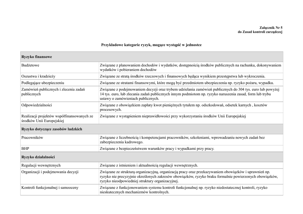 Załącznik Nr 5 do Zasad kontroli zarządczej Przykładowe kategorie ryzyk, mogące wystąpić w jednostce Ryzyko finansowe Budżetowe Związane z planowaniem dochodów i wydatków, dostępnością środków publicznych na rachunku, dokonywaniem wydatków i pobieraniem dochodów Oszustwa i kradzieży Związane ze stratą środków rzeczowych i finansowych będąca wynikiem przestępstwa lub wykroczenia. Podlegające ubezpieczeniu Związane ze stratami finansowymi, które mogą być przedmiotem ubezpieczenia np. ryzyko pożaru, wypadku. Zamówień publicznych i zlecenia zadań publicznych Związane z podejmowaniem decyzji oraz trybem udzielania zamówień publicznych do 304 tys. euro lub powyżej 14 tys. euro, lub zlecania zadań publicznych innym podmiotom np. ryzyko naruszenia zasad, form lub trybu ustawy o zamówieniach publicznych. Odpowiedzialności Związane z obowiązkiem zapłaty kwot pieniężnych tytułem np. odszkodowań, odsetek karnych , kosztów procesowych. Realizacji projektów współfinansowanych ze środków Unii Europejskiej Związane z wystąpieniem nieprawidłowości przy wykorzystaniu środków Unii Europejskiej Ryzyko dotyczące zasobów ludzkich Pracowników Związane z liczebnością i kompetencjami pracowników, szkoleniami, wprowadzaniu nowych zadań bez zabezpieczenia kadrowego. BHP Związane z bezpieczeństwem warunków pracy i wypadkami przy pracy. Ryzyko działalności Regulacji wewnętrznych Związane z istnieniem i aktualnością regulacji wewnętrznych. Organizacji i podejmowania decyzji Związane ze strukturą organizacyjną, organizacją pracy oraz przekazywaniem obowiązków i uprawnień np. ryzyko nie precyzyjnie określonych zakresów obowiązków, ryzyko braku formalnie powierzonych obowiązków, ryzyko nieodpowiedniej struktury organizacyjnej. Kontroli funkcjonalnej i samooceny Związane z funkcjonowaniem systemu kontroli funkcjonalnej np. ryzyko niedostatecznej kontroli, ryzyko nieskutecznych mechanizmów kontrolnych. Informacji Związane z jakością informacji na podstawie których podejmowane są decyzje np. ryzyko braku komunikacji w komunikacji wewnętrznej i zewnętrznej. Wizerunku Związane z wizerunkiem Urzędu oraz jednostki organizacyjnej gminy np. ryzyko negatywnych opinii i artykułów w prasie, internecie. Systemów informatycznych Związane z używanymi w Urzędzie oraz jednostce organizacyjnej gminy systemami i programami informatycznymi oraz ochroną zawartych w nich danych np. ryzyko awarii systemu, ryzyko dostępu do danych przez nieuprawnione osoby, ryzyko niekontrolowanej modyfikacji danych. Ryzyko zewnętrzne Infrastruktury Związane z infrastrukturą np. wyposażeniem, bazą lokalową, środkami transportu i środkami łączności. Gospodarcze Związane z czynnikami ekonomicznymi np. inflacja, kursy walut. Środowiska prawnego Związane ze skomplikowaniem i zmianami prawa oraz niejednolitym orzecznictwem.