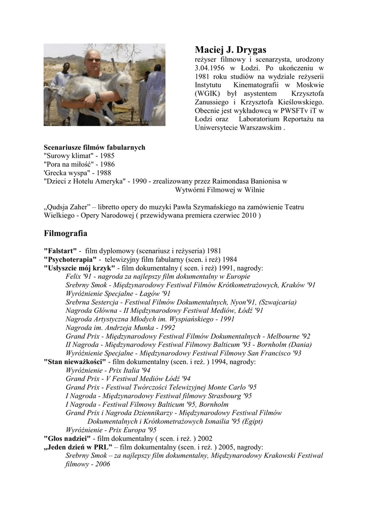 Maciej J. Drygas reżyser filmowy i scenarzysta, urodzony 3.04.1956 w Łodzi. Po ukończeniu w 1981 roku studiów na wydziale reżyserii Instytutu Kinematografii w Moskwie (WGIK) był asystentem Krzysztofa Zanussiego i Krzysztofa Kieślowskiego. Obecnie jest wykładowcą w PWSFTv iT w Łodzi oraz Laboratorium Reportażu na Uniwersytecie Warszawskim . Scenariusze filmów fabularnych "Surowy klimat" - 1985 "Pora na miłość" - 1986 'Grecka wyspa" - 1988 "Dzieci z Hotelu Ameryka" - 1990 - zrealizowany przez Raimondasa Banionisa w Wytwórni Filmowej w Wilnie „Qudsja Zaher” – libretto opery do muzyki Pawła Szymańskiego na zamówienie Teatru Wielkiego - Opery Narodowej ( przewidywana premiera czerwiec 2010 ) Filmografia "Falstart" - film dyplomowy (scenariusz i reżyseria) 1981 "Psychoterapia" - telewizyjny film fabularny (scen. i reż) 1984 "Usłyszcie mój krzyk" - film dokumentalny ( scen. i reż) 1991, nagrody: Felix '91 - nagroda za najlepszy film dokumentalny w Europie Srebrny Smok - Międzynarodowy Festiwal Filmów Krótkometrażowych, Kraków '91 Wyróżnienie Specjalne - Łagów '91 Srebrna Sestercja - Festiwal Filmów Dokumentalnych, Nyon'91, (Szwajcaria) Nagroda Główna - II Międzynarodowy Festiwal Mediów, Łódź '91 Nagroda Artystyczna Młodych im. Wyspiańskiego - 1991 Nagroda im. Andrzeja Munka - 1992 Grand Prix - Międzynarodowy Festiwal Filmów Dokumentalnych - Melbourne '92 II Nagroda - Międzynarodowy Festiwal Filmowy Balticum '93 - Bornholm (Dania) Wyróżnienie Specjalne - Międzynarodowy Festiwal Filmowy San Francisco '93 "Stan nieważkości" - film dokumentalny (scen. i reż. ) 1994, nagrody: Wyróżnienie - Prix Italia '94 Grand Prix - V Festiwal Mediów Łódź '94 Grand Prix - Festiwal Twórczości Telewizyjnej Monte Carlo '95 I Nagroda - Międzynarodowy Festiwal filmowy Strasbourg '95 I Nagroda - Festiwal Filmowy Balticum '95, Bornholm Grand Prix i Nagroda Dziennikarzy - Międzynarodowy Festiwal Filmów Dokumentalnych i Krótkometrażowych Ismailia '95 (Egipt) Wyróżnienie - Prix Europa '95 "Głos nadziei" - film dokumentalny ( scen. i reż. ) 2002 „Jeden dzień w PRL” – film dokumentalny (scen. i reż. ) 2005, nagrody: Srebrny Smok – za najlepszy film dokumentalny, Międzynarodowy Krakowski Festiwal filmowy - 2006 Nagroda TV Duna – Festiwal Filmowy Astra Rumunia – 2006 Wyróżnienie Specjalne Jury – Festiwal Filmów Dokumentalnych - Tajwan 2006 Srebrna Muszla – Festiwal Filmów Dokumentalnych – Bombaj 2007 Platinum Remi - 40th Worldfest Independent Film Festival Houston 2007 “Usłysz nas wszystkich” – krótkometrażowy film dokumentalny (scen. i reż.) 2008 Filmy M. Drygasa emitowane były przez stacje telewizyjne w Europie, Kanadzie, Australii i Japonii. Maciej Drygas jest również autorem i reżyserem dokumentalnych słuchowisk radiowych: "Testament" - 1992, nagrody: Prix Italia '92 Grand Prix Krajowej Rady Radiofonii i Telewizji za najlepsze słuchowisko dokumentalne III Rzeczpospolitej 1996 " Być w kosmosie" - 1995, nagrody: Nagroda Specjalna w konkursie Polskiego Radia "Polska i świat '95" Nagroda Honorowa - VII Festiwal Mediów Łódź '96 "Moja góra" - 2001, słuchowisko reprezentowało Polskie Radio na Prix Italia 2001 Dokumenty radiowe Macieja Drygasa były emitowane przez BBC, publiczne stacje radiowe Niemiec, Skandynawii i krajów Beneluxu.