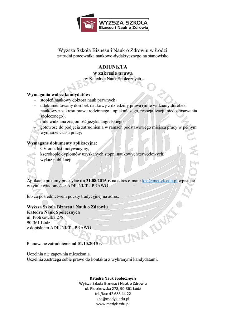 Wyższa Szkoła Biznesu i Nauk o Zdrowiu w Łodzi zatrudni pracownika naukowo-dydaktycznego na stanowisko ADIUNKTA w zakresie prawa w Katedrze Nauk Społecznych Wymagania wobec kandydatów: stopień naukowy doktora nauk prawnych, udokumentowany dorobek naukowy z dziedziny prawa (mile widziany dorobek naukowy z zakresu prawa rodzinnego i opiekuńczego, resocjalizacji, niedostosowania społecznego), mile widziana znajomość języka angielskiego, gotowość do podjęcia zatrudnienia w ramach podstawowego miejsca pracy w pełnym wymiarze czasu pracy. Wymagane dokumenty aplikacyjne: CV oraz list motywacyjny, kserokopie dyplomów uzyskanych stopni naukowych/zawodowych, wykaz publikacji. Aplikacje prosimy przesyłać do 31.08.2015 r. na adres e-mail: [email protected] wpisując w tytule wiadomości: ADIUNKT - PRAWO lub za pośrednictwem poczty tradycyjnej na adres: Wyższa Szkoła Biznesu i Nauk o Zdrowiu Katedra Nauk Społecznych ul. Piotrkowska 278, 90-361 Łódź z dopiskiem ADIUNKT - PRAWO Planowane zatrudnienie od 01.10.2015 r. Uczelnia nie zapewnia mieszkania. Uczelnia zastrzega sobie prawo do kontaktu z wybranymi kandydatami. Katedra Nauk Społecznych Wyższa Szkoła Biznesu i Nauk o Zdrowiu ul. Piotrkowska 278, 90-361 Łódź tel./fax: 42 683 44 22 [email protected] www.medyk.edu.pl