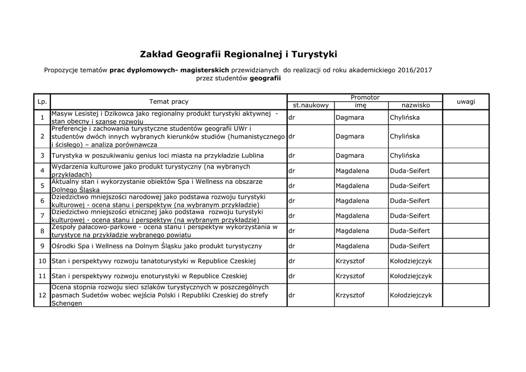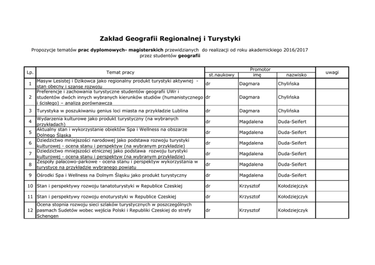 Zakład Geografii Regionalnej i Turystyki Propozycje tematów prac dyplomowych- magisterskich przewidzianych do realizacji od roku akademickiego 2016/2017 przez studentów geografii Lp. Temat pracy st.naukowy Masyw Lesistej i Dzikowca jako regionalny produkt turystyki aktywnej dr stan obecny i szanse rozwoju Preferencje i zachowania turystyczne studentów geografii UWr i studentów dwóch innych wybranych kierunków studiów (humanistycznego dr i ścisłego) – analiza porównawcza Promotor imę nazwisko Dagmara Chylińska Dagmara Chylińska dr Dagmara Chylińska dr Magdalena Duda-Seifert dr Magdalena Duda-Seifert dr Magdalena Duda-Seifert dr Magdalena Duda-Seifert dr Magdalena Duda-Seifert dr Magdalena Duda-Seifert 10 Stan i perspektywy rozwoju tanatoturystyki w Republice Czeskiej dr Krzysztof Kołodziejczyk 11 Stan i perspektywy rozwoju enoturystyki w Republice Czeskiej dr Krzysztof Kołodziejczyk Ocena stopnia rozwoju sieci szlaków turystycznych w poszczególnych 12 pasmach Sudetów wobec wejścia Polski i Republiki Czeskiej do strefy Schengen dr Krzysztof Kołodziejczyk 1 2 3 4 5 6 7 8 9 Turystyka w poszukiwaniu genius loci miasta na przykładzie Lublina Wydarzenia kulturowe jako produkt turystyczny (na wybranych przykładach) Aktualny stan i wykorzystanie obiektów Spa i Wellness na obszarze Dolnego Śląska Dziedzictwo mniejszości narodowej jako podstawa rozwoju turystyki kulturowej - ocena stanu i perspektyw (na wybranym przykładzie) Dziedzictwo mniejszości etnicznej jako podstawa rozwoju turystyki kulturowej - ocena stanu i perspektyw (na wybranym przykładzie) Zespoły pałacowo-parkowe - ocena stanu i perspektyw wykorzystania w turystyce na przykładzie wybranego powiatu Ośrodki Spa i Wellness na Dolnym Śląsku jako produkt turystyczny uwagi Ocena stopnia rozwoju sieci szlaków turystycznych w poszczególnych 13 pasmach Karpat wobec wejścia Polski, Słowacji i Republiki Czeskiej do strefy Schengen Funkcja ekologiczna sieci szlaków turystycznych wybranego parku 14 narodowego dr Krzysztof Kołodziejczyk dr Krzysztof Kołodziejczyk dr Krzysztof Kołodziejczyk dr Janusz Łach dr Janusz Łach dr Janusz Łach dr Janusz Łach dr Janusz Łach dr hab. Krzysztof Widawski dr hab. Krzysztof Widawski dr hab. Krzysztof Widawski dr hab. Krzysztof Widawski Turystyka zdrowotna i uzdrowiskowa – perspektywy rozwoju na przykładzie wybranego kraju (Francja, Hiszpania, Niemcy) dr hab. Krzysztof Widawski 26 Atrakcyjność turystyczna szlaku tematycznego w opinii turystów dr hab. Krzysztof Widawski Turystyka kulinarna – stan i perspektywy rozwoju na przykładzie wybranego regionu dr hab. Krzysztof Widawski dr hab. Krzysztof Widawski dr hab. Krzysztof Widawski dr hab. Krzysztof Widawski 15 Kultura wołoska jako atrakcja turystyczna na wybranych przykładach Badania nad kierunkami zmian środowiska geograficznego wybranego regionu fizyczno-geograficznego Dolnego Śląska Nieinwazyjne rozpoznanie potencjału zasobów rolno-pasterskich Beskidu 17 Małego 16 18 Monografia wybranej gminy lub jednostki fizyczno-geograficznej 19 Wołoskie tradycje pasterskie Beskidów Zachodnich jako podstawa kreowania liniowego produktu w ramach turystyki kulturowej 20 Projekt szlaku kulturowego śladami kresowiaków na Dolnym Śląsku Stan i perspektywy rozwoju turystyki zimowej na przykładzie wybranego regionu kraju Stan i perspektywy rozwoju turystyki zimowej na przykładzie wybranego 22 kraju europejskiego Stan i perspektywy rozwoju turystyki letniej na przykładzie wybranego 23 regionu europejskiego 21 24 Szlaki tematyczne jako podstawa rozwoju turystycznego regionu 25 27 28 Perspektywy rozwoju turystyki wiejskiej we wybranym kraju 29 Bocian jako czynnik rozwoju turystyki wiejskiej w regionie na wybranych przykładach europejskich 30 Szlaki kulturowe w Europie – stan i perspektywy rozwoju Konieczność przeprowadzenia różnych badań terenowych 31 32 33 34 35 39 40 Stan i perspektywy rozwoju turystyki senioralnej na Dolny Śląsku Turystyka senioralna w Polsce - perspektywy jej rozwoju w opinii uczestników Typologia i ocena krajobrazu wybranych jednostek fizycznogeograficznych na obszarze województwa dolnośląskiego Analiza zmian w krajobrazie rolniczym na wybranych przykładach z województwa dolnośląskiego Możliwości wykorzystania ciągów komunikacyjnych do rozwoju systemu tras krajobrazowych na terenie województwa dolnośląskiego Analiza funkcjonalno-przestrzenna i ocena potencjału rekreacyjnego wybranych parków krajobrazowych. Założenia urbanistyczne okresu międzywojennego Wrocławia i ich rola w generowaniu funkcji rekreacyjnej dr hab. Krzysztof Widawski dr hab. Krzysztof Widawski dr inż. Anna Zaręba dr inż. Anna Zaręba dr inż. Anna Zaręba dr inż. Anna Zaręba dr inż. Anna Zaręba