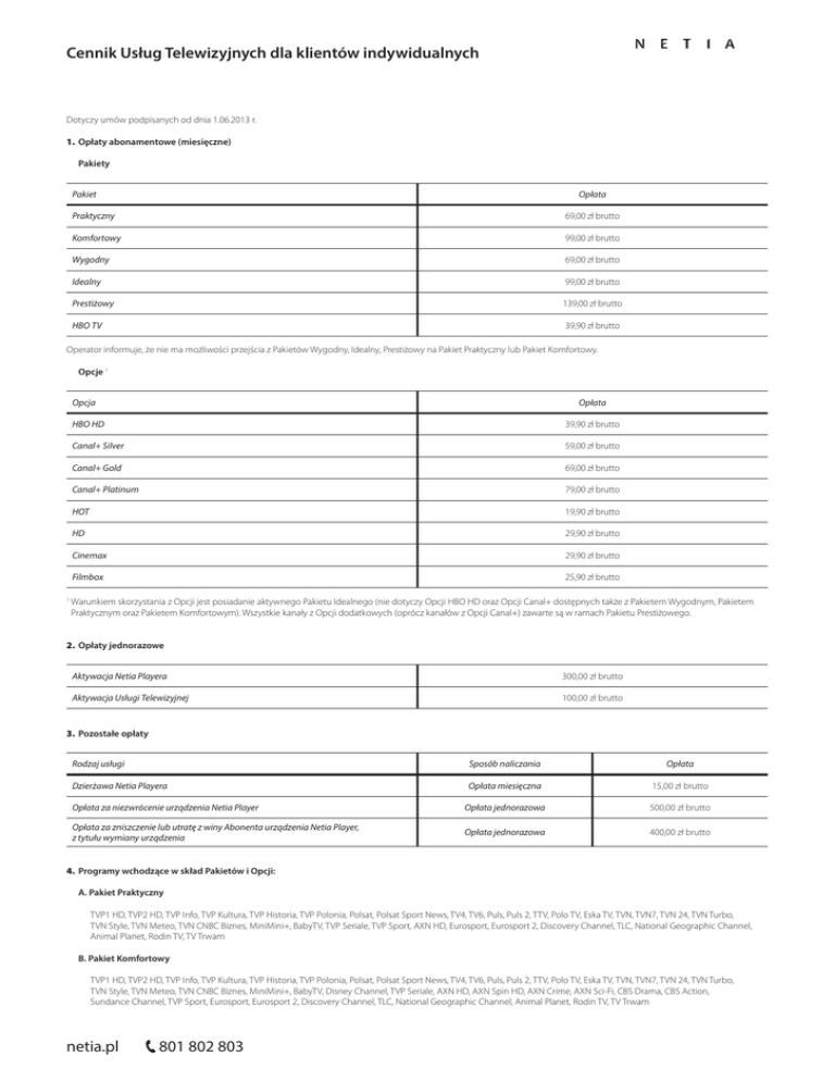 Cennik Usług Telewizyjnych dla klientów indywidualnych Dotyczy umów podpisanych od dnia 1.06.2013 r. 1. Opłaty abonamentowe (miesięczne) Pakiety Pakiet Opłata Praktyczny 69,00 zł brutto Komfortowy 99,00 zł brutto Wygodny 69,00 zł brutto Idealny 99,00 zł brutto Prestiżowy 139,00 zł brutto HBO TV 39,90 zł brutto Operator informuje, że nie ma możliwości przejścia z Pakietów Wygodny, Idealny, Prestiżowy na Pakiet Praktyczny lub Pakiet Komfortowy. Opcje 1 Opcja 1 Opłata HBO HD 39,90 zł brutto Canal+ Silver 59,00 zł brutto Canal+ Gold 69,00 zł brutto Canal+ Platinum 79,00 zł brutto HOT 19,90 zł brutto HD 29,90 zł brutto Cinemax 29,90 zł brutto Filmbox 25,90 zł brutto Warunkiem skorzystania z Opcji jest posiadanie aktywnego Pakietu Idealnego (nie dotyczy Opcji HBO HD oraz Opcji Canal+ dostępnych także z Pakietem Wygodnym, Pakietem Praktycznym oraz Pakietem Komfortowym). Wszystkie kanały z Opcji dodatkowych (oprócz kanałów z Opcji Canal+) zawarte są w ramach Pakietu Prestiżowego. 2. Opłaty jednorazowe Aktywacja Netia Playera 300,00 zł brutto Aktywacja Usługi Telewizyjnej 100,00 zł brutto 3. Pozostałe opłaty Rodzaj usługi Sposób naliczania Opłata Dzierżawa Netia Playera Opłata miesięczna 15,00 zł brutto Opłata za niezwrócenie urządzenia Netia Player Opłata jednorazowa 500,00 zł brutto Opłata za zniszczenie lub utratę z winy Abonenta urządzenia Netia Player, z tytułu wymiany urządzenia Opłata jednorazowa 400,00 zł brutto 4. Programy wchodzące w skład Pakietów i Opcji: A. Pakiet Praktyczny TVP1 HD, TVP2 HD, TVP Info, TVP Kultura, TVP Historia, TVP Polonia, Polsat, Polsat Sport News, TV4, TV6, Puls, Puls 2, TTV, Polo TV, Eska TV, TVN, TVN7, TVN 24, TVN Turbo, TVN Style, TVN Meteo, TVN CNBC Biznes, MiniMini+, BabyTV, TVP Seriale, TVP Sport, AXN HD, Eurosport, Eurosport 2, Discovery Channel, TLC, National Geographic Channel, Animal Planet, Rodin TV, TV Trwam B. Pakiet Komfortowy TVP1 HD, TVP2 HD, TVP Info, TVP Kultura, TVP Historia, TVP Polonia, Polsat, Polsat Sport News, TV4, TV6, Puls, Puls 2, TTV, Polo TV, Eska TV, TVN, TVN7, TVN 24, TVN Turbo, TVN Style, TVN Meteo, TVN CNBC Biznes, MiniMini+, BabyTV, Disney Channel, TVP Seriale, AXN HD, AXN Spin HD, AXN Crime, AXN Sci-Fi, CBS Drama, CBS Action, Sundance Channel, TVP Sport, Eurosport, Eurosport 2, Discovery Channel, TLC, National Geographic Channel, Animal Planet, Rodin TV, TV Trwam netia.pl 801 802 803 Cennik Usługi Telewizyjnej C. Pakiet Wygodny TVP1, TVP1 HD, TVP2, TVP2 HD, TVP Info, TVN, Polsat, TV4, TV 6, TV Puls, TVN Siedem, TVN 24, TVN Meteo, TVN Style, TVN Turbo, TVN CNBC Biznes, Polsat 2, TVP Polonia, TVP Kultura, TVP Historia, Eska TV, Polo TV, Mango 24, TTV D. Pakiet Idealny TVP1, TVP1 HD, TVP2, TVP2 HD, TVP Info, TVN, Polsat, TV4, TV 6, TV Puls, TVN Siedem, TVN 24, TVN Meteo, TVN Style, TVN Turbo, TVN CNBC Biznes, Polsat 2, TVP Polonia, TVP Kultura, TVP Historia, Eska TV, Polo TV, Mango 24, TV.DISCO, MTV Polska, MTV Rocks, Viva Polska, 4fun.tv, RBL.TV, TVS, Tele 5, Polonia 1, TV Biznes, iTV, TV Trwam, TVR, Edusat, CNN, France 24 Ang, France 24 Fra, MiniMini+, Disney Channel, Disney XD, Baby.tv, BBC CBeebies, Cartoon Network, Boomerang, Nickelodeon Polska, Eurosport, Eurosport 2, Polsat Sport, Polsat Sport Extra, Polsat Play, Polsat News, Polsat Film, SportKlub, FightKlub, TVP Sport, Extreme Sports, CBS Reality, Animal Planet, Discovery Channel, Discovery Science, Discovery World, ID Investigation Discovery, TLC, National Geographic Channel, BBC World News, BBC Entertainment, BBC Knowledge, BBC Lifestyle, Fashion TV, Polsat Cafe, CBS Drama, CBS Action, CBS Europa, Fox, Universal Channel, 13th Street Universal, SciFi Universal, Comedy Central, TCM, Kino Polska, Filmbox, TVP Seriale, TTV E. Pakiet Prestiżowy TVP1, TVP1 HD, TVP2, TVP2 HD, TVP Info, TVN, Polsat, TV4, TV 6, TV Puls, TVN Siedem, TVN 24, TVN Meteo, TVN Style, TVN Turbo, TVN CNBC Biznes, Polsat 2, TVP Polonia, TVP Kultura, TVP Historia, Eska TV, Polo TV, Mango 24, TV.DISCO, MTV Polska, MTV Rocks, Viva Polska, 4fun.tv, RBL.TV, TVS, Tele 5, Polonia 1, TV Biznes, iTV, TV Trwam, TVR, Edusat, CNN, France 24 Ang, France 24 Fra, MiniMini+, Disney Channel, Disney XD, Baby.tv, BBC CBeebies, Cartoon Network, Boomerang, Nickelodeon Polska, Eurosport, Eurosport 2, Polsat Sport, Polsat Sport HD, Polsat Sport Extra, Polsat Play, Polsat News, Polsat Film, SportKlub, FightKlub, TVP Sport, Extreme Sports, CBS Reality, Animal Planet, Discovery Channel, Discovery Science, Discovery World, ID Investigation Discovery, TLC, National Geographic Channel, BBC World News, BBC Entertainment, BBC Knowledge, BBC Lifestyle, Fashion TV, Polsat Cafe, CBS Drama, CBS Action, CBS Europa, Fox, Universal Channel, 13th Street Universal, SciFi Universal, Comedy Central, TCM, Kino Polska, Filmbox, TVP Seriale, HBO, HBO 2, HBO Comedy, HBO HD, HBO 2 HD, HBO Comedy HD, Daring!TV, Blue Hustler, Hustler TV, The Player Channel, TVP HD, MTV Live HD, National Geographic Channel HD, Discovery Channel HD, Eurosport HD, Eurosport 2 HD, Fox HD, Cinemax, Cinemax 2, Fimbox Family, Filmbox Extra, Filmbox HD, TTV F. Pakiet HBO TV HBO HD, HBO 2 HD, HBO Comedy HD G. Opcja HBO HD HBO, HBO 2, HBO Comedy, HBO HD, HBO 2 HD, HBO Comedy HD (kanały HBO, HBO 2 oraz HBO Comedy dostępne są tylko w technologii IPTV) H. Canal+ Silver Canal+ Family HD, Canal+ Family 2 HD I. Opcja Canal+ Gold Canal+ Family HD, Canal+ Family 2 HD, Canal+ Film HD, Canal+ Film 2 HD J. Opcja Canal+ Platinum Canal+ Family HD, Canal+ Family 2 HD, Canal+ Film HD, Canal+ Film 2 HD, Canal+ Sport HD, Canal+ K. Opcja HOT Daring!TV, Blue Hustler, Hustler TV, The Player Channel L. Opcja HD TVP HD, MTV Live HD, National Geographic Channel HD, Discovery Channel HD, Eurosport HD, Eurosport 2 HD, Fox HD, Polsat Sport HD Ł. Opcja Cinemax Cinemax, Cinemax 2 M. Opcja Filmbox Fimbox Family, Filmbox Extra, Filmbox HD Operator informuje, iż programy telewizyjne pod nazwami: „TVN”, „TV Puls”, „Polsat”, „TV