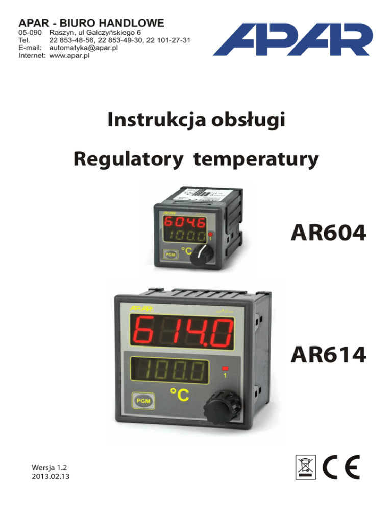 APAR - BIURO HANDLOWE 05-090 Tel. E-mail: Internet: Raszyn, ul Gałczyńskiego 6 22 853-48-56, 22 853-49-30, 22 101-27-31 [email protected] www.apar.pl Instrukcja obsługi Regulatory temperatury AR604 AR614 Wersja 1.2 2013.02.13 Dziękujemy za wybór naszego produktu. Niniejsza instrukcja ułatwi Państwu prawidłową obsługę i bezpieczne użytkowanie regulatora. Przed montażem i uruchomieniem prosimy o przeczytanie i zrozumienie niniejszej instrukcji. W przypadku dodatkowych pytań prosimy o kontakt z doradcą technicznym. SPIS TREŚCI 1. ZASADY BEZPIECZEŃSTWA ........................................................................ 3 2. ZALECENIA MONTAŻOWE ............................................................................3 3. OGÓLNA CHARAKTERYSTYKA REGULATORÓW .................................... 3 4. DANE TECHNICZNE ...................................................................................... 4 5. WAŻNE UWAGI EKSPLOATACYJNE............................................................ 4 6. WYMIARY OBUDÓW I DANE MONTAŻOWE ............................................ 5 7. OPIS LISTWY ZACISKOWEJ I POŁĄCZEŃ ELEKTRYCZNYCH ............. 5 8. FUNKCJE PRZYCISKU, WYŚWIETLACZY I DIODY ŚWIECĄCEJ .......... 5 9. PODGLĄD I ZMIANA WARTOŚCI ZADANEJ ............................................. 6 10. PROGRAMOWANIE PARAMETRÓW KONFIGURACJI ............................... 6 11. LISTA KOMUNIKATÓW I BŁĘDÓW ............................................................. 7 12. RODZAJE CHARAKTERYSTYK ON-OFF..................................................... 7 13. REGULACJA PID..............................................................................................7 14. AUTOTUNING PID........................................................................................... 8 15. RĘCZNY DOBÓR PARAMETRÓW PID.........................................................8 16. KOREKTA PARAMETRÓW PID..................................................................... 8 -2- 1. ZASADY BEZPIECZEŃSTWA ! n przed rozpoczęciem użytkowania urządzenia należy dokładnie przeczytać niniejszą instrukcję, n w celu uniknięcia uszkodzenia urządzenia, przed włączeniem zasilania należy upewnić się, że wszystkie przewody zostały podłączone prawidłowo, n zapewnić właściwe warunki pracy, zgodne ze specyfikacją urządzenia (napięcie zasilania, wilgotność, temperatura), n w celu uniknięcia porażenia prądem elektrycznym, przed dokonaniem wszelkich modyfikacji przyłączeń przewodów należy wyłączyć napięcia doprowadzone do urządzenia. 2. ZALECENIA MONTAŻOWE ! Przyrząd został zaprojektowany tak, aby zapewnić odpowiedni poziom odporności na większość zaburzeń, które mogą wystąpić w środowisku przemysłowym. W środowiskach o nieznanym poziomie zakłóceń zaleca się stosowanie następujących środków zapobiegających ewentualnemu zakłócaniu pracy przyrządu: n nie zasilać urządzenia z tych samych linii co urządzenia wysokiej mocy bez odpowiednich filtrów sieciowych, n stosować ekranowanie przewodów zasilających, czujnikowych i sygnałowych, przy czym uziemienie ekranu powinno być jednostronne wykonane jak najbliżej przyrządu, n unikać prowadzenia przewodów pomiarowych (sygnałowych) w bezpośrednim sąsiedztwie i równolegle do przewodów energetycznych i zasilających, n wskazane jest skręcanie parami przewodów sygnałowych, n dla czujników oporowych w połączeniu 3-przewodowym stosować jednakowe przewody, n unikać bliskości urządzeń zdalnie sterowanych, mierników elektromagnetycznych, obciążeń wysokiej mocy, obciążeń z fazową lub grupową regulacją mocy oraz innych urządzeń wytwarzających duże zakłócenia impulsowe. 3 . OGÓLNA CHARAKTERYSTYKA REGULATORÓW n uniwersalne wejście termorezystancyjne Pt100 i termoparowe J, K, S n obudowy tablicowe IP50 od czoła, IP20 od strony złącz n przeznaczony do regulacji stałowartościowej n 1 wyjście regulacyjne przekaźnikowe lub SSR o charakterystykach: ON-OFF z histerezą, PID, AUTOTUNING PID n dwuwierszowy odczyt cyfrowy LED z regulacją jasności świecenia : wyświetlacz GÓRNY - wartość mierzona, DOLNY - wartość zadana n sygnalizacja diodą świecącą stanu przekaźnika n dostęp do parametrów konfiguracyjnych chroniony hasłem n programowanie z klawiatury foliowej 1-przyciskowej i pokrętłem (enkoderem) n możliwość zablokowania zmian wartości zadanych n programowa filtracja cyfrowa n wysoka dokładność i odporność na zakłócenia występujące w środowisku przemysłowym -3- 4. DANE TECHNICZNE Uniwersalne wejście (wybór z klawiatury), zakres wskazań i regulacji: - Pt100 (3- lub 2-przewodowe) ........ -100 ÷ 850 °C (firmowe ustawienie wejścia) - termopara J .................................... 0 ÷ 800 °C - termopara K ................................... 0 ÷ 1200 °C - termopara S ................................... 0 ÷ 1600 °C - elektroniczna kompensacja temperatury zimnych końców termopar Rezystancja doprowadzeń dla Pt100... Rd < 30 W (3-przewodowo, dla każdej linii) A Prąd wejścia Pt100................................ ~250 m Odczyt cyfrowy .................................... 2 x 4 cyfry LED - zakres wskazań ............................. -999÷9999 - rozdzielczość wskazań................... 0,1°C lub 1°C - górny wyświetlacz (czerwony) ....... 20 mm (AR614), 7mm (AR604) - dolny wyświetlacz (zielony) ........... 14 mm (AR614), 7mm (AR604) Dokładność: - Pt100 ..............................................0,2 % zakresu pomiarowego ±1 cyfra - termopary ...................................... 0,3 % zakresu pomiarowego ±1 cyfra - wejścia termoparowe dodatkowo ... ±2°C (temperatura zimnych końców) Czas odpowiedzi................................... 0,5 ÷ 2 s (programowalny parametrem 2: F i L t ) Wyjście przekaźnikowe (P1) - dla obciążeń rezystancyjnych ........ 8A / 250V~ - dla obciążeń indukcyjnych ...