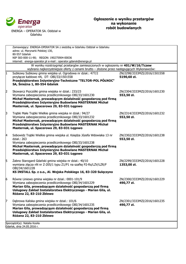 ENERGA – OPERATOR SA. Oddział w Gdańsku Ogłoszenie o wyniku przetargów na wykonanie robót budowlanych Zamawiający: ENERGA-OPERATOR SA z siedzibą w Gdańsku Oddział w Gdańsku adres: ul. Marynarki Polskiej 130, 80-557 Gdańsk NIP 583-000-11-90; REGON: 190275904-00036 internet: energa-operator.pl e-mail : [email protected] 1 W wyniku rozstrzygnięć przetargów zamieszczonych w ogłoszeniu nr 401/W/16/Tczew wybrano najkorzystniejsze oferty z cenami brutto – złożone przez następujących Wykonawców: Subkowy Subkowy gmina wiejska ul. Ogrodowa nr dział.: 477/2 ZN/2298/3333MZI/2016/1501558 przyłącze kablowe nN, DT- OBI/33/1501558 5190,60 zł. Przedsiębiorstwo Inżynieryjno-Techniczne "TELTOR-POL PÓŁNOC" SA, Śnieżna 1, 80-554 Gdańsk 2 Skowarcz Pszczółki gmina wiejska nr dział.: 233/23 Wymiana zabezpieczenia przedlicznikowego OBI/33/1601230 Michał Masternak, prowadzącym działalność gospodarczą pod firmą Przedsiębiorstwo Inżynieryjno Budowlane MASTERNAK Michał Masternak, ul. Spacerowa 29, 83-031 Łęgowo ZN/2304/3333MZI/2016/1601230 553,50 zł. 3 Trąbki Małe Trąbki Wielkie gmina wiejska nr dział.: 94/27 Wymiana zabezpieczenia przedlicznikowego OBI/33/1601232 Michał Masternak, prowadzącym działalność gospodarczą pod firmą Przedsiębiorstwo Inżynieryjno Budowlane MASTERNAK Michał Masternak, ul. Spacerowa 29, 83-031 Łęgowo ZN/2314/3333MZI/2016/1601232 553,50 zł. 4 Sobowidz Trąbki Wielkie gmina wiejska ul. Księdza Józefa Wdowiaka 13 nr dział.: 263 Wymiana zabezpieczenia przedlicznikowego OBI/33/1601238 Michał Masternak, prowadzącym działalność gospodarczą pod firmą Przedsiębiorstwo Inżynieryjno Budowlane MASTERNAK Michał Masternak, ul. Spacerowa 29, 83-031 Łęgowo ZN/2302/3333MZI/2016/1601238 553,50 zł. 5 Żabno Starogard Gdański gmina wiejska nr dział.: 40/10 wymiana złącza nN nr Z-205/1 typu Z1/P1 na szafkę P2-Rs/LZV/LZR/F OBI/34/1601228 KS INSTALL Sp. z o.o., Al. Wojska Polskiego 16, 83-320 Sulęczyno ZN/2299/3333MZI/2016/1601228 1353,00 zł. 6 Równe Liniewo gmina wiejska nr dział.: 0001-101/9 Wymiana zabezpieczenia przedlicznikowego OBI/34/1601229 Marian Gila, prowadzącąym działalność gospodarczą pod firmą Usługowy Zakład Instalatorstwa Elektrycznego - Marian Gila, ul. Różana 22, 83-210 Zblewo ZN/2300/3333MZI/2016/1601229 490,77 zł. 7 Dąbrowa Kaliska gmina wiejska nr dział.: 101/6 Wymiana zabezpieczenia przedlicznikowego OBI/34/1601235 Marian Gila, prowadzącąym działalność gospodarczą pod firmą Usługowy Zakład Instalatorstwa Elektrycznego - Marian Gila, ul. Różana 22, 83-210 Zblewo ZN/2301/3333MZI/2016/1601235 490,77 zł. Sporządził(a): Natalia Kosiła Gdańsk, dnia 24.05.2016 r. ENERGA – OPERATOR SA. Oddział w Gdańsku Ogłoszenie o wyniku przetargów na wykonanie robót budowlanych ......................................................................... / podpis /