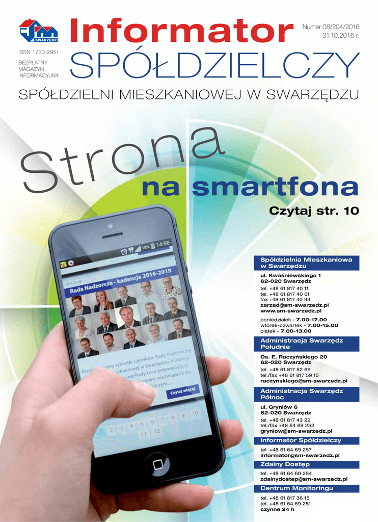 issn 1730-2951 BEzpłATnY MAGAzYn infORMAcYJnY informator numer 08/204/2016 31.10.2016 r. spółDziELczY spółDziELni MiEszKAniOWEJ W sWARzęDzU S a n o tr na smartfona czytaj str. 10 spółdzielnia mieszkaniowa w swarzędzu ul. kwaśniewskiego 1 62-020 swarzędz tel. +48 61 817 40 11 tel. +48 61 817 40 61 fax +48 61 817 40 93 [email protected] www.sm-swarzedz.pl poniedziałek – 7.00-17.00 wtorek-czwartek – 7.00-15.00 piątek – 7.00-13.00 administracja swarzędz południe os. e. raczyńskiego 20 62-020 swarzędz tel. +48 61 817 52 69 tel./fax +48 61 817 59 15 [email protected] administracja swarzędz północ ul. gryniów 6 62-020 swarzędz tel. +48 61 817 43 22 tel./fax +48 64 69 252 [email protected] informator spółdzielczy tel. +48 61 64 69 257 [email protected] Zdalny dostęp tel. +48 61 64 69 254 [email protected] centrum monitoringu tel. +48 61 817 36 15 tel. +48 61 64 69 251 czynne 24 h infORMATOR spółDziELczY BezpłaTne Szczepienia prZeciw grypie 50+ Ruszyła kolejna edycja bezpłatnych szczepień przeciwko grypie dla osób zameldowanych na terenie Powiatu Poznańskiego. Program polityki zdrowotnej finansowany ze środków budżetowych Powiatu Poznańskiego skierowany jest do osób w wieku od 50 roku życia (tj. urodzonych nie później niż 31 grudnia 1966 r.), zameldowanych na terenie powiatu poznańskiego. Szczepienia realizowane są w 17 przychodniach na terenie gmin powiatu poznańskiego. Program będzie trwał do końca grudnia 2016 r. lub do wyczerpania przewidzianego limitu szczepionek. Wykaz przychodni wykonujących szczepienia w miejscowościach, w których znajdują się spółdzielcze nieruchomości: GMINA SWARZĘDZ Zespół Przychodni Lekarza Rodzinnego „DIAGTER” Sp. z o.o. ul. Piaski 8, 62-020 Swarzędz tel. 61 817 25 33 GMINA CZERWONAK Zespół Lekarza Rodzinnego „PRO FAMILIA” ul. Działkowa 2, 62-004 Czerwonak tel. 61 812 04 00 GMINA KOSTRZYN Przychodnia Zespołu Lekarza Rodzinnego „SANUS” S.C. ul. Braci Drzewieckich 1, 62-025 Kostrzyn tel. 61 817 89 99 GMINA KÓRNIK Przychodnia Lekarzy Rodzinnych „ZDROWIE” S.C. ul. Poznańska 34 A, 62-035 Kórnik tel. 61 817 00 43 GMINA LUBOŃ Przychodnia Lekarza Rodzinnego Luboń Żabikowo S.C. ul. Poniatowskiego 20, 62-030 Luboń tel. 61 810 48 31 zmiana TraSy autobusu 55! Informujemy, że w związku z otwarciem centrum handlowego „Posnania”, zmianie uległa trasa autobusu linii numer 55, łączącego Zalasewo z Rondem Rataje. Korekta dotyczy poznańskiego odcinka trasy, właśnie w pobliżu galerii. Obecnie autobus omija ulicę Piłsudskiego, porusza się zaś ulicą Pleszewską, Brneńską i Milczańską, aby zakończyć trasę tam gdzie dotychczas, czyli na dworcu autobusowym Rondo Rataje. Co ważne, nie została (na razie?) wprowadzona zmiana na linii 57, co utrudniłoby życie mieszkańcom Antoninka. We wstępnych założeniach, autobusy tej linii z ulicy Dymka miały skręcać w lewo w ulicę Szwajcarską (w kierunku os. Rusa), aby objeżdżając os. Zodiak poprzez ulicę Chartowo wrócić do ulicy Baraniaka. Przypomnijmy, że obecnie 57 poruszając się ulicą Dymka skręca w prawo, gdzie bezpośrednio kontynuuje jazdę ulicą Baraniaka. Tak więc planowano dołożyć dodatkowe „kółeczko”. A przecież i tak w godzinach szczytu rozkład jazdy swoje, a 57 „swoje”. Spóźnienia 10 minut to norma. Na szczęście ktoś się opamiętał, wziął pod uwagę negatywną opinię Rady Osiedla i zmiana ostatecznie nie została wprowadzona. R.O. Informator Spółdzielczy Spółdzielni Mieszkaniowej w Swarzędzu Fot. okładka – Mateusz Leimann Redaguje zespół w składzie: Joanna Całka, Piotr Cichewicz, Julia Borkowska-Kulczak, Robert Olejnik, Piotr Osiewicz, Paweł Pawłowski, Jakub Roszkowski. Opracowanie graficzne: Studio 33 – Witold Adamski tel. +48 602 35 72 82 www.s33.pl 2 Druk: Drukarnia Swarzędzka Stanisław i Marcin Witecki tel. +48 61 651 57 02 Nakład: 6300 szt. Redakcja: ul. Kwaśniewskiego 1 62-020 Swarzędz pokój 202 tel. +48 61 64 69 257 [email protected] informator spółdzielczy Termomodernizacje 2017 – spis budynków budynków. Przyszłoroczna lista jest nieco mniejsza niż realizowane do tej pory (10-13 bloków) ze względu na zmniejszoną pulę środków. Zakres rzeczowy planu dociepleń budynków na 2017 r. został zatwierdzony przez Radę Nadzorczą Spółdzielni na posiedzeniu w dniu 20 października 2016 r. Fot. arch. JC Budynki, które będą docieplane w 2017 r.: Fot. os. Dąbrowszczaków, 2010 r. Jak co roku, zamieszczamy listę bloków, przy których za kilka miesięcy staną rusztowania i rozpoczną się prace związane z docieplaniem oraz ogólną modernizacją Mieszkaniec pyta ? Zasada najstarszych budynków Spółdzielnia przeprowadza prace termomodernizacyjne zgodnie z zasadą docieplania najstarszych budynków. Dlaczego więc remontuje się bloki na osiedlach południowych, skoro bloki na os. Dąbrowszczaków, Czwartaków i Kościuszkowców były budowane wcześniej? Odpowiedź SM: Zasada najstarszych budynków dotyczy poszczególnych lokalizacji. Już w 2009 r., kiedy ustalane były szacunkowe listy na kilkanaście lat do przodu, pisaliśmy na łamach grudniowego Informatora: „…Docieplane będą budynki zarówno z nieruchomości swarzędzkich, jak i lokalizacji pozaswarzędzkich. Kolejność docieplanych bloków, ustalana była zgodnie z zasadą, że w każdej lokalizacji docieplane będą bloki najstarsze, które były budowane jako pierwsze.” Termomodernizacja dotyczy więc budynków najstarszych na os. Dąbrowszczaków, Czwartaków, Kościuszkowców, ul. Gryniów, jak i os. Cegielskiego, Raczyńskiego oraz lokalizacji w innych miejscowościach. Dodatkowym czynnikiem mającym wpływ na wybór budynków docieplanych mają też wskaźniki zużycia ciepła – w pierwszej kolejności § Kórnik-Bnin, ul. Śremska nr 32 § Swarzędz, os. H. Cegielskiego nr 5 § Swarzędz, os. E. Raczyńskiego nr 21, 22 § Swarzędz, os. Dąbrowszczaków nr 20 § 