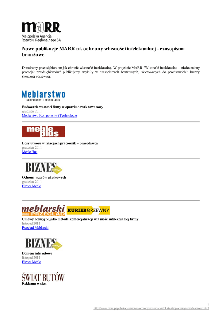 Nowe publikacje MARR nt. ochrony własności intelektualnej - czasopisma branżowe Doradzamy przedsiębiorcom jak chronić własność intelektualną. W projekcie MARR "Własność intelektualna – niedoceniony potencjał przedsiębiorców" publikujemy artykuły w czasopismach branżowych, skierowanych do przedstawicieli branży skórzanej i drzewnej. Budowanie wartości firmy w oparciu o znak towarowy grudzień 2011 Meblarstwo Komponenty i Technologie Losy utworu w relacjach pracownik – pracodawca grudzień 2011 Meble Plus Ochrona wzorów użytkowych grudzień 2011 Biznes Meble Umowy licencyjne jako metoda komercjalizacji własności intelektualnej firmy listopad 2011 Przegląd Meblarski Domeny internetowe listopad 2011 Biznes Meble Reklama w sieci 1 http://www.marr.pl/publikacje-marr-nt-ochrony-wlasnosci-intelektualnej---czasopisma-branzowe.html listopad 2011 Świat Butów Piractwo w zakresie wzornictwa przemysłowego listopad 2011 Meblarstwo Komponenty i Technologie Zakres ochrony celnej praw własności intelektualnej listopad 2011 Meble Plus Jak chronić własność intelektualną w branży skórzanej – najczęstsze problemy importera i eksportera listopad 2011 Domeny internetowe w firmie jako narzędzie marketingu i reklamy październik 2011 Budowanie wartości firmy w oparciu o znak towarowy październik 2011 Świat Butów Piractwo w zakresie wzornictwa przemysłowego październik 2011 Meble Plus Odpowiedzialność prawna z tytułu kopiowania październik 2011 Meblarstwo Komponenty i Technologie Ochrona baz danych październik 2011 BIZNES meble.pl 2 http://www.marr.pl/publikacje-marr-nt-ochrony-wlasnosci-intelektualnej---czasopisma-branzowe.html Losy utworu w relacjach pracownik - pracodawca, zleceniobiorca - zleceniodawca październik 2011 Przegląd Meblarski Piractwo w zakresie wzornictwa przemysłowego wrzesień 2011 Meble Plus Piractwo w zakresie wzornictwa przemysłowego wrzesień 2011 Ochrona użytkowych rozwiązań w branży meblarskiej wrzesień 2011 Meblarstwo Komponenty i Technologie Nowatorskie rozwiązania i ich ochrona wrzesień 2011 Świat Butów Projektant i jego prawa wrzesień 2011 Przegląd Meblarski Ile jest warta Twoja firma? sierpień/wrzesień 2011 BIZNES meble.pl Reklama w sieci lipiec/sierpień 2011 Przegląd Meblarski Projektant i jego prawa lipiec/sierpień 2011 3 http://www.marr.pl/publikacje-marr-nt-ochrony-wlasnosci-intelektualnej---czasopisma-branzowe.html Rodzaje umów licencyjnych sierpień 2011 Świat Butów Atrakcyjne wzornictwo kluczem do sukcesu sierpień 2011 Meble Plus Jak chronić własność intelektualną w branży skórzanej? czerwiec/lipiec 2011 Świat Butów Ochrona użytkowych rozwiązań w branży meblarskiej czerwiec/lipiec 2011 Meble Plus Jak chronić swe interesy? czerwiec 2011 Przegląd Meblarski Zakres ochrony celnejpraw własności intelektualnej czerwiec 2011 Odpowiedzialność prawna z tytułu kopiowania maj 2011 Więcej publikacji na stronie projektu MARR Tekst pochodzi ze strony internetowej Małopolskiej Agencji Rozwoju Regionalnego: www.marr.pl Wykorzystanie m ateriałów zam ieszczonych na stronie www.m arr.pl jest dopuszczalne wyłącznie na zasadach określonych w Ustawie o prawie autorskim i prawach pokrewnych, w zakresie odpowiadającym własnem u użytkowi osobistem u oraz dozwolonem u użytkowi publicznem u. W celu uzyskania zgody na korzystanie z m ateriałów udostępnionych na stronie www.m arr.pl, prosim y o kontakt e-m ailowy: m arketing@m arr.pl. 4 http://www.marr.pl/publikacje-marr-nt-ochrony-wlasnosci-intelektualnej---czasopisma-branzowe.html