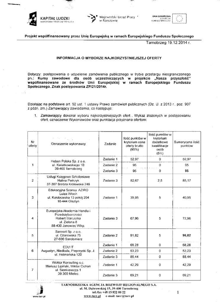 KAPITAŁ LUDZKI N A R O D O W A S l F . A T F u A SPOiF-.GSC i W o j e w ó d z k i Urząd Pracy jt 1 w Rzeszowie UNW€U E "S5^S5 FUNDUSZ SPOŁECZNY Projekt współfinansowany przez Unię Europejską w ramach Europejskiego Funduszu Społecznego Tarnobrzeg 19.12.2014 r. INFORMACJA O WYBORZE NAJKORZYSTNIEJSZEJ OFERTY Dotyczy: p o s t ę p o w a n i a o u d z i e l e n i e z a m ó w i e n i a p u b l i c z n e g o w trybie p r z e t a r g u n i e o g r a n i c z o n e g o pn.: Kursy zawodowe dla osób uczestniczących w projekcie „Nasza przyszłość" wspófinansowane ze środków Unii Europejskiej w ramach Europejskiego Funduszu Społecznego. Znak postępowania ZP/21/2014r. Działając n a p o d s t a w i e art 92 ust. 1 u s t a w y P r a w o z a m ó w i e ń p u b l i c z n y c h ( D z . U . z 2 0 1 3 r, p o z 9 0 7 z późn. zm.) Zamawiający z a w i a d a m i a , c o następuje: 1. Z a m a w i a j ą c y d o k o n a ł w y b o r u n a j k o r z y s t n i e j s z y c h ofert . W y k a z z ł o ż o n y c h w ofert, o z n a c z e n i e W y k o n a w c ó w o r a z p u n k t a c j a p r z y z n a n a o f e r t o m : postępowaniu Ilość punktów w kryterium dodatkowe Sumaryczna ilość kwalifikacje punktów osób (5%) Zadanie Ilość punktów w kryterium cena oferty brutto (95%) Zadanie 1 52,97 0 52,97 Zadanie 2 95 0 95 Zadanie 3 95 0 95 Zadanie 3 82,67 2,5 85,17 Zadanie 1 35,95 5 40,95 4 Europejska Akademia Handlu i Przedsiębiorczości Robert Staruszka ul. Zielona 8 88-430 Janowiec Wlkp. Zadanie 3 67,96 5 72,96 5 Sannort Sp. z o.o. ul. Ożarowska 75 27-600 Sandomierz Zadanie 2 91,82 5 96,82 Zadanie 1 68,28 0 68,28 6 E D U IT Augustyn, Niedbała, Pieprzycki S p . J . ul. Hetmańska 120 Zadanie 2 53,23 0 53,23 Zadanie 3 88,44 0 88,44 Zadanie 1 42,29 0 42,29 Zadanie 3 69,21 0 69,21 Nr oferty Oznaczenie wykonawcy 1 Heben Polska Sp. z o.o. ul. Kwiatkowskiego 1B 39-400 Tarnobrzeg Usługi Księgowo Szkoleniowe Halina Pietrzyk 37-307 Brzoza Królewska 246 2 Edukacyjna S z a n s a A Z I R O Luiza Włoch ul. Kołobrzeska 13 pokój 204 10-444 Olsztyn 3 7 jl www.tarr.pl Wektor Konsulting s.c. Mariusz Lipiński, Wiktor Cichoń ul. Sienkiewicza 1 39-300 Mielec TARNOBRZESKA AGENCJA ROZWOJU REGIONALNEGO S.A. ul. IM. Dąbrowskiej 15, 39-400 Tarnobrzeg tel./fax+48 15 822 00 22 www.tarr.pl e-mail: [email protected] 1 f w KAPITAŁ LUDZKI N A R O D O W A STRATEGIA SPÓJNOŚCI •^k y W o j e w ó d z k i Urząd Pracy w Rzeszowie UNIA EUROPEJSKA EUROPEJSKI F U N D U S Z SPOŁECZNY Projekt współfinansowany przez Unię Europejską w ramach Europejskiego Funduszu Społecznego O.K. Ośrodek Kursów Edmund Kwidzyński ul. Judyckiego 11 84-200 Wejherowo 8 2. Zadanie 1 95 Z a m a w i a j ą c y u z n a ł z a najkorzystniejszą ofertę W y k o n a w c y : Zadanie 1: O.K. Ośrodek Kursów Edmund Kwidzyński u l . Judyckiego 11 84-200 Wejherowo która u z y s k a ł a n a j w y ż s z ą ilość punktów. C e n a w y k o n a n i a p r z e d m i o t u z a m ó w i e n i a w y n o s i : 2.760,00zł. Zadanie 2: Sannort Sp. z o.o. ul. Ożarowska 75 27-600 Sandomierz która u z y s k a ł a n a j w y ż s z ą ilość punktów. C e n a w y k o n a n i a p r z e d m i o t u z a m ó w i e n i a w y n o s i : 3.104,00zł. Zadanie 3: Heben Polska Sp. z o.o. ul. Kwiatkowskiego 1B 39-400 Tarnobrzeg która u z y s k a ł a n a j w y ż s z ą ilość p u n k t ó w C e n a w y k o n a n i a p r z e d m i o t u z a m ó w i e n i a w y n o s i : 5.100,00zł. TARNOBRZESKA AGENCJA Rozwoju Regionalnego S.A. PńOKURENT . Jr www.tarr.pl TARNOBRZESKA AGENCJA ROZWOJU REGIONALNEGO S.A. ul. M . Dąbrowskiej 15, 39-400 Tarnobrzeg tel./fax+48 15 822 00 22 www.tarr.pl e-mail: [email protected] 0 95