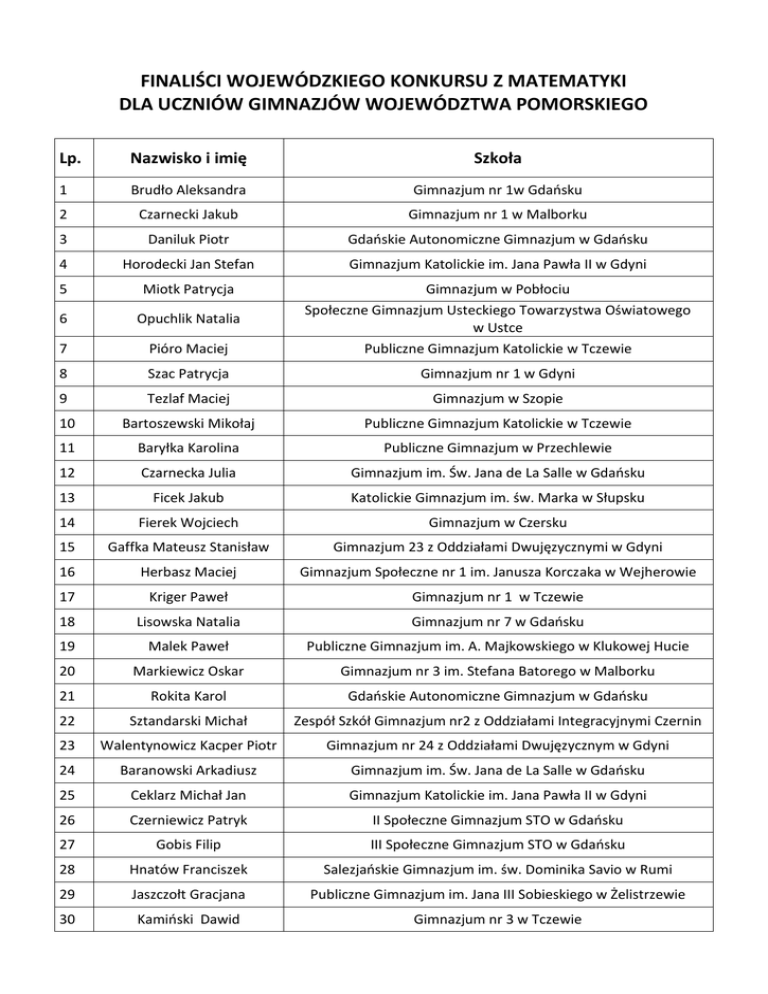 FINALIŚCI WOJEWÓDZKIEGO KONKURSU Z MATEMATYKI DLA UCZNIÓW GIMNAZJÓW WOJEWÓDZTWA POMORSKIEGO Lp. Nazwisko i imię Szkoła 1 Brudło Aleksandra Gimnazjum nr 1w Gdaosku 2 Czarnecki Jakub Gimnazjum nr 1 w Malborku 3 Daniluk Piotr Gdaoskie Autonomiczne Gimnazjum w Gdaosku 4 Horodecki Jan Stefan Gimnazjum Katolickie im. Jana Pawła II w Gdyni 5 Miotk Patrycja 6 Opuchlik Natalia 7 Pióro Maciej Gimnazjum w Pobłociu Społeczne Gimnazjum Usteckiego Towarzystwa Oświatowego w Ustce Publiczne Gimnazjum Katolickie w Tczewie 8 Szac Patrycja Gimnazjum nr 1 w Gdyni 9 Tezlaf Maciej Gimnazjum w Szopie 10 Bartoszewski Mikołaj Publiczne Gimnazjum Katolickie w Tczewie 11 Baryłka Karolina Publiczne Gimnazjum w Przechlewie 12 Czarnecka Julia Gimnazjum im. Św. Jana de La Salle w Gdaosku 13 Ficek Jakub Katolickie Gimnazjum im. św. Marka w Słupsku 14 Fierek Wojciech Gimnazjum w Czersku 15 Gaffka Mateusz Stanisław Gimnazjum 23 z Oddziałami Dwujęzycznymi w Gdyni 16 Herbasz Maciej Gimnazjum Społeczne nr 1 im. Janusza Korczaka w Wejherowie 17 Kriger Paweł Gimnazjum nr 1 w Tczewie 18 Lisowska Natalia Gimnazjum nr 7 w Gdaosku 19 Malek Paweł Publiczne Gimnazjum im. A. Majkowskiego w Klukowej Hucie 20 Markiewicz Oskar Gimnazjum nr 3 im. Stefana Batorego w Malborku 21 Rokita Karol Gdaoskie Autonomiczne Gimnazjum w Gdaosku 22 Sztandarski Michał Zespół Szkół Gimnazjum nr2 z Oddziałami Integracyjnymi Czernin 23 Walentynowicz Kacper Piotr Gimnazjum nr 24 z Oddziałami Dwujęzycznym w Gdyni 24 Baranowski Arkadiusz Gimnazjum im. Św. Jana de La Salle w Gdaosku 25 Ceklarz Michał Jan Gimnazjum Katolickie im. Jana Pawła II w Gdyni 26 Czerniewicz Patryk II Społeczne Gimnazjum STO w Gdaosku 27 Gobis Filip III Społeczne Gimnazjum STO w Gdaosku 28 Hnatów Franciszek Salezjaoskie Gimnazjum im. św. Dominika Savio w Rumi 29 Jaszczołt Gracjana Publiczne Gimnazjum im. Jana III Sobieskiego w Żelistrzewie 30 Kamioski Dawid Gimnazjum nr 3 w Tczewie 31 Kapuścioski Maciej Gimnazjum nr 33 w Gdaosk 32 Kęsicki Mateusz Społeczne Gimnazjum im. Polskich Noblistów w Kwidzynie 33 Klewicki Michał Gimnazjum nr 24 z Oddziałami Dwujęzycznym w Gdyni 34 Klinkosz Jan Katolickie Gimnazjum im. Jana Pawła II w Kartuzach 35 Kuptz Arkadiusz 36 Lewonowska Blanka Publiczne Gimnazjum im. Jana III Sobieskiego w Żelistrzewie Gimnazjum Nr 3 z Oddziałami Dwujęzycznymi im A. Mickiewicza w Słupsku 37 Mejer Pamela Gimnazjum nr 1 im. Jana III Sobieskiego w Malborku 38 Myrcha Jędrzej Gimnazjum nr 2 im. Armii Krajowej w Kwidzynie 39 Pomirski Jan Gimnazjum nr 1 w Gdaosku 40 Rydelek Adam Gdaoskie Autonomiczne Gimnazjum w Gdaosku 41 Sobocioska Hanna Dorota Ekologiczne Gimnazjum Społeczne w Rumi 43 Szymanowicz Stanisław Kacper Tabeau Krzysztof 44 Tomkowicz Michał Ekologiczne Gimnazjum Społeczne w Rumi 45 Turko Kamil Katolickie Gimnazjum im. Jana Pawła II w Kartuzach 46 Budziło Kacper Gdaoskie Autonomiczne Gimnazjum w Gdaosku 47 Janowicz Karol Gimnazjum z Oddziałami Integracyjnymi nr 4 im. Orła Białego w Słupsku 48 Kondek Jędrzej Gimnazjum nr 18 w Gdaosku 49 Kowalewski Piotr Gimnazjum nr 24 z Oddziałami Dwujęzycznym w Gdyni 50 Krauze Robert Gimnazjum im. Jana Pawła II w Dzierzgoniu 51 Kulczyk Paula 52 Lewandowski Piotr Gimnazjum w Czersku Gimnazjum Nr 3 z Oddziałami Dwujęzycznymi im A. Mickiewicza w Słupsku 53 Lisowski Maciej 54 Nurek Bartosz 55 Szymaoska Dominika Gimnazjum nr 1 im. Józefa Wybickiego w Lęborku Gimnazjum z Oddziałami Integracyjnymi nr 2 im. Stefana Żeromskiego w Sopocie Gimnazjum nr 18 w Gdyni 56 Zwara Mateusz Gimnazjum nr 16 w Gdyni 57 Żochowski Marek Gimnazjum nr 24 z Oddziałami Dwujęzycznym w Gdyni 58 Baniecki Hubert Gdaoskie Autonomiczne Gimnazjum w Gdaosku 59 Chaoko Małgorzata Społeczne Gimnazjum Dobrzewino – Karczemki w Karczemkach 60 Cichacka Marta Gimnazjum nr 20 w Gdaosku 61 Górecka Małgorzata Dorota Gimnazjum nr 1 w Gdyni 62 Krawiec Weronika Gimnazjum nr 2 im. Armii Krajowej w Kwidzynie 63 Kropidłowski Adam Gimnazjum z Oddziałami Integracyjnymi Nr 1 w Sopocie 42 Gimnazjum nr 24 z Oddziałami Dwujęzycznym w Gdyni Sopockie Autonomiczne Gimnazjum w Sopocie 64 Kucharski Piotr Gimnazjum nr 16 w Gdaosku 65 Orlicki Grzegorz Gimnazjum nr 2 im. Armii Krajowej w Kwidzynie 66 Ponczek Julia Gdaoskie Autonomiczne Gimnazjum w Gdaosku 67 Przecławska Julia Gimnazjum nr 1 w Gdyni 68 Stolarczyk Klaudia Gimnazjum nr 4 w Gdyni 69 Szostek Michał Piotr Gimnazjum nr 24 z Oddziałami Dwujęzycznym w Gdyni 70 Tomaszewska Iwona Społeczne Gimnazjum nr 1 STO w Słupsku 71 Belter Jakub Gimnazjum nr 7 w Gdaosku 72 Bronowicka Marta Społeczne Gimnazjum im. Polskich Noblistów w Kwidzynie 73 Bryłkowski Marcin Publiczne Katolickie Gimnazjum im. Św. Kazimierza w Gdaosku 74 Charzewski Aleksander Max Społeczne Gimnazjum w Człuchowie 75 Dębicki Mikołaj Prywatne Gimnazjum "AWANS" w Malborku 76 Gawęda Konrad Gimnazjum w Siemianicach 77 Hrycyna Marta Gimnazjum w Mikoszewie 78 Jakubowicz Michał Gimnazjum nr3 im. Stefana Batorego w Malborku 79 Kozerog Michał Gimnazjum we Władysławowie 84-120 80 Marszałkowski Wiktor Piotr Gimnazjum nr 24 z Oddziałami Dwujęzycznym w Gdyni 81 Plichta Julia Anna Publiczne Gimnazjum w Przodkowie 82 Steiner Joshua Gimnazjum nr1 im. Jana Pawła II w Sztumie 83 Tomczyk Alicja Gimnazjum nr 18 w Gdyni 84 Utracka Barbara Sopockie Autonomiczne Gimnazjum w Sopocie 85 Welz Monika I Społeczne Gimnazjum STO w Gdaosku 86 Goczewska Adrianna II Społeczne Gimnazjum STO w Gdaosku 87 Narloch Tomasz Zespół szkół Gimnazjum w Rytlu 88 Roszkowska Julia Wiktoria Gimnazjum Katolickie im. Jana Pawła II w Gdyni 89 Borsuk Adam Zespół Szkół w Rotmance 90 Ciepłuch Monika Gimnazjum nr 3 im. Znaku Rodła w Kwidzynie 91 Klich Hubert Gimnazjum nr 1 im. Józefa Wybickiego w Lęborku 92 Labuda Radosław Zespół Szkół w Gowidlinie 93 Ryduchowski Kamil Gimnazjum w Brusach 94 Wysocki Michał Gimnazjum nr 3 im. Znaku Rodła w Kwidzynie 95 Polejowska Adriana Gimnazjum w Chmielnie Przewodnicząca Woje