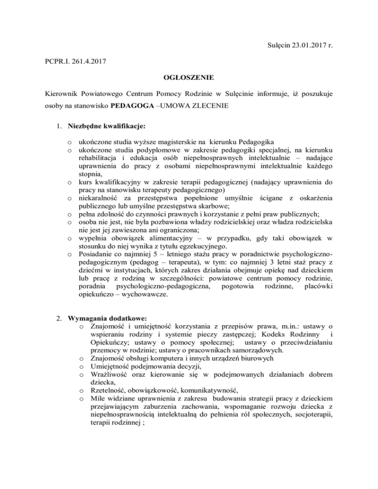 Sulęcin 23.01.2017 r. PCPR.I. 261.4.2017 OGŁOSZENIE Kierownik