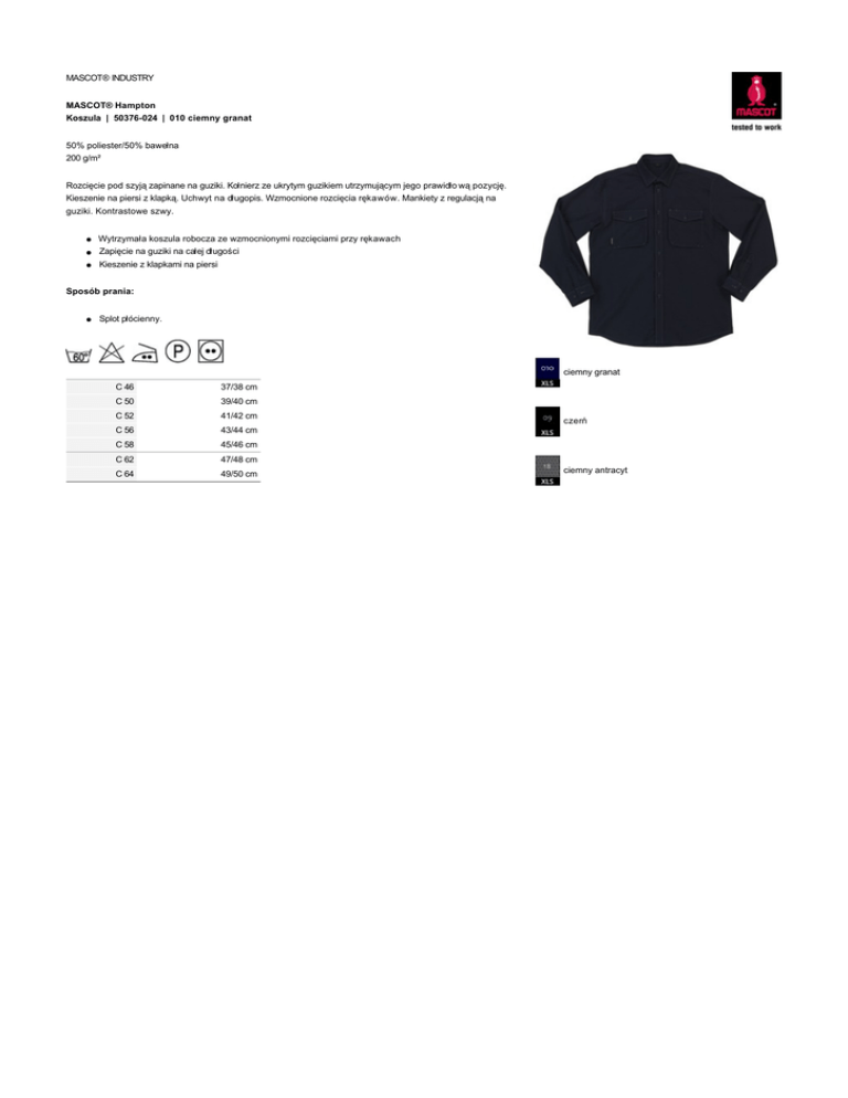 MASCOT® INDUSTRY MASCOT® Hampton Koszula | 50376-024 | 010 ciemny granat 50% poliester/50% bawełna 200 g/m² Rozcięcie pod szyją zapinane na guziki. Kołnierz ze ukrytym guzikiem utrzymującym jego prawidło wą pozycję. Kieszenie na piersi z klapką. Uchwyt na długopis. Wzmocnione rozcięcia rękawów. Mankiety z regulacją na guziki. Kontrastowe szwy. l Wytrzymała koszula robocza ze wzmocnionymi rozcięciami przy rękawach l Zapięcie na guziki na całej długości l Kieszenie z klapkami na piersi Sposób prania: l Splot płócienny. ciemny granat C 46 37/38 cm C 50 39/40 cm C 52 41/42 cm C 56 43/44 cm C 58 45/46 cm C 62 47/48 cm C 64 49/50 cm czerń ciemny antracyt