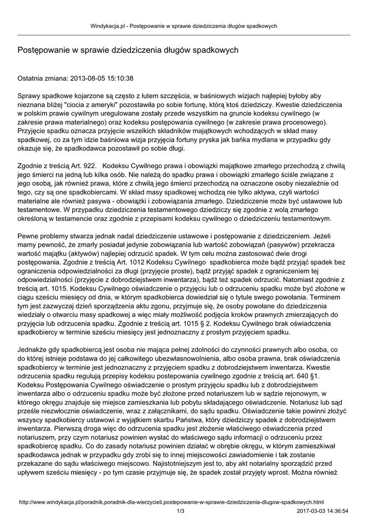 Windykacja.pl - Postępowanie w sprawie dziedziczenia długów spadkowych Postępowanie w sprawie dziedziczenia długów spadkowych Ostatnia zmiana: 2013-08-05 15:10:38 Sprawy spadkowe kojarzone są często z łutem szczęścia, w baśniowych wizjach najlepiej byłoby aby nieznana bliżej "ciocia z ameryki" pozostawiła po sobie fortunę, którą ktoś dziedziczy. Kwestie dziedziczenia w polskim prawie cywilnym uregulowane zostały przede wszystkim na gruncie kodeksu cywilnego (w zakresie prawa materialnego) oraz kodeksu postępowania cywilnego (w zakresie prawa procesowego). Przyjęcie spadku oznacza przyjęcie wszelkich składników majątkowych wchodzących w skład masy spadkowej, co za tym idzie baśniowa wizja przyjęcia fortuny pryska jak bańka mydlana w przypadku gdy okazuje się, że spadkodawca pozostawił po sobie długi. Zgodnie z treścią Art. 922. Kodeksu Cywilnego prawa i obowiązki majątkowe zmarłego przechodzą z chwilą jego śmierci na jedną lub kilka osób. Nie należą do spadku prawa i obowiązki zmarłego ściśle związane z jego osobą, jak również prawa, które z chwilą jego śmierci przechodzą na oznaczone osoby niezależnie od tego, czy są one spadkobiercami. W skład masy spadkowej wchodzą nie tylko aktywa, czyli wartości materialne ale również pasywa - obowiązki i zobowiązania zmarłego. Dziedziczenie może być ustawowe lub testamentowe. W przypadku dziedziczenia testamentowego dziedziczy się zgodnie z wolą zmarłego określoną w testamencie oraz zgodnie z przepisami kodeksu cywilnego o dziedziczeniu testamentowym. Pewne problemy stwarza jednak nadal dziedziczenie ustawowe i postępowanie z dziedziczeniem. Jeżeli mamy pewność, że zmarły posiadał jedynie zobowiązania lub wartość zobowiązań (pasywów) przekracza wartość majątku (aktywów) najlepiej odrzucić spadek. W tym celu można zastosować dwie drogi postępowania. Zgodnie z treścią Art. 1012 Kodeksu Cywilnego spadkobierca może bądź przyjąć spadek bez ograniczenia odpowiedzialności za długi (przyjęcie proste), bądź przyjąć spadek z ograniczeniem tej odpowiedzialności (przyjęcie z dobrodziejstwem inwentarza), bądź też spadek odrzucić. Natomiast zgodnie z treścią art. 1015. Kodeksu Cywilnego oświadczenie o przyjęciu lub o odrzuceniu spadku może być złożone w ciągu sześciu miesięcy od dnia, w którym spadkobierca dowiedział się o tytule swego powołania. Terminem tym jest zazwyczaj dzień sporządzenia aktu zgonu, przyjmuje się, że osoby powołane do dziedziczenia wiedziały o otwarciu masy spadkowej a więc miały możliwość podjęcia kroków prawnych zmierzających do przyjęcia lub odrzucenia spadku. Zgodnie z treścią art. 1015 § 2. Kodeksu Cywilnego brak oświadczenia spadkobiercy w terminie sześciu miesięcy jest jednoznaczny z prostym przyjęciem spadku. Jednakże gdy spadkobiercą jest osoba nie mająca pełnej zdolności do czynności prawnych albo osoba, co do której istnieje podstawa do jej całkowitego ubezwłasnowolnienia, albo osoba prawna, brak oświadczenia spadkobiercy w terminie jest jednoznaczny z przyjęciem spadku z dobrodziejstwem inwentarza. Kwestie odrzucenia spadku regulują przepisy kodeksu postepowania cywilnego zgodnie z treścią art. 640 §1. Kodeksu Postępowania Cywilnego oświadczenie o prostym przyjęciu spadku lub z dobrodziejstwem inwentarza albo o odrzuceniu spadku może być złożone przed notariuszem lub w sądzie rejonowym, w którego okręgu znajduje się miejsce zamieszkania lub pobytu składającego oświadczenie. Notariusz lub sąd prześle niezwłocznie oświadczenie, wraz z załącznikami, do sądu spadku. Oświadczenie takie powinni złożyć wszyscy spadkobiercy ustawowi z wyjątkiem skarbu Państwa, który dziedziczy spadek z dobrodziejstwem inwentarza. Pierwszą droga więc do odrzucenia spadku jest złożenie właściwego oświadczenia przed notariuszem, przy czym notariusz powinien wysłać do właściwego sądu informacji o odrzuceniu przez spadkobiercę spadku. Co do zasady notariusz powinien działać w obrębie okręgu, w którym zamieszkiwał spadkodawca jednak w przypadku gdy zrobi się to innej miejscowości zawiadomienie i tak zostanie przekazane do sądu właściwego miejscowo. Najistotniejszym jest to, aby akt notarialny sporządzić przed upływem sześciu miesięcy - po tym czasie przyjmuje się, że spadek został przyjęty wprost. Można również http://www.windykacja.pl/poradnik,poradnik-dla-wierzycieli,postepowanie-w-sprawie-dziedziczenia-dlugow-spadkowych.html 1/3 2017-03-03 14:36:54 Windykacja.pl - Postępowanie w sprawie dziedziczenia długów spadkowych oświadczenie o odrzuceniu spadku złożyć przed Sądem Spadku, w którym zmarły miał ostatnie miejsce zamieszkania, jednakże oświadczenie złożone w niewłaściwym miejscowo sądzie zostanie przekazane sądowi właściwemu. Oświadczenie powinno być sporządzone we właściwej formie, szczegóły oświadczenia określa art. 641. Kodeksu Postępowania Cywilnego zgodnie z którym oświadczenie o przyjęciu lub odrzuceniu spadku powinno zawierać: 1) imię i nazwisko spadkodawcy, datę i miejsce jego śmierci oraz miejsce jego ostatniego zamieszkania; 2) tytuł powołania do spadku; 3) treść złożonego oświadczenia. Ponadto oświadczenie powinno również zawierać wymienienie wszelkich wiadomych składającemu oświadczenie osób należących do kręgu spadkobierców ustawowych, jak również wszelkich testamentów, chociażby składający oświadczenie uważał je za nieważne, oraz danych dotyczących treści i miejsca przechowania testamentów. Przy oświadczeniu należy złożyć wypis aktu zgonu spadkodawcy albo prawomocne orzeczenie sądowe o uznaniu za zmarłego lub o stwierdzeniu zgonu, jeżeli dowody te nie zostały już poprzednio złożone. Oświadczenie można złożyć również ustnie, wtedy z oświadczenia sporządza się protokół. W przypadku gdy pismo wnioskodawcy było niezupełne s