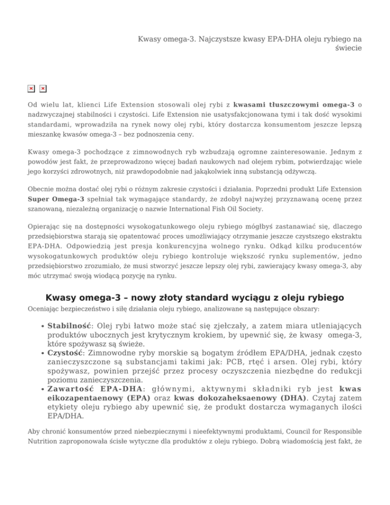 Kwasy omega-3. Najczystsze kwasy EPA-DHA oleju rybiego na świecie Od wielu lat, klienci Life Extension stosowali olej rybi z kwasami tłuszczowymi omega-3 o nadzwyczajnej stabilności i czystości. Life Extension nie usatysfakcjonowana tymi i tak dość wysokimi standardami, wprowadziła na rynek nowy olej rybi, który dostarcza konsumentom jeszcze lepszą mieszankę kwasów omega-3 – bez podnoszenia ceny. Kwasy omega-3 pochodzące z zimnowodnych ryb wzbudzają ogromne zainteresowanie. Jednym z powodów jest fakt, że przeprowadzono więcej badań naukowych nad olejem rybim, potwierdzając wiele jego korzyści zdrowotnych, niż prawdopodobnie nad jakąkolwiek inną substancją odżywczą. Obecnie można dostać olej rybi o różnym zakresie czystości i działania. Poprzedni produkt Life Extension Super Omega-3 spełniał tak wymagające standardy, że zdobył najwyżej przyznawaną ocenę przez szanowaną, niezależną organizację o nazwie International Fish Oil Society. Opierając się na dostępności wysokogatunkowego oleju rybiego mógłbyś zastanawiać się, dlaczego przedsiębiorstwa starają się opatentować proces umożliwiający otrzymanie jeszcze czystszego ekstraktu EPA-DHA. Odpowiedzią jest presja konkurencyjna wolnego rynku. Odkąd kilku producentów wysokogatunkowych produktów oleju rybiego kontroluje większość rynku suplementów, jedno przedsiębiorstwo zrozumiało, że musi stworzyć jeszcze lepszy olej rybi, zawierający kwasy omega-3, aby móc utrzymać swoją wiodącą pozycję na rynku. Kwasy omega-3 – nowy złoty standard wyciągu z oleju rybiego Oceniając bezpieczeństwo i siłę działania oleju rybiego, analizowane są następujące obszary: Stabilność: Olej rybi łatwo może stać się zjełczały, a zatem miara utleniających produktów ubocznych jest krytycznym krokiem, by upewnić się, że kwasy omega-3, które spożywasz są świeże. Czystość: Zimnowodne ryby morskie są bogatym źródłem EPA/DHA, jednak często zanieczyszczone są substancjami takimi jak: PCB, rtęć i arsen. Olej rybi, który spożywasz, powinien przejść przez procesy oczyszczenia niezbędne do redukcji poziomu zanieczyszczenia. Zawartość EPA-DHA: głównymi, aktywnymi składniki ryb jest kwas eikozapentaenowy (EPA) oraz kwas dokozaheksaenowy (DHA). Czytaj zatem etykiety oleju rybiego aby upewnić się, że produkt dostarcza wymaganych ilości EPA/DHA. Aby chronić konsumentów przed niebezpiecznymi i nieefektywnymi produktami, Council for Responsible Nutrition zaproponowała ścisłe wytyczne dla produktów z oleju rybiego. Dobrą wiadomością jest fakt, że Kwasy omega-3. Najczystsze kwasy EPA-DHA oleju rybiego na świecie jakość tego ekstraktu z oleju rybiego wychodzi poza nawet te zatwierdzone, podwyższone standardy farmaceutyczne. Ten nowy wyciąg – znajdujący się w Super Omega-3 – jest produkowany przy wykorzystaniu opatentowanych procesów wydobycia i oczyszczenia, aby zwiększyć stabilność, usunąć rzeczywiście wszystkie zanieczyszczenia i ochronić przed utlenianiem oraz peroksydacją delikatnych kwasów tłuszczowych omega-3. Olej ten spełnia tak wysokie standardy, że został zatwierdzony w Unii Europejskiej jako aktywny składnik farmaceutyczny. Jak produkowany jest ten nowy olej rybi W celu uzyskania czystego i stabilnego oleju rybiego, rozwinięto opatentowaną metodę oczyszczania za pomocą 2-stopniowych, intensywnych procesów destylacji. Rezultatem oczyszczania oleju przed tym procesem, jest czystszy produkt, który krócej poddawany jest działaniu temperatury, co chroni przed termiczną degradacją EPA/DHA. Ten opatentowany (Pure+ ™) proces destylacji usuwa pewne nieczystości, które wywołują objawy takie jak refluks, odbijanie i wymioty u niektórych osób. Nowy ekstrakt z oleju rybiego ma również lepszy zapach dzięki sterylności tego procesu. Jest on również dobrze tolerowany wśród osób o bardzo wrażliwych żołądkach. Wytworzenie w laboratorium tego nowego wyciągu było pierwszym krokiem na drodze do opracowania zatwierdzonych leków farmaceutycznych z oleju rybiego. Czy zwiększona czystość naprawdę ma znaczenie? Poprzedni olej rybi z Super Omega-3 zawsze przechodził testy na dopuszczalne ilości zanieczyszczeń i otrzymywał pożądaną 5-gwiazdkową ocenę z International Fish Oil Society. Czy zatem usuwanie jeszcze większej ilości zanieczyszczeń naprawdę ma znacznie? Odpowiedź brzmi – nikt nie jest tego do końca pewien. To, co naprawdę jest istotne to fakt, że rtęć jest toksyczna dla komórek w całym organizmie, a PCB jest potężnym czynnikiem rakotworotwórczym. Jak wiadomo, należy spożywać jak najmniej zanieczyszczeń. Niedawne badania z Cornell University oszacowały, że jedna trzecia ogólnoświatowych zgonów spowodowana jest przez skażenie.[1] Nasza ocena standardów ustanowionych dla zadowalających poziomów zanieczyszczeń opiera się na typowej długości życia. Odkąd klienci Life Extension oczekują znacznej poprawy “średniej” długowieczności, zmniejszanie ekspozycji na zanieczyszczenia wydaje się być pożądane. Istotne jest również to, że zanieczyszczenia są wszechobecne w naszym środowisku i najlepsze, co możemy w tym Kwasy omega-3. Najczystsze kwasy EPA-DHA oleju rybiego na świecie kierunku zrobić, to zmniejszyć naszą ekspozycję na nie. DWIE ŚCIEŻKI DZIAŁANIA GLA W ORGANIZMIE Schemat nr 1: Ten schemat pokazuje, że GLA może podążać prozapalną lub przeciwzapalną ścieżką w organizmie. Lignany sezamu hamują enzym (Delta-5-desaturazę), który konwertuje DGLA w kwas arachidonowy . Poprzez blokowanie niepożądanego enzymu (Delta-5-desaturazy), większe ilości DGLA mogą przekształcić się w korzystną prostaglandynę E1.[2] Co czyni z Super Omega-3 najlepszym suplementem oleju rybiego? Konsumenci mają szeroki wybór suplementów uzupełniających kwasy omega-3. Przytłaczająca przewaga dowodów wskazuje, że uzyskanie EPA i DHA bezpo