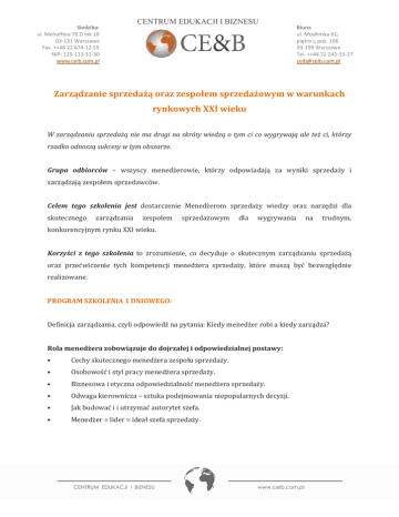 CENTRUM EDUKACJI I BIZNESU Siedziba: ul. Mehoffera 70 D lok 10 03-131 Warszawa Fax. ++48 22 674-12-55 NIP: 125-113-31-30 www.ceib.com.pl Biuro: ul. Modlińska 61; piętro I, pok. 106 03-199 Warszawa Tel. ++48 22 243-33-27 [email protected] Zarządzanie sprzedażą oraz zespołem sprzedażowym w warunkach rynkowych XXI wieku W zarządzaniu sprzedażą nie ma drogi na skróty wiedzą o tym ci co wygrywają ale też ci, którzy rzadko odnoszą sukcesy w tym obszarze. Grupa odbiorców – wszyscy menedżerowie, którzy odpowiadają za wyniki sprzedaży i zarządzają zespołem sprzedawców. Celem tego szkolenia jest dostarczenie Menedżerom sprzedaży wiedzy oraz narzędzi dla skutecznego zarządzania zespołem sprzedażowym dla wygrywania na trudnym, konkurencyjnym rynku XXI wieku. Korzyści z tego szkolenia to zrozumienie, co decyduje o skutecznym zarządzaniu sprzedażą oraz przećwiczenie tych kompetencji menedżera sprzedaży, które muszą być bezwzględnie realizowane. PROGRAM SZKOLENIA 1 DNIOWEGO: Definicja zarządzania, czyli odpowiedź na pytania: Kiedy menedżer robi a kiedy zarządza? Rola menedżera zobowiązuje do dojrzałej i odpowiedzialnej postawy: • Cechy skutecznego menedżera zespołu sprzedaży. • Osobowość i styl pracy menedżera sprzedaży. • Biznesowa i etyczna odpowiedzialność menedżera sprzedaży. • Odwaga kierownicza – sztuka podejmowania niepopularnych decyzji. • Jak budować i i utrzymać autorytet szefa. • Menedżer = lider = ideał szefa sprzedaży. CENTRUM EDUKACJI I BIZNESU Siedziba: ul. Mehoffera 70 D lok 10 03-131 Warszawa Fax. ++48 22 674-12-55 NIP: 125-113-31-30 www.ceib.com.pl Biuro: ul. Modlińska 61; piętro I, pok. 106 03-199 Warszawa Tel. ++48 22 243-33-27 [email protected] Planowanie, stawianie celów, priorytety a uciekający czas: • Niby takie łatwe a takie trudne. • Zasady planowania oraz wynikające z tego korzyści. • Cele, zadania SMART. Wyznaczanie i realizacja. • Przewidywanie, czyli odpowiedź na najważniejsze pytania menedżera: „Co będzie, gdy?” • Priorytety w procesie planowania. • Korzyści z właściwego planowania. • Delegowanie zadań i uprawnień: − co? Komu? Gdzie? Jak? Po co delegować? − nie ma zarządzania bez delegowania, − nie ma delegowania bez egzekwowania. Kontrola pracy zespołu: • W jaki sposób kontrolować pracę zespołu? • Szef Policjant czy Przyjaciel? • Kontroluj to co trzeba i kiedy trzeba. • Znaczenie informacji zwrotnej w kontrolowaniu. • Znaczenie raportowania w kontrolowaniu. Menedżer zespołu sprzedażowego – podstawowe narzędzia pracy menedżera: • Targety i cele – co tak naprawdę decyduje o ich realizacji? • Raportowanie, czyli rzecz znienawidzona przez zespół. Jak to zmienić? • Budowanie zespołu sprzedaży – podstawowe zasady. • Nowy handlowiec - wprowadzenie do pracy. • Cykliczne spotkania menedżera z zespołem sprzedaży. • Magiczne pytanie: „Jak mogę Ci pomóc, abyś skuteczniej sprzedawał? • Menedżer między młotem i kowadłem, czyli wybór między zarządem a zespołem. • Na czym polega menedżerska mądrość, czyli elementy nowoczesnej szkoły zarządzania. CENTRUM EDUKACJI I BIZNESU Siedziba: ul. Mehoffera 70 D lok 10 03-131 Warszawa Fax. ++48 22 674-12-55 NIP: 125-113-31-30 www.ceib.com.pl Biuro: ul. Modlińska 61; piętro I, pok. 106 03-199 Warszawa Tel. ++48 22 243-33-27 [email protected] Przywództwo sytuacyjne menedżera sprzedaży: • Informacja zwrotna, czyli feedback, jako skuteczne narzędzie zarządzania. • Konstruktywna krytyka – zasady tworzenia oraz lista korzyści. • Asertywność i Empatia – dwa żywiołu na usługach menedżera sprzedaży. • Asertywne zachowanie w relacjach szef Podwładny = silny zespół. Motywowanie – jedno z kluczowych zadań menedżera: • Na czym polega motywowanie ludzi do wydajnej pracy? • Wybór między motywowaniem finansowym a nie finansowym. • Nie ma zwycięstwa bez zmotywowanego zespołu. • Na deser – nowe podejście do motywowania. • Gry zespołowe, które bawią i uczą zarazem.