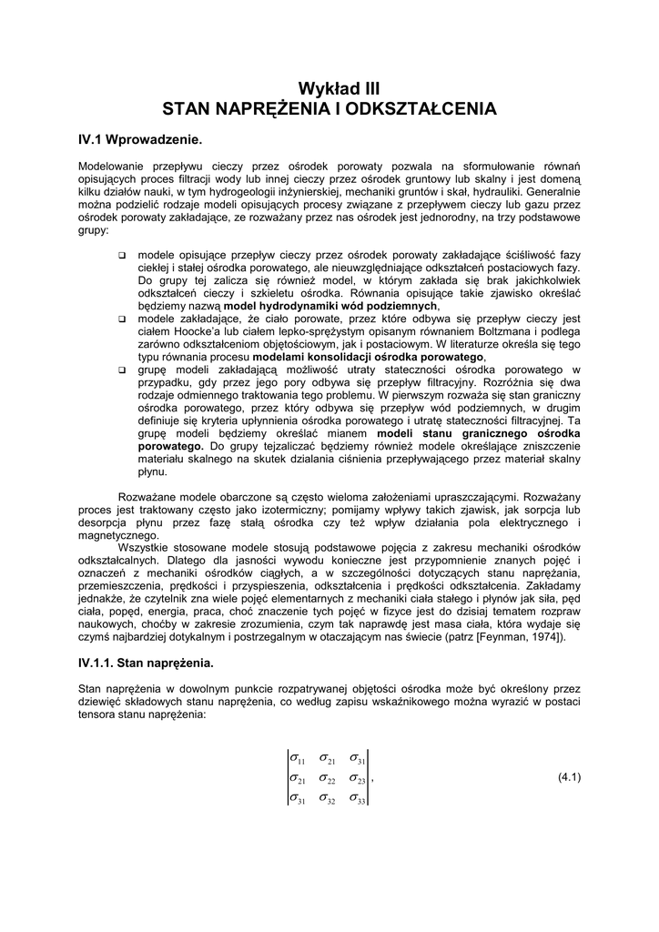 Wykład III STAN NAPRĘŻENIA I ODKSZTAŁCENIA IV.1 Wprowadzenie. Modelowanie przepływu cieczy przez ośrodek porowaty pozwala na sformułowanie równań opisujących proces filtracji wody lub innej cieczy przez ośrodek gruntowy lub skalny i jest domeną kilku działów nauki, w tym hydrogeologii inżynierskiej, mechaniki gruntów i skał, hydrauliki. Generalnie można podzielić rodzaje modeli opisujących procesy związane z przepływem cieczy lub gazu przez ośrodek porowaty zakładające, ze rozważany przez nas ośrodek jest jednorodny, na trzy podstawowe grupy: modele opisujące przepływ cieczy przez ośrodek porowaty zakładające ściśliwość fazy ciekłej i stałej ośrodka porowatego, ale nieuwzględniające odkształceń postaciowych fazy. Do grupy tej zalicza się również model, w którym zakłada się brak jakichkolwiek odkształceń cieczy i szkieletu ośrodka. Równania opisujące takie zjawisko określać będziemy nazwą model hydrodynamiki wód podziemnych, modele zakładające, że ciało porowate, przez które odbywa się przepływ cieczy jest ciałem Hoocke’a lub ciałem lepko-sprężystym opisanym równaniem Boltzmana i podlega zarówno odkształceniom objętościowym, jak i postaciowym. W literaturze określa się tego typu równania procesu modelami konsolidacji ośrodka porowatego, grupę modeli zakładającą możliwość utraty stateczności ośrodka porowatego w przypadku, gdy przez jego pory odbywa się przepływ filtracyjny. Rozróżnia się dwa rodzaje odmiennego traktowania tego problemu. W pierwszym rozważa się stan graniczny ośrodka porowatego, przez który odbywa się przepływ wód podziemnych, w drugim definiuje się kryteria upłynnienia ośrodka porowatego i utratę stateczności filtracyjnej. Ta grupę modeli będziemy określać mianem modeli stanu granicznego ośrodka porowatego. Do grupy tejzaliczać będziemy również modele określające zniszczenie materiału skalnego na skutek dzialania ciśnienia przepływającego przez materiał skalny płynu. Rozważane modele obarczone są często wieloma założeniami upraszczającymi. Rozważany proces jest traktowany często jako izotermiczny; pomijamy wpływy takich zjawisk, jak sorpcja lub desorpcja płynu przez fazę stałą ośrodka czy też wpływ działania pola elektrycznego i magnetycznego. Wszystkie stosowane modele stosują podstawowe pojęcia z zakresu mechaniki ośrodków odkształcalnych. Dlatego dla jasności wywodu konieczne jest przypomnienie znanych pojęć i oznaczeń z mechaniki ośrodków ciągłych, a w szczególności dotyczących stanu naprężania, przemieszczenia, prędkości i przyspieszenia, odkształcenia i prędkości odkształcenia. Zakładamy jednakże, że czytelnik zna wiele pojęć elementarnych z mechaniki ciała stałego i płynów jak siła, pęd ciała, popęd, energia, praca, choć znaczenie tych pojęć w fizyce jest do dzisiaj tematem rozpraw naukowych, choćby w zakresie zrozumienia, czym tak naprawdę jest masa ciała, która wydaje się czymś najbardziej dotykalnym i postrzegalnym w otaczającym nas świecie (patrz [Feynman, 1974]). IV.1.1. Stan naprężenia. Stan naprężenia w dowolnym punkcie rozpatrywanej objętości ośrodka może być określony przez dziewięć składowych stanu naprężenia, co według zapisu wskaźnikowego można wyrazić w postaci tensora stanu naprężenia: σ 11 σ 21 σ 31 σ 21 σ 22 σ 23 σ 31 σ 32 σ 33 , (4.1) przy czym przyjmiemy znaną w mechanice umowę, że σ ii jest dodatnie, jeżeli mamy do czynienia z rozciąganiem, ujemne ze ściskaniem rys.4.1. Rys. 4.1. Składowe stanu naprężenia na ścianach elementarnego graniastosłupa. W szczególnych przypadkach będziemy stosować zapis klasyczny dla tensora naprężenia, którym naprężenia normalne będziemy wyrażać przy pomocy oznaczenia σ , a naprężenia styczne przy pomocy oznaczenia τ , według zasady: σ 11 = σ x , σ 22 = σ y , σ 33 = σ x i σ 12 = τ xy , σ 13 = τ xz , σ 21 = τ yx , σ 23 = τ yz , σ 31 = τ zx , σ 32 = τ zy . (4.2) W każdym punkcie ośrodka możemy znaleźć trzy płaszczyzny ośrodka, na których działają tylko narężenia normalne do tych płaszczyzn, ponieważ naprężenia styczne przyjmują na nich wartości zerowe. Płaszczyzny te nazywamy płaszczyznami głównymi, a działające na nich naprężenia oznaczane σ 1 ,σ 2 ,σ 3 naprężeniami głównymi. W celu znalezienia naprężeń głównych rozpatrzmy równowagę elementarnego czworościanu pokazanego na rys.4.2, którego trzy ściany tworzą płaszczyzny zawierające osie współrzędnych, a czwarta płaszczyzna A nachylona jest do układu współrzędnych, a jej nachylenie określa kierunek wersor n do niej prostopadłego. Rys. 4.2. Naprężenia na ściance A elementarnego czworościanu. Oznaczmy przez ai cosinusy kierunkowe normalnej do powierzchni A. Jeżeli przez p oznaczymy wypadkowe naprężenie działające na ścianę A, można rozłożyć go na trzy składowe pj z warunków równowagi czworościanu: p j = σ ij ai . i styczną do powierzchni A pt pn Naprężenie p można rozłożyć na składową normalną (4.3) : pn = p j a j (4.4) pt2 = p 2 − pn2 . (4.5) i Na płaszczyźnie, na której działa naprężenie główne σ , wypadkowe naprężenie p musi być skierowane wzdłuż normalnej n do tej powierzchni, ponieważ wówczas naprężenie styczne równa się zeru. Daje to związki na składowe naprężenia p: p j = a jσ , (4.6) ai po podstawieniu tych związków do równań (4.3) utrzymujemy układ trzech równań liniowych, gdzie niewiadomymi są kosinusy kierunkowe : σ ij ai − σ a j = 0 . (4.7) Układ ten będzie miał niezerowe rozwiązanie, gdy wyznacznik utworzony ze współczynników przy niewiadomych cosinusach kierunkowych kątów nachylenia do osi, wersora n równa się zeru: σ 11 − σ σ 12 σ 13 σ 21 σ 22 − σ σ 23 = 0 . σ 31 σ 32 σ 33 − σ (4.8) Wyznacznik ten sprowadza się do równania trzeciego stopnia wzgl