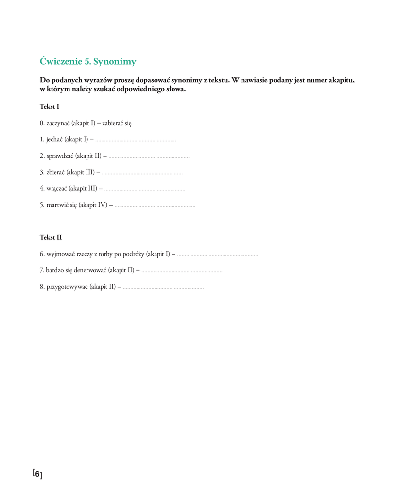 Ćwiczenie 5. Synonimy Do podanych wyrazów proszę dopasować synonimy z tekstu. W nawiasie podany jest numer akapitu, w którym należy szukać odpowiedniego słowa. Tekst I 0. zaczynać (akapit I) – zabierać się 1. jechać (akapit I) – ...................................................... 2. sprawdzać (akapit II) – ...................................................... 3. zbierać (akapit III) – ...................................................... 4. włączać (akapit III) – ...................................................... 5. martwić się (akapit IV) – ...................................................... Tekst II 6. wyjmować rzeczy z torby po podróży (akapit I) – ...................................................... 7. bardzo się denerwować (akapit II) – ...................................................... 8. przygotowywać (akapit II) – ...................................................... [ 6 ]