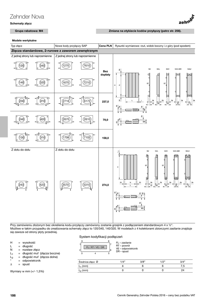 Zehnder Nova Schematy złącz Grupa rabatowa: M4 Zmiana na etykiecie kodów przyłączy (patrz str. 256). Modele wertykalne Typ złącz Nowe kody przyłączy SAP Cena PLN Rysunki wymiarowe: rzut, widok boczny i z góry (pod spodem) Złącza standardowe, 2-rurowe z zaworem zewnętrznym Z jednej strony lub naprzemienne Z jednej strony lub naprzemienne 1270 7610 Bez dopłaty Z dołu do dołu 1670 7210 2716 6172 237,0 2670 2610 79,0 1706 7102 158,0 5310 274,0 Z dołu do dołu 3570 Przy zamówieniu złożonym bez określenia kodu przyłączy zamówiony zostanie grzejnik z podłączeniem standardowym 4 x ½‘‘. Możliwe w takim przypadku do zrealizowania schematy złącz to 120/340, 140/320. W modelach z 4 kolektorami zbiorczymi zasilanie znajduje się zawsze od strony płyty przedniej. System kodyfikacji podłączeń H L N L1 L2 * ∆ = = = = = = = wysokość długość rozstaw złącz długość muf (złącza boczne) długość muf (złącza dolne) odpowietrznik spust FL – zasilanie RT – powrót VE – odpowietrznik DR – spust Wymiary w mm (+/- 1,5%) 186 Cennik Generalny Zehnder Polska 2016 – ceny bez podatku VAT Zehnder Nova Schematy złącz Grupa rabatowa: M4 Zmiana na etykiecie kodów przyłączy (patrz str. 256). Modele wertykalne Typ złącz Nowe kody przyłączy SAP Cena PLN Rysunki wymiarowe: rzut, widok boczny i z góry (pod spodem) Złącza standardowe, 2-rurowe z zaworem zewnętrznym Z góry do góry Z góry do góry 9806 Z dołu do góry 330,0 Z dołu do góry 3816 Z dołu do dołu, z rozstawem 50 mm przy krawędzi (bez zaworu term.) 8902 5972 495,0 Z dołu do dołu, z rozstawem 50 mm przy krawędzi (bez zaworu term.) 222,0 3370 5510 Uwaga: Completto na str. 297 Uwaga: Completto na str. 297 Z góry do góry przy krawędzi (bez zaworu term.) Z góry do góry przy krawędzi (bez zaworu term.) 330,0 9906 Z dołu do dołu Złącza centryczne 50 mm Z dołu do dołu Złącza centryczne 50 mm 3470 Uwaga: Completto - patrz następna strona H L N T ST L1 L2 * ∆ = = = = = = = = = 8802 5410 233,0 Możliwe od 4 elementów, złącze np. do wykorzystania zaworów Zehnder Vario Uwaga: Completto - patrz następna strona wysokość długość rozstaw złącz głębokość poprzeczka długość muf (złącza boczne) długość muf (złącza dolne) odpowietrznik spust Przy zamówieniu złożonym bez określenia kodu przyłączy zamówiony zostanie grzejnik z podłączeniem standardowym 4 x ½‘‘. Możliwe w takim przypadku do zrealizowania schematy złącz to 120/340, 140/320. W modelach z 4 kolektorami zbiorczymi zasilanie znajduje się zawsze od strony płyty przedniej. Wymiary w mm (+/- 1,5%) System kodyfikacji podłączeń FL – zasilanie RT – powrót VE – odpowietrznik DR – spust Cennik Generalny Zehnder Polska 2016 – ceny bez podatku VAT 187 Zehnder Nova Schematy złącz Grupa rabatowa: M4 Zmiana na etykiecie kodów przyłączy (patrz str. 256). Modele wertykalne Typ złącz Cena PLN Nowe kody przyłączy SAP Rysunki wymiarowe: rzut, widok boczny i z góry (pod spodem) Złącza Completto ze zintegrowanym zaworem termostatycznym OV M30X1,5 (ceny bez głowicy termostatycznej) Zawór u góry Złącza 50 mm przy krawędzi Zawór u góry Złącza 50 mm przy krawędzi V001 V002 233,0 Uwaga! Możliwość zamontowania zaworu termostatycznego i głowicy w dolnym kolektorze dodatkowa opłata 99 PLN. Uwaga! Możliwość zamontowania zaworu termostatycznego i głowicy w dolnym kolektorze dodatkowa opłata 99 PLN. Zawór u góry Złącza centryczne 50 mm Zawór u góry Złącza centryczne 50 mm V007 V008 Widok: zawór z lewej strony 466,0 Uwaga! Możliwość zamontowania zaworu termostatycznego i głowicy w dolnym kolektorze dodatkowa opłata 99 PLN. Uwaga! Możliwość zamontowania zaworu termostatycznego i głowicy w dolnym kolektorze dodatkowa opłata 99 PLN. Widok: zawór z lewej strony Złącza Completto, zawór w płycie przedniej, u góry lub na dowolnej wysokości (bez głowicy), średnica otworu Ø 45 mm Złącza 50 mm przy krawędzi Złącza 50 mm przy krawędzi V501 V502 605,0 Widok: zawór z lewej strony Przy zamówieniu grzejnika Zehnder Nova ze zintegrowanym zaworem termostatycznym należy określić lokalizację złącz: z lewej, prawej lub na środku. System kodyfikacji podłączeń H L N T * = = = = = wysokość długość rozstaw złącz głębokość odpowietrznik FL – zasilanie RT – powrót VE – odpowietrznik DR – spust 1) Zamawiając grzejnik z zaworem termostatycznym (zawór zintegrowany), poza podaniem schematu złącz należy koniecznie napisać w zamówieniu „Completto = C”, lub „Completto na płycie przedniej = CD”. Położenie zaworu termostatycznego – zgodnie z wytycznymi zamawiającego (za dopłatą – patrz – tabela Wykonania specjalne), lokalizacja w odległości min. 118 mm od górnej lub dolnej krawędzi. Wymiary w mm (+/- 1,5%) 188 Cennik Generalny Zehnder Polska 2016 – ceny bez podatku VAT
