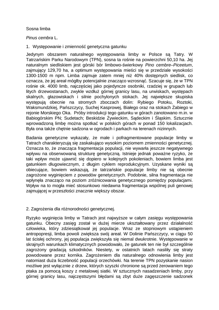 Sosna limba Pinus cembra L. 1. Występowanie i zmienność genetyczna gatunku Jedynym obszarem naturalnego występowania limby w Polsce są Tatry. W Tatrzańskim Parku Narodowym (TPN), sosna ta rośnie na powierzchni 50,10 ha. Jej naturalnym siedliskiem jest górski bór limbowo-świerkowy Pino cembre–Piceetum, zajmujący 129,70 ha, a optimum występowania mieści się w przedziale wysokości 1300-1500 m npm. Limba zajmuje zatem mniej niż 40% dostępnych siedlisk, co oznacza, że jej areał mógłby potencjalnie znacząco wzrosnąć. Szacuje się, że w TPN rośnie ok. 4000 limb, najczęściej jako pojedyncze osobniki, rzadziej w grupach lub litych drzewostanach, zwykle wzdłuż górnej granicy lasu, na urwiskach, występach skalnych, głazowiskach i silnie pochylonych stokach. Jej największe skupiska występują obecnie na stromych zboczach dolin: Rybiego Potoku, Roztoki, Waksmundzkiej, Pańszczycy, Suchej Kasprowej, Białego oraz na stokach Żabiego w rejonie Morskiego Oka. Próby introdukcji tego gatunku w górach zanotowano m.in. w Babiogórskim PN; Sudetach; Beskidzie Żywieckim, Sądeckim i Śląskim. Sztucznie wprowadzoną limbę można spotkać w polskich górach w ponad 150 lokalizacjach. Była ona także chętnie sadzona w ogrodach i parkach na terenach nizinnych. Badania genetyczne wykazały, że małe i pofragmentowane populacje limby w Tatrach charakteryzują się zaskakująco wysokim poziomem zmienności genetycznej. Oznacza to, że znacząca fragmentacja populacji, nie wywarła jeszcze negatywnego wpływu na obserwowaną strukturę genetyczną. Istnieje jednak poważne ryzyko, że taki wpływ może ujawnić się dopiero w kolejnych pokoleniach, bowiem limba jest gatunkiem długowiecznym, z długim cyklem reprodukcyjnym. Uzyskane wyniki są obiecujące, bowiem wskazują, że tatrzańskie populacje limby nie są obecnie zagrożone wyginięciem z powodów genetycznych. Podobnie, silna fragmentacja nie wpłynęła znacząco na poziom zróżnicowania genetycznego pomiędzy populacjami. Wpływ na to mogła mieć stosunkowo niedawna fragmentacja wspólnej puli genowej zajmującej w przeszłości znacznie większy obszar. 2. Zagrożenia dla różnorodności genetycznej. Ryzyko wyginięcia limby w Tatrach jest najwyższe w całym zasięgu występowania gatunku. Obecny zasięg został w dużej mierze ukształtowany przez działalność człowieka, który zdziesiątkował jej populacje. Wraz ze stopniowym ustąpieniem antropopresji, limba powoli zwiększa swój areał. W Dolinie Pańszczycy, w ciągu 50 lat ścisłej ochrony, jej populacja zwiększyła się niemal dwukrotnie. Występowanie w skrajnych warunkach klimatycznych powodowało, że gatunek ten nie był szczególnie zagrożony gradacją szkodników. Niestety, w ostatnich latach nasiliły się straty powodowane przez kornika. Zagrożeniem dla naturalnego odnowienia limby jest natomiast duża liczebność populacji orzechówki. Na terenie TPN pozyskanie nasion możliwe jest wyłącznie z drzew, których szyszki chronione są przed żerowaniem tego ptaka za pomocą koszy z metalowej siatki. W sztucznych nasadzeniach limby, przy górnej granicy lasu, najczęstszymi błędami są zbyt duże zagęszczenie sadzonek oraz wykorzystanie łagodnych stoków, na których gatunek ten przegrywa konkurencję ze świerkiem i kosodrzewiną. W celu ochrony sadzonek przed zwierzyną płową zalecane jest grodzenie upraw lub indywidualne zabezpieczanie przed zgryzaniem i spałowaniem. Istotnym zagrożeniem dla integralności rodzimej limby były próby introdukcji limby syberyjskiej i alpejskiej prowadzone w XIX wieku w Tatrach oraz w XX wieku w Sudetach. Główne zagrożenie dla gatunku wynika jednak z ograniczonego areału, szczególnie w kontekście przewidywanej utraty znaczącej części siedlisk, w wyniku postępującego ocieplenia klimatu. 3. Ochrona zasobów genowych Sosna limba podlega w Polsce ochronie gatunkowej. Dodatkowo, całość jej obszaru naturalnego występowania objęta jest ochroną ścisłą w ramach TPN. Na obszarze tym nie prowadzi się aktualnie żadnych czynnych działań ochronnych. „Program zachowania leśnych zasobów genowych…” rekomenduje wdrożenie indywidualnego programu ochrony zróżnicowania genetycznego limby, połączonego z jej reintrodukcją. Badania genetyczne wykazały, że limba w Tatrach (polskich i słowackich) posiada wspólną pulę genową i dlatego powinna być traktowana jako jedna jednostka ochrony. Oznacza to konieczność podjęcia współpracy pomiędzy Polską i Słowacją. Z uwagi na skrajnie niską liczebność populacji i gradację kornika notowaną w ostatnich latach, takie wysiłki mają kluczowe znaczenie dla ochrony polskich populacji. Program konserwatorski powinien opierać się wyłącznie o materiał pochodzenia rodzimego, z wykluczeniem najbardziej północnej populacji w Dolinie Białego, której udział w zmienności allelicznej jest ujemny a współczynnik pokrewieństwa blisko dwukrotnie wyższy niż średnia dla Tatr. Ochrona zasobów genowych wspierana jest dodatkowo przez analizy DNA limby prowadzone przez Uniwersytet Kazimierza Wielkiego w Bydgoszczy, które można wykorzystać do udowodnienia kradzieży drzew, siewek i szyszek limby oraz w działaniach prewencyjnych. 4. Wykorzystanie leśnego materiału rozmnożeniowego. Ustawa o leśnym materiale rozmnożeniowym definiuje sosnę limbę jako gatunek ważny dla leśnictwa i reguluje zasady produkcji i obrotu jej materiałem rozmnożeniowym. Niestety, Krajowy Rejestr Leśnego Materiału Podstawowego prowadzony przez Biuro Nasiennictwa Leśnego nie zawiera żadnych obiektów tego gatunku. Konsekwencją tego faktu jest brak możliwości pozyskania rodzimego materiału rozmnożeniowego limby dopuszczonego do obrotu gospodarczego. Tymczasem, Rejestr Leśnego Materiału Podstawowego prowadzony przez PGL LP zawiera dwa obiekty: zachowawczą plantację generatywną w Nadl. Krościenko oraz plantację nasienną wegetatyw