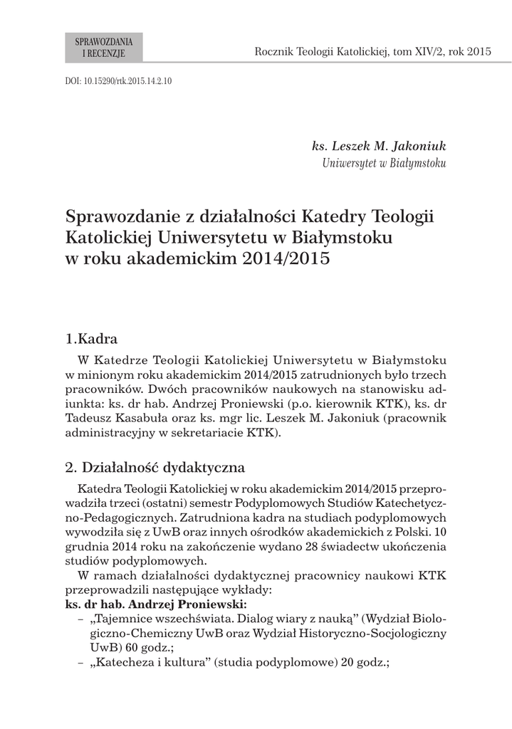 Sprawozdanie z działalności Katedry Teologii Katolickiej