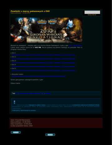 Powtórki z meczy pokazowych z EWI Data publikacji : 10.08.2010 Ocena: 4/5 (5) Blizzard je udostępnił... niestety póki co w formie filmów flashowych i tylko z gier TLO z madfrogiem. Całość waży całkiem sporo bo aż 650 MB. Mecze pojawią się pewnie niedługo na youtubie. Póki co ściągnąć można filmy: ● ● ● ● ● ● Gra 1 http://media.wow-europe.com/stream/regional_finals10/sc2-madfrog-vs-tlo-1map-day2.zip Gra 2: http://media.wow-europe.com/stream/regional_finals10/sc2-madfrog-vs-tlo-2map-day2.zip Gra 3: http://media.wow-europe.com/stream/regional_finals10/sc2-madfrog-vs-tlo-3map-day2.zip Gra 4: http://media.wow-europe.com/stream/regional_finals10/sc2-madfrog-vs-tlo-4map-day2.zip Gra 5: http://media.wow-europe.com/stream/regional_finals10/sc2-madfrog-vs-tlo-5map-day2.zip Wszystko razem http://media.wow-europe.com/stream/regional_finals10/sc2showmatches.zip Serwis gosugamers udostępnił powtórki z gier: Zobacz także: Tagi: film, 2010 European Warcraft Invitational, tlo, madfrog Uprasza się osoby kopiujące w całości newsy z naszej witryny na swoje strony lub fora o wstawianie widocznych klikalnych linków, bezpośrednio do pobranego tekstu. W przypadku braku widocznego linku, skopiowanie tekstu uważa się za kradzież własności intelektualnej. Dziękujemy: Administratorzy serwisu. Autor: Krzysztof Baranowski Data publikacji : 10.08.2010 Data modyfikacji : 10.08.2010 Liczba wyświetleń tekstu: 5355 Komentarz (20) dodaj komentarz są już dostępne normalne repki, można zassać choćby na gosugamers~kzgt 2010/08/10 08:53 "dobry rydz niz nic"~gnomu 2010/08/10 09:02 fajnego ma tlO THORA HEH~dariusz86 2010/08/10 09:21 jak na edycje kolekcjonerską spodziewałem się czegoś bardziej spektakularnego, cóż mam nadzieje, że dla protossów dadzą void raya z kampanii zeratula~bargaw 2010/08/10 09:54 Tak na przyszłość to poprawna forma jest meczów, meczy tylko koza. ;) Także zamiast 'póki co' lepiej stosować tymczasem. Tak na przyszłość to poprawna forma jest meczów, meczy tylko koza. ;) Także zamiast 'póki co' lepiej stosować tymczasem.~ mancias 2010/08/10 10:37 Apropo tych repków: i co terran jest op czy nie ;)~Vagon 2010/08/10 10:49 Na www.sc2rep.net dostępne są także replaye TLO vs Krzysztof (KapeWyplace)~t0mczaq 2010/08/10 11:52 z jakiej gry sa te ripy, z sc2 ?~Fanek 2010/08/10 12:47 Nie z tetrisa ;)~Vagon 2010/08/10 13:12 Ma ktoś problemy z odczytywaniem replayow ? Tzn chodzi mi o to ze prawie w każdym wyskakuje mi tekst "przerwano desynchronizacja" i nic się nie da zrobić można pościć tylko od nowa demko ale i tak po chwili znów to wyskoczy wiec nie ma sensu. Wiece co na to poradzić??~Andrzej_001 2010/08/10 15:58 ta fajny thor tak mysle ze w kampani protosuw dadzoł murlok zelot xd a u zerguw bym sie spodziawał mini utraliska lub hydra szkoda ze thor niereaguje na zerlinga jak murlok marin~sc2kjedy 2010/08/10 19:16 http://gamecorner.pl/gamecorner/1,86013,8235363,Film_dnia___Egzamin_ze_StarCrafta.html~Lunch 2010/08/10 22:25 HAHAHAHAHHA zobaczcie http://www.youtube.com/watch?v=uZtit5R95yM~Glucik 2010/08/10 22:34 stare~PoDsIaD 2010/08/11 08:45 bardzo stare tylko obrazek nowy :P Ps.: Powrocilem do Diamentowej :P I to po grze wygranej 6poolem ;D 8 zerglingow + 7 dronow ;D zniszczylem kolesiowi hatchery, zostaly mi 4 drony i 39 mineralow (jemu zostaly 3 zergligngi i 4 drony i mniej niz 300 mineralow ;>) a koles sie poddal ;D~SzRaPnEL 2010/08/11 09:19 SzRaPnEL, a kogo to obchodzi? W dupie mam jak grasz i w jakiej jesteś lidze. Załóż swój fanklub gdzie indziej.~Sulphuriell 2010/08/11 11:14 Ej, ludzie. Jak ja mam się kontaktować z innymi Pl? Nudno jest trochę na tym battlenecie. :(~dyeskej 2010/08/11 11:15 po grze mozesz sobie przeciwnika dodac do listy friendow :P albo szukac na facebooku ludzi zapisanych do S][C @Sulphuriell gówno mnie obchodzi twoje zdanie :) Buziak :*~SzRaPnEL 2010/08/11 11:22 "@Sulphuriell gówno mnie obchodzi twoje zdanie :) Buziak :*" Jak rozumiem masz tu jednak swoich fanów, którzy czekali na informację, że dostałeś się do ligi diamentowej? To mam propozycję - poproś administrację strony, niech dadzą newsa na głównej.~Sulphuriell 2010/08/11 11:39 @Sulphuriell Nie pisz już o mnie, bo nie jestem najwazniejszy :P Staraj trzymać się tematu posta. I skonczmy juz to trolowanie :P~SzRaPnEL 2010/08/11 11:47 dodaj komentarz 08.10.2015 Kampania "Szepty o zagładzie" dostępna za darmo (0 komentarzy) 27.09.2015 Kolejni bohaterowie w trybie Sprzymierzonych Dowódców (0 komentarzy) 22.09.2015 Cyfrowe gadżety za udział w BlizzCon 2015 (0 komentarzy) 15.07.2015 Legacy of the Void dostępne w przedsprzedaży! (0 komentarzy) 17.06.2015 Informacje z E3 - prolog kampanii Legacy of the Void (0 komentarzy) 30.05.2015 WCS Europe - sobota (30 maja) 18.00 grupa G - MaNa! (0 komentarzy) 07.05.2015 DreamHack Open France 2015 - już 8 maja - MaNa! (0 komentarzy) 03.05.2015 Na wesoło: postacie E-sportu 50 (0 komentarzy) 03.05.2015 IEM Katowice 2015 - jeszcze raz! (0 komentarzy) 03.05.2015 KeSPA Cup 2015 Season 1 - live! (0 komentarzy) 26.04.2015 Proleague - Top5 gier miesiąca (0 komentarzy) 26.04.2015 CJ Entus wygrywa 2 runde Proleague! (0 komentarzy) 18.04.2015 Wersja beta Legacy of the Void – aktualizacja 2.5.1 (0 komentarzy) 18.04.2015 WCS finals 2015 - galeria (0 komentarzy) 18.04.2015 Omówienie zmian w balansie Legacy of the Void (0 komentarzy) 11.04.2015 WCS Europe kwalifikacje z Polakami - dziś (sobota) 18.00 (0 komentarzy) 11.04.2015 Aktualizacja balansu Heart of the Swarm – 9 kwietnia (0 komentarzy) 11.04.2015 GSL Season1 2015 - galeria (0 komentarzy) 11.04.2015 Zbanowane konta w StarCraft II (0 komentarzy) 04.04.2015 Red Bull Battle Grounds powraca jesienią 2015 (0 komentarzy) (zobacz wszystkie)