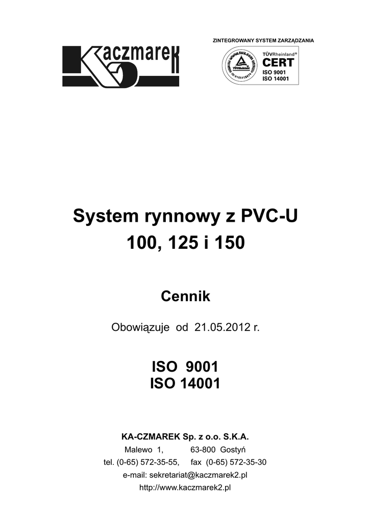 ZINTEGROWANY SYSTEM ZARZ¥DZANIA System rynnowy z PVC-U 100, 125 i 150 Cennik Obowi¹zuje od 21.05.2012 r. ISO 9001 ISO 14001 KA-CZMAREK Sp. z o.o. S.K.A. Malewo 1, tel. (0-65) 572-35-55, 63-800 Gostyñ fax (0-65) 572-35-30 e-mail: [email protected] http://www.kaczmarek2.pl SYSTEM RYNNOWY Z PVC - U ‘KAROLINA’ Normy, aprobaty techniczne: PN-EN 607 Nazwa artyku³u Wymiar Kolor Indeks J.M. [mm] Cena Iloœæ w op. [PLN] Karton Paleta Rynna dachowa PVC 100 x 3000 100 x 3000 100 x 3000 100 x 3000 100 x 4000 100 x 4000 100 x 4000 100 x 4000 br¹zowy grafitowy bia³y czarny br¹zowy grafitowy bia³y czarny 4951964300 4951962300 4951960300 4951969300 4951964400 4951962400 4951960400 4951969400 szt. szt. szt. szt. szt. szt. szt. szt. 30,60 30,60 30,60 35,17 40,79 40,79 40,79 46,90 5 5 5 5 5 5 5 5 425 425 425 425 425 425 425 425 125 x 3000 125 x 3000 125 x 3000 125 x 3000 125 x 3000 125 x 3000 125 x 4000 125 x 4000 125 x 4000 125 x 4000 125 x 4000 125 x 4000 br¹zowy 4952164300 grafitowy 4952162300 bia³y 4952160300 czarny 4952169300 czerwony 4952167300 ceglasty 4952163300 br¹zowy 4952164400 grafitowy 4952162400 bia³y 4952160400 czarny 4952169400 czerwony 4952167400 ceglasty 4952163400 szt. szt. szt. szt. szt. szt. szt. szt. szt. szt. szt. szt. 35,88 35,88 35,88 41,27 41,27 41,27 47,84 47,84 47,84 55,02 55,02 55,02 5 5 5 5 5 5 5 5 5 5 5 5 325 325 325 325 325 325 325 325 325 325 325 325 150 x 3000 150 x 3000 150 x 3000 150 x 4000 150 x 4000 150 x 4000 br¹zowy grafitowy bia³y br¹zowy grafitowy bia³y 4952364300 4952362300 4952360300 4952364400 4952362400 4952360400 szt. szt. szt. szt. szt. szt. 47,46 47,46 47,46 63,27 63,27 63,27 5 5 5 5 5 5 220 220 220 220 220 220 100 100 100 100 br¹zowy grafitowy bia³y czarny 5001194000 5001192000 5001190000 5001199000 szt. szt. szt. szt. 12,90 12,90 12,90 14,84 18 18 18 18 576 576 576 576 125 125 125 125 125 125 br¹zowy 5001214000 grafitowy 5001212000 bia³y 5001210000 czarny 5001219000 czerwony 5001217000 ceglasty 5001213000 szt. szt. szt. szt. szt. szt. 15,38 15,38 15,38 17,68 17,68 17,68 12 12 12 12 12 12 384 384 384 384 384 384 150 150 150 br¹zowy 5001234000 szt. grafitowy 5001232000 szt. bia³y 5001230000 szt. 18,63 18,63 18,63 9 9 9 288 288 288 Z³¹czka rynny Data: 21.05.2012 r. Obowi¹zuje cena w dniu odbioru towaru Podatek VAT - 23 % SYSTEM RYNNOWY Z PVC - U ‘KAROLINA’ Normy, aprobaty techniczne: PN-EN 607 Nazwa artyku³u Wymiar Kolor Indeks J.M. [mm] Cena Iloœæ w op. [PLN] Karton Paleta Lej spustowy 100 x 75 100 x 75 100 x 75 100 x 75 125 x 75 125 x 75 125 x 75 125 x 75 125 x 100 125 x 100 125 x 100 125 x 100 125 x 100 125 x 100 150 x 100 150 x 100 150 x 100 br¹zowy 5003424000 grafitowy 5003422000 bia³y 5003420000 czarny 5003429000 br¹zowy 5003594000 grafitowy 5003592000 bia³y 5003590000 czarny 5003599000 br¹zowy 5003624000 grafitowy 5003622000 bia³y 5003620000 czarny 5003629000 czerwony 5003627000 ceglasty 5003623000 br¹zowy 5003724000 grafitowy 5003722000 bia³y 5003720000 szt. szt. szt. szt. szt. szt. szt. szt. szt. szt. szt. szt. szt. szt. szt. szt. szt. 15,27 15,27 15,27 17,57 18,08 18,08 18,08 20,79 18,96 18,96 18,96 21,81 21,81 21,81 30,87 30,87 30,87 8 8 8 8 8 8 8 8 6 6 6 6 6 6 4 4 4 256 256 256 256 256 256 256 256 192 192 192 192 192 192 128 128 128 100 x 90 o 100 x 90 o o 100 x 90 100 x 90 o 125 x 90 o o 125 x 90 o 125 x 90 125 x 90 o o 125 x 90 o 125 x 90 150 x 90 o 150 x 90 o o 150 x 90 br¹zowy 5005194000 grafitowy 5005192000 bia³y 5005190000 czarny 5005199000 br¹zowy 5005214000 grafitowy 5005212000 bia³y 5005210000 czarny 5005219000 czerwony 5005217000 ceglasty 5005213000 br¹zowy 5005234000 grafitowy 5005232000 bia³y 5005230000 szt. szt. szt. szt. szt. szt. szt. szt. szt. szt. szt. szt. szt. 15,38 15,38 15,38 17,68 17,69 17,69 17,69 20,35 20,35 20,35 23,20 23,20 23,20 6 6 6 6 6 6 6 6 6 6 4 4 4 192 192 192 192 192 192 192 192 192 192 128 128 128 100 100 100 100 125 125 125 125 125 125 150 150 150 br¹zowy 5006194000 grafitowy 5006192000 bia³y 5006190000 czarny 5006199000 br¹zowy 5006214000 grafitowy 5006212000 bia³y 5006210000 czarny 5006219000 czerwony 5006217000 ceglasty 5006213000 br¹zowy 5006234000 grafitowy 5006232000 bia³y 5006230000 szt. szt. szt. szt. szt. szt. szt. szt. szt. szt. szt. szt. szt. 46,03 46,03 46,03 52,93 51,15 51,15 51,15 58,82 58,82 58,82 55,40 55,40 55,40 k¹t dowolny Naro¿nik zewnêtrzny Data: 21.05.2012 r. Obowi¹zuje cena w dniu odbioru towaru Podatek VAT - 23 % SYSTEM RYNNOWY Z PVC - U ‘KAROLINA’ Normy, aprobaty techniczne: PN-EN 607 Nazwa artyku³u Wymiar Kolor Indeks J.M. Cena netto Iloœæ w op. [mm] [PLN] Karton Paleta Naro¿nik wewnêtrzny br¹zowy 5007194000 grafitowy 5007192000 bia³y 5007190000 czarny 5007199000 br¹zowy 5007214000 grafitowy 5007212000 bia³y 5007210000 czarny 5007219000 czerwony 5007217000 ceglasty 5007213000 br¹zowy 5007234000 grafitowy 5007232000 bia³y 5007230000 szt. szt. szt. szt. szt. szt. szt. szt. szt. szt. szt. szt. szt. 15,38 15,38 15,38 17,68 17,69 17,69 17,69 20,35 20,35 20,35 23,20 23,20 23,20 100 100 100 100 125 125 125 125 125 125 150 150 150 br¹zowy 5008194000 grafitowy 5008192000 bia³y 5008190000 czarny 5008199000 br¹zowy 5008214000 grafitowy 5008212000 bia³y 5008210000 czarny 5008219000 czerwony 5008217000 ceglasty 5008213000 br¹zowy 5008234000 grafitowy 5008232000 bia³y 5008230000 szt. szt. szt. szt. szt. szt. szt. szt. szt. szt. szt. szt. szt. 46,03 46,03 46,03 52,93 51,15 51,15 51,15 58,82 58,82 58,82 55,40 55,40 55,40 prawe-lewe prawe-lewe prawe-lewe prawe-lewe 100 100 100 100 br¹zowy 5012194000 grafitowy 5012192000 bia³y 5012190000 czarny 5012199000 szt. szt. szt. szt. prawe-lewe prawe-lewe prawe-lewe prawe-lewe prawe-lewe prawe-lewe 125 125 125 125 125 125 br¹zowy 5012214000 grafitowy 5012212000 bia³y 5012210000 czarny 5012219000 czerwony 5012217000 ceglasty 5012213000 prawe-lewe prawe-lewe prawe-lewe 150 150 150 k¹t dowolny 100 x 90 o o 100 x 90 100 x 90 o 100 x 90 o o 125 x 90 o 125 x 90 125 x 90 o o 125 x 90 