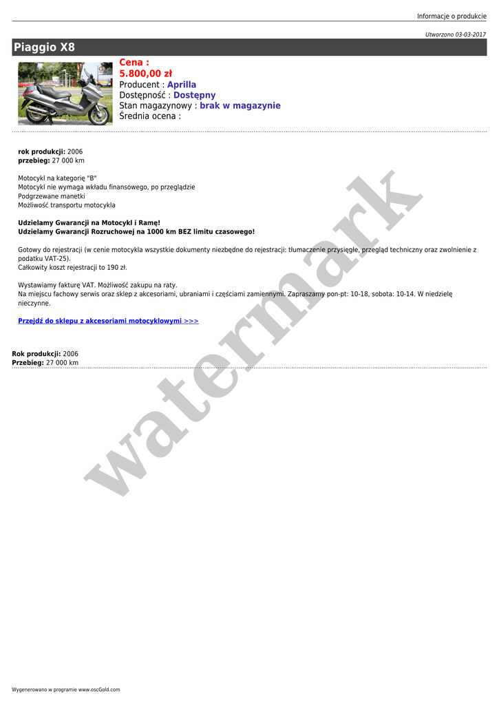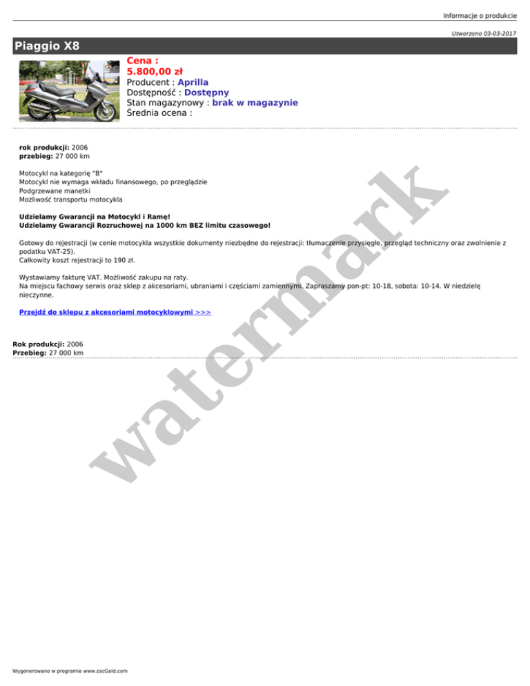 Informacje o produkcie Utworzono 03-03-2017 Piaggio X8 Cena : 5.800,00 zł Producent : Aprilla Dostępność : Dostępny Stan magazynowy : brak w magazynie Średnia ocena : rok produkcji: 2006 przebieg: 27 000 km er m ar k Motocykl na kategorię "B" Motocykl nie wymaga wkładu finansowego, po przeglądzie Podgrzewane manetki Możliwość transportu motocykla Udzielamy Gwarancji na Motocykl i Ramę! Udzielamy Gwarancji Rozruchowej na 1000 km BEZ limitu czasowego! Gotowy do rejestracji (w cenie motocykla wszystkie dokumenty niezbędne do rejestracji: tłumaczenie przysięgłe, przegląd techniczny oraz zwolnienie z podatku VAT-25). Całkowity koszt rejestracji to 190 zł. Wystawiamy fakturę VAT. Możliwość zakupu na raty. Na miejscu fachowy serwis oraz sklep z akcesoriami, ubraniami i częściami zamiennymi. Zapraszamy pon-pt: 10-18, sobota: 10-14. W niedzielę nieczynne. Przejdź do sklepu z akcesoriami motocyklowymi >>> w at Rok produkcji: 2006 Przebieg: 27 000 km Wygenerowano w programie www.oscGold.com