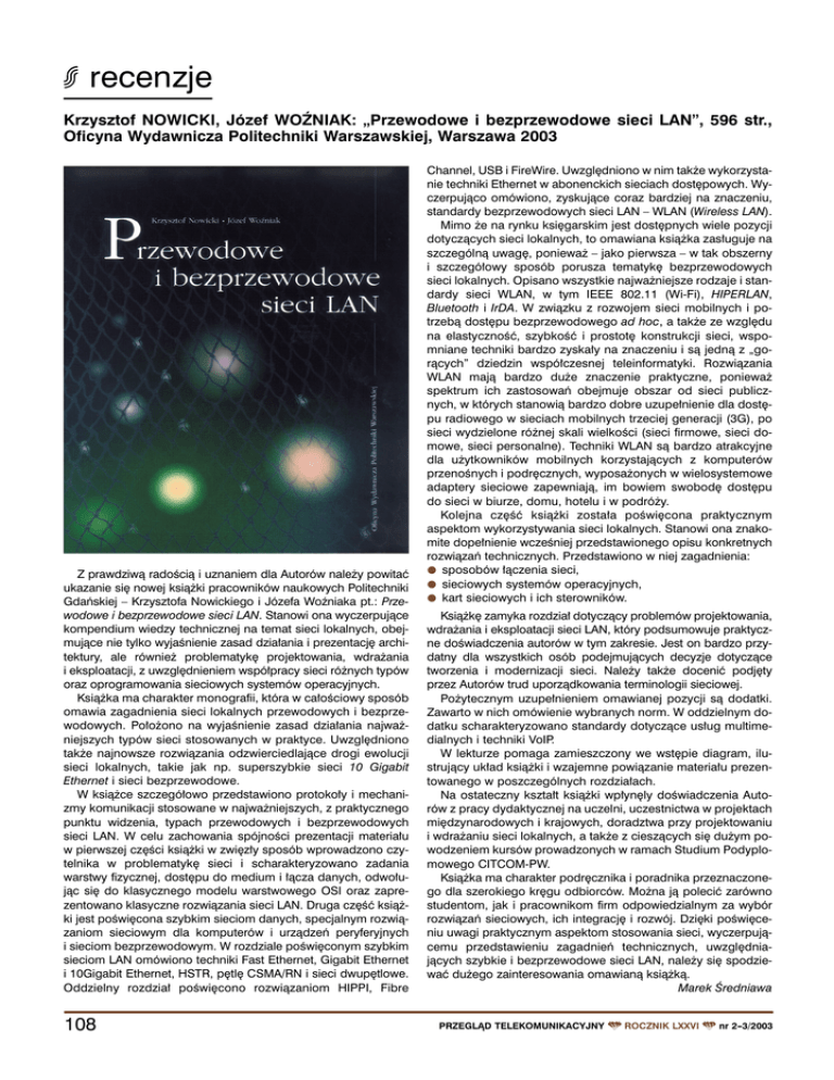 recenzje Krzysztof NOWICKI, Józef WOŹNIAK: „Przewodowe i bezprzewodowe sieci LAN”, 596 str., Oficyna Wydawnicza Politechniki Warszawskiej, Warszawa 2003 Z prawdziwą radością i uznaniem dla Autorów należy powitać ukazanie się nowej książki pracowników naukowych Politechniki Gdańskiej – Krzysztofa Nowickiego i Józefa Woźniaka pt.: Przewodowe i bezprzewodowe sieci LAN. Stanowi ona wyczerpujące kompendium wiedzy technicznej na temat sieci lokalnych, obejmujące nie tylko wyjaśnienie zasad działania i prezentację architektury, ale również problematykę projektowania, wdrażania i eksploatacji, z uwzględnieniem współpracy sieci różnych typów oraz oprogramowania sieciowych systemów operacyjnych. Książka ma charakter monografii, która w całościowy sposób omawia zagadnienia sieci lokalnych przewodowych i bezprzewodowych. Położono na wyjaśnienie zasad działania najważniejszych typów sieci stosowanych w praktyce. Uwzględniono także najnowsze rozwiązania odzwierciedlające drogi ewolucji sieci lokalnych, takie jak np. superszybkie sieci 10 Gigabit Ethernet i sieci bezprzewodowe. W książce szczegółowo przedstawiono protokoły i mechanizmy komunikacji stosowane w najważniejszych, z praktycznego punktu widzenia, typach przewodowych i bezprzewodowych sieci LAN. W celu zachowania spójności prezentacji materiału w pierwszej części książki w zwięzły sposób wprowadzono czytelnika w problematykę sieci i scharakteryzowano zadania warstwy fizycznej, dostępu do medium i łącza danych, odwołując się do klasycznego modelu warstwowego OSI oraz zaprezentowano klasyczne rozwiązania sieci LAN. Druga część książki jest poświęcona szybkim sieciom danych, specjalnym rozwiązaniom sieciowym dla komputerów i urządzeń peryferyjnych i sieciom bezprzewodowym. W rozdziale poświęconym szybkim sieciom LAN omówiono techniki Fast Ethernet, Gigabit Ethernet i 10Gigabit Ethernet, HSTR, pętlę CSMA/RN i sieci dwupętlowe. Oddzielny rozdział poświęcono rozwiązaniom HIPPI, Fibre 108 Channel, USB i FireWire. Uwzględniono w nim także wykorzystanie techniki Ethernet w abonenckich sieciach dostępowych. Wyczerpująco omówiono, zyskujące coraz bardziej na znaczeniu, standardy bezprzewodowych sieci LAN – WLAN (Wireless LAN). Mimo że na rynku księgarskim jest dostępnych wiele pozycji dotyczących sieci lokalnych, to omawiana książka zasługuje na szczególną uwagę, ponieważ – jako pierwsza – w tak obszerny i szczegółowy sposób porusza tematykę bezprzewodowych sieci lokalnych. Opisano wszystkie najważniejsze rodzaje i standardy sieci WLAN, w tym IEEE 802.11 (Wi-Fi), HIPERLAN, Bluetooth i IrDA. W związku z rozwojem sieci mobilnych i potrzebą dostępu bezprzewodowego ad hoc, a także ze względu na elastyczność, szybkość i prostotę konstrukcji sieci, wspomniane techniki bardzo zyskały na znaczeniu i są jedną z „gorących” dziedzin współczesnej teleinformatyki. Rozwiązania WLAN mają bardzo duże znaczenie praktyczne, ponieważ spektrum ich zastosowań obejmuje obszar od sieci publicznych, w których stanowią bardzo dobre uzupełnienie dla dostępu radiowego w sieciach mobilnych trzeciej generacji (3G), po sieci wydzielone różnej skali wielkości (sieci firmowe, sieci domowe, sieci personalne). Techniki WLAN są bardzo atrakcyjne dla użytkowników mobilnych korzystających z komputerów przenośnych i podręcznych, wyposażonych w wielosystemowe adaptery sieciowe zapewniają, im bowiem swobodę dostępu do sieci w biurze, domu, hotelu i w podróży. Kolejna część książki została poświęcona praktycznym aspektom wykorzystywania sieci lokalnych. Stanowi ona znakomite dopełnienie wcześniej przedstawionego opisu konkretnych rozwiązań technicznych. Przedstawiono w niej zagadnienia: M sposobów łączenia sieci, M sieciowych systemów operacyjnych, M kart sieciowych i ich sterowników. Książkę zamyka rozdział dotyczący problemów projektowania, wdrażania i eksploatacji sieci LAN, który podsumowuje praktyczne doświadczenia autorów w tym zakresie. Jest on bardzo przydatny dla wszystkich osób podejmujących decyzje dotyczące tworzenia i modernizacji sieci. Należy także docenić podjęty przez Autorów trud uporządkowania terminologii sieciowej. Pożytecznym uzupełnieniem omawianej pozycji są dodatki. Zawarto w nich omówienie wybranych norm. W oddzielnym dodatku scharakteryzowano standardy dotyczące usług multimedialnych i techniki VoIP. W lekturze pomaga zamieszczony we wstępie diagram, ilustrujący układ książki i wzajemne powiązanie materiału prezentowanego w poszczególnych rozdziałach. Na ostateczny kształt książki wpłynęly doświadczenia Autorów z pracy dydaktycznej na uczelni, uczestnictwa w projektach międzynarodowych i krajowych, doradztwa przy projektowaniu i wdrażaniu sieci lokalnych, a także z cieszących się dużym powodzeniem kursów prowadzonych w ramach Studium Podyplomowego CITCOM-PW. Książka ma charakter podręcznika i poradnika przeznaczonego dla szerokiego kręgu odbiorców. Można ją polecić zarówno studentom, jak i pracownikom firm odpowiedzialnym za wybór rozwiązań sieciowych, ich integrację i rozwój. Dzięki poświęceniu uwagi praktycznym aspektom stosowania sieci, wyczerpującemu przedstawieniu zagadnień technicznych, uwzględniających szybkie i bezprzewodowe sieci LAN, należy się spodziewać dużego zainteresowania omawianą książką. Marek Średniawa PRZEGLĄD TELEKOMUNIKACYJNY ROCZNIK LXXVI nr 2--3/2003