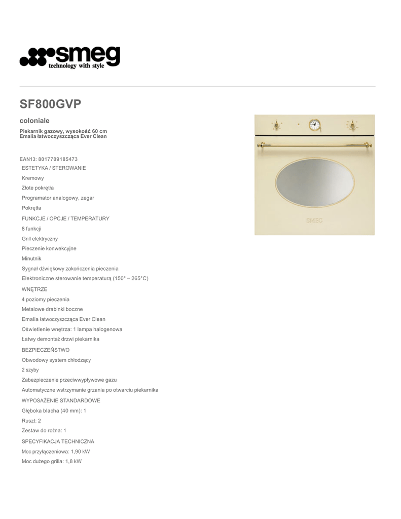 SF800GVP coloniale Piekarnik gazowy, wysokość 60 cm Emalia łatwoczyszcząca Ever Clean EAN13: 8017709185473 ESTETYKA / STEROWANIE Kremowy Złote pokrętła Programator analogowy, zegar Pokrętła FUNKCJE / OPCJE / TEMPERATURY 8 funkcji Grill elektryczny Pieczenie konwekcyjne Minutnik Sygnał dźwiękowy zakończenia pieczenia Elektroniczne sterowanie temperaturą (150° – 265°C) WNĘTRZE 4 poziomy pieczenia Metalowe drabinki boczne Emalia łatwoczyszcząca Ever Clean Oświetlenie wnętrza: 1 lampa halogenowa Łatwy demontaż drzwi piekarnika BEZPIECZEŃSTWO Obwodowy system chłodzący 2 szyby Zabezpieczenie przeciwwypływowe gazu Automatyczne wstrzymanie grzania po otwarciu piekarnika WYPOSAŻENIE STANDARDOWE Głęboka blacha (40 mm): 1 Ruszt: 2 Zestaw do rożna: 1 SPECYFIKACJA TECHNICZNA Moc przyłączeniowa: 1,90 kW Moc dużego grilla: 1,8 kW Napięcie: 220-240 V Zabezpieczenie: 9 A Częstotliwość: 50 Hz Functions Wersje SF800GVPO - kremowy, pokrętła z mosiądzu SMEG S.p.A. Via Leonardo da Vinci, 4 42016 Guastalla (RE) Tel. 0522 821 1 SF800GVP coloniale 60 cm kremowy gazowe PIEKARNIKI GAZOWE Z OBIEGIEM POWIETRZA: Niektóre modele kuchni gazowych posiadają konwektor, dzięki któremu można piec jednocześnie różne potrawy bez mieszania się zapachów- co istotnie oszczędza czas. STATYCZNY SYSTEM CHŁODZENIA: Innowacyjny STATYCZNY system chłodzenia pomaga chronić meble od nadmiernej temperatury podczas pracy urządzenia. WEWNĘTRZNA OBJĘTOŚĆ: Komora kuchni wolnostojącej 60 l (brutto is 68 l) EMALIA ŁATWOCZYSZCZĄCA EVER CLEAN: Emalia, którą jest pokryte wnętrze piekarników. Jest niezwykle łatwa w czyszczeniu, ze względu na znikomą interakcję z tłuszczami i odporność na różne kwasy. GRZAŁKA GRILLA: Funkcja uzywana do szybkiego podgrzewania. Aby uzyskać najlepsze rezultaty należy małe potrawy umieścić na górnej półce, a potrawy większe - na dolnej (np. mięso, lub kiełbasę). Najlepsze efekty uzyskuje się przy zamkniętych drzwiczkach, chyba że przepis podpowiada co innego. GRZAŁKA DOLNA: Funkcja ta jest najbardziej odpowiednia do przygotowania potraw wymagających wysokiej temepratury od spodu, bez potrzeby przypiekania lub do powolnego pieczenia. Do ciast, pizzy, potrawek, lub zapiekanek. WENTYLATOR I GRZAŁKA GRILLA: Pieczenie przy uzyciu tej funkcji musi przebiegać przy zamkniętych drzwiczkach. Wentylator łagodzi silne grzanie grilla, jednocześnie zapewniając doskonałe grillowanie bez potrzeby odwracania pieczonej potrawy. Otrzymujemy potrawę doskonale przypieczoną, a zarazem soczystą. Najlepsze efekty zapewnia pieczenie na dwóch górnych półkach. Dolna część piekarnika może być w tym czasie wykorzystana do podgrzania innych potraw. WENTYLATOR, GRZAŁKA DOLNA: Dodanie dolnej grzałki do wymuszonego obiegu podnosi temperaturę w dolnej części potrawy, zapewniając jej skuteczniejsze pieczenie środka bez przypiekania powierzchni. ROŻEN ORAZ GRZAŁKA GRILLA: Ten symbol pozwala na wybranie funkcji rożna z całą grzałką grilla. ROŻEN, WENTYLATOR I DOLNA GRZAŁKA: Ten symbol pozwala na wybranie funkcji rożna z grzałką dolną i wentylatorem obiegu powietrza. ROŻEN, WENTYLATOR I GRZAŁKA GRILLA: Ten symbol pozwala na wybranie funkcji rożna z grzałką grilla i wentylatorem obiegu powietrza. ROŻEN, palnik dolny piekarnika: Ten symbol pozwala na wybranie funkcji rożna z pracującym dolnym palnikiem. SMEG S.p.A. Via Leonardo da Vinci, 4 42016 Guastalla (RE) Tel. 0522 821 1 SF800GVP coloniale 60 cm kremowy gazowe SMEG S.p.A. Via Leonardo da Vinci, 4 42016 Guastalla (RE) Tel. 0522 821 1