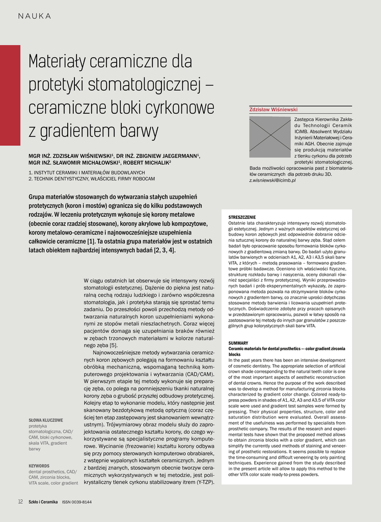 NAUKA Materiały ceramiczne dla protetyki stomatologicznej – ceramiczne bloki cyrkonowe z gradientem barwy Mgr inż. Zdzisław Wiśniewski1, Dr inż. Zbigniew Jaegermann1, Mgr inż. Sławomir Michałowski1, Robert Michalik2 1. Instytut Ceramiki i Materiałów Budowlanych 2. technik dentystyczny, właściciel firmy ROBOCAM Grupa materiałów stosowanych do wytwarzania stałych uzupełnień protetycznych (koron i mostów) ogranicza się do kilku podstawowych rodzajów. W leczeniu protetycznym wykonuje się korony metalowe (obecnie coraz rzadziej stosowane), korony akrylowe lub kompozytowe, korony metalowo-ceramiczne i najnowocześniejsze uzupełnienia całkowicie ceramiczne [1]. Ta ostatnia grupa materiałów jest w ostatnich latach obiektem najbardziej intensywnych badań [2, 3, 4]. Słowa kluczowe protetyka stomatologiczna, CAD/ CAM, bloki cyrkonowe, skala VITA, gradient barwy Keywords dental prosthetics, CAD/ CAM, zirconia blocks, VITA scale, color gradient 12 W ciągu ostatnich lat obserwuje się intensywny rozwój stomatologii estetycznej. Dążenie do piękna jest naturalną cechą rodzaju ludzkiego i zarówno współczesna stomatologia, jak i protetyka starają się sprostać temu zadaniu. Do przeszłości powoli przechodzą metody odtwarzania naturalnych koron uzupełnieniami wykonanymi ze stopów metali nieszlachetnych. Coraz więcej pacjentów domaga się uzupełniania braków również w zębach trzonowych materiałami w kolorze naturalnego zęba [5]. Najnowocześniejsze metody wytwarzania ceramicznych koron zębowych polegają na formowaniu kształtu obróbką mechaniczną, wspomaganą techniką komputerowego projektowania i wytwarzania (CAD/CAM). W pierwszym etapie tej metody wykonuje się preparację zęba, co polega na pomniejszeniu tkanki naturalnej korony zęba o grubość przyszłej odbudowy protetycznej. Kolejny etap to wykonanie modelu, który następnie jest skanowany bezdotykową metodą optyczną (coraz częściej ten etap zastępowany jest skanowaniem wewnątrzustnym). Trójwymiarowy obraz modelu służy do zaprojektowania ostatecznego kształtu korony, do czego wykorzystywane są specjalistyczne programy komputerowe. Wycinanie (frezowanie) kształtu korony odbywa się przy pomocy sterowanych komputerowo obrabiarek, z wstępnie wypalonych kształtek ceramicznych. Jednym z bardziej znanych, stosowanym obecnie tworzyw ceramicznych wykorzystywanych w tej metodzie, jest polikrystaliczny tlenek cyrkonu stabilizowany itrem (Y-TZP). Szkło i Ceramika ISSN 0039-8144 Zdzisław Wiśniewski Zastępca Kierownika Zakładu Technologii Ceramik ICiMB. Absolwent Wydziału Inżynierii Materiałowej i Ceramiki AGH. Obecnie zajmuje się produkcją materiałów z tlenku cyrkonu dla potrzeb protetyki stomatologicznej. Bada możliwości opracowania past z biomateriałów ceramicznych dla potrzeb druku 3D. [email protected] Streszczenie Ostatnie lata charakteryzuje intensywny rozwój stomatologii estetycznej. Jednym z ważnych aspektów estetycznej odbudowy koron zębowych jest odpowiednie dobranie odcienia sztucznej korony do naturalnej barwy zęba. Stąd celem badań było opracowanie sposobu formowania bloków cyrkonowych z gradientową zmianą barwy. Do badań użyto granulatów barwionych w odcieniach A1, A2, A3 i A3,5 skali barw VITA, z których – metodą prasowania – formowano gradientowe próbki badawcze. Oceniono ich właściwości fizyczne, strukturę rozkładu barwy i nasycenia, oceny dokonali również specjaliści z firmy protetycznej. Wyniki przeprowadzonych badań i prób eksperymentalnych wykazały, że zaproponowana metoda pozwala na otrzymywanie bloków cyrkonowych z gradientem barwy, co znacznie uprości dotychczas stosowane metody barwienia i licowania uzupełnień protetycznych. Doświadczenie zdobyte przy pracach opisanych w przedstawionym opracowaniu, pozwoli w łatwy sposób na zastosowanie tej metody do innych par granulatów z poszczególnych grup kolorystycznych skali barw VITA. Summary Ceramic materials for dental prosthetics –- color gradient zirconia blocks In the past years there has been an intensive development of cosmetic dentistry. The appropriate selection of artificial crown shade corresponding to the natural teeth color is one of the most important aspects of aesthetic reconstruction of dental crowns. Hence the purpose of the work described was to develop a method for manufacturing zirconia blocks characterized by gradient color change. Colored ready-topress powders in shades of A1, A2, A3 and A3.5 of VITA color scale were used and gradient test samples were formed by pressing. Their physical properties, structure, color and saturation distribution were evaluated. Overall assessment of the usefulness was performed by specialists from prosthetic company. The results of the research and experimental tests have shown that the proposed method allows to obtain zirconia blocks with a color gradient, which can simplify the currently used methods of staining and veneering of prosthetic restorations. It seems possible to replace the time-consuming and difficult veneering by only painting techniques. Experience gained from the study described in the present article will allow to apply this method to the other VITA color scale ready-to-press powders. NAUKA Wycięte korony barwi się przez zanurzenie w płynach barwiących, a następnie wypala. W ostatniej fazie procesu wykonuje się licowanie (szkliwienie) koron wieloma warstwami materiałów szklanych lub szkło-ceramicznych [6-9]. Jednym z ważnych aspektów estetycznej odbudowy koron zębowych jest odpowiednie dobranie odcienia sztucznej korony do naturalnego zęba. Z jednej strony wykonuje się to barwiąc cyrkonowy materiał konstrukcyjny, z drugiej – dobierając odpowiednie materiały do procesu licowania. Barwne konstrukcje protetyczne można uzyskać używając do prasowania bloków cyrkonowych gotowego granulatu barwnego. Jednak najczęściej stosowaną metodą jest barwienie wyciętych konstru