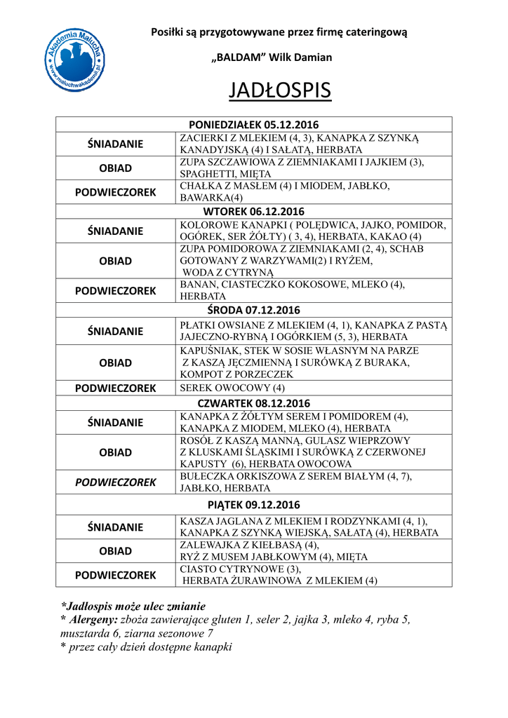 Posiłki są przygotowywane przez firmę cateringową „BALDAM” Wilk Damian JADŁOSPIS PONIEDZIAŁEK 05.12.2016 ŚNIADANIE OBIAD PODWIECZOREK ZACIERKI Z MLEKIEM (4, 3), KANAPKA Z SZYNKĄ KANADYJSK (4) I SAŁATĄ, HERBATA KANADYJSKĄ ZUPA SZCZAWIOWA Z ZIEMNIAKAMI ZIEMNIAKAMI I JAJKIEM (3), SPAGHETTI, MIĘTA CHAŁK Z MASŁEM (4) I MIODEM, JABŁKO, CHAŁKA BAWARKA(4) WTOREK 06.12.2016 ŚNIADANIE OBIAD PODWIECZOREK KOLOROWE KANAPKI ( POLĘDWICA, POL DWICA, JAJKO, JA POMIDOR, OGÓREK, SER ŻÓŁTY) ( 3, 4), HERBATA, KAKAO (4) ZUPA POMIDOROWA Z ZIEMNIAKAMI (2, 4), SCHAB GOTOWANY Z WARZYWAMI(2) I RYŻEM ŻEM, WODA Z CYTRYNĄ CYTRYN BANAN, CIASTECZKO KOKOSOWE, MLEKO (4), HERBATA ŚRODA 07.12.2016 ŚNIADANIE OBIAD PODWIECZOREK PŁATKI OWSIANE Z MLEKIEM (4, 1), KANAPKA Z PASTĄ JAJECZNO JAJECZNO-RYBNĄ I OGÓRKIEM (5, 3), HERBATA KAPU KAPUŚNIAK, STEK W SOSIE WŁASNYM NA PARZE Z KASZĄ KASZ JĘCZMIENNĄ I SURÓWKĄ Ą Z BURAKA, BURAKA KOMPOT Z PORZECZEK SEREK OWOCOWY (4) CZWARTEK 08.12.2016 ŚNIADANIE OBIAD PODWIECZOREK KANAPKA Z ŻÓŁTYM ÓŁTYM SEREM I POMIDOREM (4), KANAPKA Z MIODEM, MLEKO (4), HERBATA ROSÓŁ Z KASZĄ KASZ MANNĄ,, GULASZ WIEPRZOWY Z KLUSKAMI ŚLĄSKIMI I SURÓWKĄ Z CZERWONEJ KAPUSTY (6), HERBATA OWOCOWA BUŁECZKA ORKISZOWA Z SEREM BIAŁYM (4, 7), JABŁKO, HERBATA PIĄTEK 09.12.2016 ŚNIADANIE OBIAD PODWIECZOREK KASZA JAGLANA Z MLEKIEM I RODZYNKAMI (4, 1), KANAPKA Z SZYNKĄ SZYNK WIEJSKĄ, SAŁATĄ (4), HERBATA ZALEWAJKA Z KIEŁBASĄ KIEŁBAS (4), RYŻ Z MUSEM JABŁKOWYM (4), MIĘTA ĘTA CIASTO CYTRYNOWE (3), HERBATA ŻURAWINOWA Z MLEKIEM (4) *Jadłospis możee ulec zmianie * Alergeny: zbożaa zawierające zawierają gluten 1, seler 2, jajka 3, mleko 4, ryba 5, musztarda 6, ziarna sezonowe 7 * przez cały dzień dostępne ępne kanapki