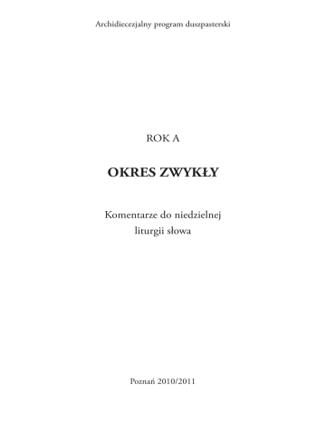 Archidiecezjalny program duszpasterski ROK A Okres Zwykły Komentarze do niedzielnej liturgii słowa Poznań 2010/2011 17 XXIII niedziela zwykła Ez 33,7-9; Ps 95; Rz 13,8-10; Mt 18,15-20 Wiara nie jest naszą „sprawą prywatną”. Do Boga nie idzie się w pojedynkę, lecz we wspólnocie Kościoła. Musimy więc mieć na uwadze nie tylko naszą osobistą świętość, ale i dobro drugiego człowieka. Jeżeli trzeba, z miłością powinniśmy napominać naszego brata i siostrę, aby uchronić ich przed złem, na które mogą być narażeni. Chrześcijanin ma obowiązek „mieszać się” w życie innego człowieka, tak jak Jezus „wmieszał się” w nasze życie. Niech nasza miłość, przez podobieństwo do Jego miłości, nawet w napominaniu niesie dobro. XXIV niedziela zwykła Syr 27,30-28,7; Ps 103; Rz 14,7-9; Mt 18,21-35 „Gdy człowiek żywi złość przeciw drugiemu, jakże u Pana szukać będzie uzdrowienia?” Bóg okazuje nam miłosierdzie i przebaczenie. Takie samo powinno być i nasze postępowanie. Jeśli miłość Boża zmazuje nasz grzech, to o wszelkich ludzkich urazach, które są przecież o wiele mniej ważne od grzechu, powinniśmy zapomnieć. Pan oddala od nas swój gniew. I my oddalmy nasz gniew od tych, którzy nas skrzywdzili. XXV niedziela zwykła Iz 55,6-9; Ps 145; Flp 1,20c-24.27a; Mt 20,1-16a „Bo jak niebiosa górują nad ziemią, tak drogi moje nad waszymi drogami i myśli moje nad myślami waszymi”. Ludzki umysł nie jest w stanie zrozumieć Bożych zamysłów. Może tylko stanąć z podziwem wobec cudów stworzenia, zdumieć się bezmiarem miłości i dobroci Boga i wielbić Go za każdym razem, gdy niezasłużenie doznaje Bożej łaski. Nawet, jeśli będziemy najmądrzejsi i najbardziej pobożni, działanie Pana będzie dla nas tajemnicą, a otrzymane od Niego zbawienie – łaską. 18 XXVI niedziela zwykła Ez 18,25-28; Ps 25; Flp 2,1-11; Mt 21,28-32 Łatwo jest ulec iluzji bycia „dobrym człowiekiem”. Lecz jeśli uznamy, że jesteśmy już tak pobożni, że nie trzeba nam nic więcej, wtedy przyjdą pokusa i zwątpienie. Nie wystarczy powiedzieć Bogu „tak”. Trzeba swoją zgodę na Jego obecność poświadczyć własnym życiem. Jeżeli nie będziemy szukać mocy w Panu, nie pozostaniemy Mu wierni. Obyśmy – tak jak Chrystus – potrafili stać się Jego pokornymi sługami, by tym większe mogło nas spotkać wyniesienie. XXVII niedziela zwykła Iz 5,1-7; Ps 80; Flp 4,6-9; Mt 21,33-43 „Nie wyście Mnie wybrali, ale Ja was wybrałem, abyście szli i owoc przynosili”. Jakimi winoroślami jesteśmy? Czy przynosimy słodkie czy gorzkie owoce? Ile jest w naszym życiu służby, posłuszeństwa Bożemu słowu, ile szukania siebie i własnych korzyści? Tylko oddając Panu wszystko w modlitwie i pełniąc Jego wolę, możemy żyć szczęśliwie i oczekiwać na radość wieczną. XXVIII niedziela zwykła Iz 25,6-10a; Ps 23; Flp 4,12-14.19-20; Mt 22,1-14 Dziś Pan zaprasza na ucztę. Wzywa nas z dróg i opłotków, nas – zwyczajnych, takich - jakimi jesteśmy. On przygotował dla nas najwyborniejsze mięsa i wina, chce zaspokoić wszystkie nasze potrzeby, a nawet dać nam więcej niż oczekujemy. Wszystko możemy w Tym, który nas umacnia. Przyobleczmy się tylko w szatę wiary, byśmy nie zostali wyproszeni w dniu, który powinien być naszą największą radością. XXIX niedziela zwykła Iz 45,1.4-6; Ps 96; 1 Tes 1,1-5b; Mt 22,15-21 Co w naszym życiu należy do „cezara”, a co do Boga? Czy mamy prawo wyznaczać Panu granice tego, co Mu się od nas „należy”? To nie my wybieramy Boga, lecz 19 On nas wybiera. To w Nim mieszkają i chwała, i moc, która może nas uzdolnić do wielkich czynów. Bez Niego nie możemy nic. Oby Jezus, zaglądając w nasze serca, zobaczył w nich miejsce otwarte na Niego, by sam mógł przemieniać nasze życie. XXX niedziela zwykła Wj 22,20-26; Ps 18; 1 Tes 1,5c-10; Mt 22,34-40 Miłość. W tym słowie streszcza się cała nauka Boga. Ukochać Pana. A miłując swojego Stwórcę, pokochać również Jego stworzenie. Tylko okazując sobie wzajemnie dobroć i życzliwość, możemy stać się znakiem Bożej łaski. Do tego powołał nas Bóg i w tym pragnie umocnić nas swoją mocą. Wtedy ludzie ujrzą w nas Boga i pozna Go świat. A On sam przyjdzie mieszkać w naszych sercach, byśmy stanowili z Nim jedno. XXXI niedziela zwykła Ml 1,14b-2,2b.8-10; Ps 131; 1 Tes 2,7b-9,13; Mt 23,1-12 Osądzamy i pouczamy innych. Wiemy, co jest dla nich najlepsze. Czy jednak jesteśmy gotowi wziąć na siebie odpowiedzialność za świętość tych, którzy nam zaufali? A może przez nasze słowa odeszli od Boga? Tak jak dziecko jest spokojne w ramionach swojej matki, tak dusza człowieka ma spoczywać bezpiecznie w Bogu. Musimy tylko porzucić naszą przemądrzałość. Trzeba nam stać się jak małe dziecko; powinniśmy nie tylko zaufać Bogu, lecz także zwrócić się do Niego w naszych pragnieniach i działaniach, rezygnując z własnej chwały. Wtedy On będzie mógł nas napełnić swoją łaską. (oprac.) Joanna Krych 20