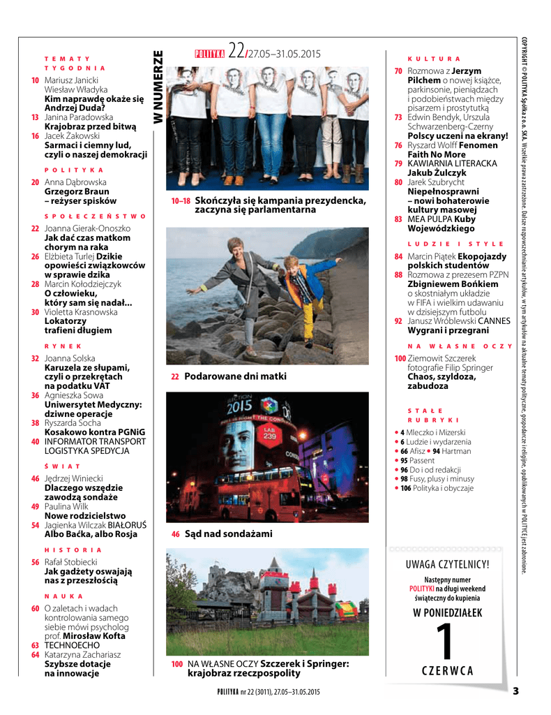 W NUMERZE 10 Mariusz Janicki Wiesław Władyka Kim naprawdę okaże się Andrzej Duda? 13 Janina Paradowska Krajobraz przed bitwą 16 Jacek Żakowski Sarmaci i ciemny lud, czyli o naszej demokracji 22/27.05–31.05.2015 P O L I T Y K A 20 Anna Dąbrowska Grzegorz Braun – reżyser spisków S P O Ł E C Z E Ń S T W O 10–18 Skończyła się kampania prezydencka, zaczyna się parlamentarna 22 Joanna Gierak-Onoszko Jak dać czas matkom chorym na raka 26 Elżbieta Turlej Dzikie opowieści związkowców w sprawie dzika 28 Marcin Kołodziejczyk O człowieku, który sam się nadał... 30 Violetta Krasnowska Lokatorzy trafieni długiem L U D Z I E N A 22 Podarowane dni matki I S T Y L E W Ł A S N E O C Z Y 100 Ziemowit Szczerek fotografie Filip Springer Chaos, szyldoza, zabudoza S T A Ł E R U B R Y K I • 4 Mleczko i Mizerski • 6 Ludzie i wydarzenia • 66 Afisz • 94 Hartman • 95 Passent • 96 Do i od redakcji • 98 Fusy, plusy i minusy • 106 Polityka i obyczaje Ś W I A T 46 Jędrzej Winiecki Dlaczego wszędzie zawodzą sondaże 49 Paulina Wilk Nowe rodzicielstwo 54 Jagienka Wilczak BIAŁORUŚ Albo Baćka, albo Rosja K U L T U R A 70 Rozmowa z Jerzym Pilchem o nowej książce, parkinsonie, pieniądzach i podobieństwach między pisarzem i prostytutką 73 Edwin Bendyk, Urszula Schwarzenberg-Czerny Polscy uczeni na ekrany! 76 Ryszard Wolff Fenomen Faith No More 79 KAWIARNIA LITERACKA Jakub Żulczyk 80 Jarek Szubrycht Niepełnosprawni – nowi bohaterowie kultury masowej 83 MEA PULPA Kuby Wojewódzkiego 84 Marcin Piątek Ekopojazdy polskich studentów 88 Rozmowa z prezesem PZPN Zbigniewem Bońkiem o skostniałym układzie w FIFA i wielkim udawaniu w dzisiejszym futbolu 92 Janusz Wróblewski CANNES Wygrani i przegrani R Y N E K 32 Joanna Solska Karuzela ze słupami, czyli o przekrętach na podatku VAT 36 Agnieszka Sowa Uniwersytet Medyczny: dziwne operacje 38 Ryszarda Socha Kosakowo kontra PGNiG 40 INFORMATOR TRANSPORT LOGISTYKA SPEDYCJA COPYRIGHT © POLITYKA Spółka z o.o. SKA. Wszelkie prawa zastrzeżone. Dalsze rozpowszechnianie artykułów, w tym artykułów na aktualne tematy polityczne, gospodarcze i religijne, opublikowanych w POLITYCE jest zabronione. T E M A T Y T Y G O D N I A 46 Sąd nad sondażami H I S T O R I A 56 Rafał Stobiecki Jak gadżety oswajają nas z przeszłością UWAGA CZYTELNICY! Następny numer POLITYKI na długi weekend świąteczny do kupienia N A U K A 60 O zaletach i wadach kontrolowania samego siebie mówi psycholog prof. Mirosław Kofta 63 TECHNOECHO 64 Katarzyna Zachariasz Szybsze dotacje na innowacje W PONIEDZIAŁEK 100 NA WŁASNE OCZY Szczerek i Springer: krajobraz rzeczpospolity P OL I T Y K A nr 22 (3011), 27.05–31.05.2015 1 CZERWCA 3
