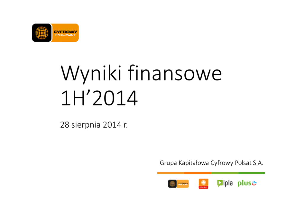 Wyniki finansowe W iki fi 1H’2014 28 sierpnia 2014 r. G Grupa Kapitałowa Cyfrowy Polsat S.A. K it ł C f P l tSA Oświadczenie IInformacje f j zawarte t w niniejszej i i j j prezentacji t ji mogą zawierać i ć stwierdzenia t i d i odnoszące d się i do d przyszłych ł h oczekiwań, ki ń rozumiane i j k jako wszystkie stwierdzenia (z wyjątkiem dotyczących faktów historycznych) w odniesieniu do naszych wyników finansowych, strategii biznesowej oraz celów i planów dotyczących przyszłej działalności (łącznie z planami odnośnie rozwoju naszych produktów i usług). Stwierdzenia te nie stanowią gwarancji przyszłych wyników oraz wiążą się z ryzykiem i brakiem pewności realizacji tych oczekiwań, oczekiwań gdyż ze swej natury podlegają wielu założeniom, założeniom ryzykom i niepewności. niepewności Rzeczywiste wyniki mogą zasadniczo różnić się od tych, które wyrażono lub których można oczekiwać na podstawie stwierdzeń odnoszących się do przyszłych oczekiwań. Nawet jeśli nasze wyniki finansowe, strategia biznesowa oraz cele i plany dotyczące naszej przyszłej działalności są zgodne z zawartymi w prezentacji stwierdzeniami dotyczącymi przyszłych oczekiwań, nie musi to oznaczać, że te stwierdzenia będą prawdziwe dla kolejnych okresów. okresów Stwierdzenia te wyrażają nasze stanowisko na dzień sporządzenia prezentacji. prezentacji Nie podejmujemy żadnego zobowiązania do publikowania jakichkolwiek korekt czy aktualizacji stwierdzeń zawartych w prezentacji w celu odzwierciedlenia zmian naszych oczekiwań, zmian okoliczności, na których oparte zostały te stwierdzenia czy też zdarzeń zaistniałych po dacie sporządzenia niniejszej prezentacji. W związku z rozpoczętą z dniem 7 maja 2014 r.r konsolidacją wyników Metelem Holding Company Limited, Limited pośrednio kontrolującej Polkomtel, Spółka postanowiła dostosować sposób prezentacji danych operacyjnych do nowej struktury i sposobu działania naszej Grupy. W poniższej prezentacji przedstawiony został nowy układ wskaźników operacyjnych (KPI) obejmujących naszą działalność w obszarach telekomunikacji i płatnej telewizji. Prezentowane wskaźniki operacyjne sprzed tego okresu mają jedynie charakter informacyjny oraz przedstawiają, przedstawiają jaki wpływ na wyniki operacyjne Grupy miałyby wyniki operacyjne grupy Metelem, a w szczególności Polkomtelu, gdyby wchodziła ona w skład Grupy Polsat w porównywanych okresach. Wskaźniki te zostały przygotowane wyłącznie w celach ilustracyjnych i ze względu na swój charakter prezentują hipotetyczną sytuację, dlatego też nie przedstawiają rzeczywistych wyników operacyjnych Grupy za dane okresy. Spis treści p 1. Najważniejsze wydarzenia 2. 2 Działalność operacyjna Działalność operacyjna 3. Realizacja synergii j y g 4. Wyniki finansowe 5. Podsumowanie 6 Q&A 6. 1. Najważniejsze wydarzenia D i ik Libi ki Dominik Libicki Prezes Zarządu Wydarzenia korporacyjne y p yj • Finalizacja transakcji nabycia Metelem j j y Holding Company Limited, pośrednio g p y p kontrolującej Polkomtel („Plus”) • Konsolidacja wyników finansowych począwszy od 7 maja 2014 r. • Zakończenie I etapu refinansowania • Nowa umowa kredytowa CP • Spłata Spłata starego kredytu bankowego CP, umorzenie obligacji Senior Notes CP (7,125%), starego kredytu bankowego CP umorzenie obligacji Senior Notes CP (7 125%) umorzenie obligacji PIK PLK (14,25%) • Efekt: znaczące obniżenie kosztów finansowania bieżącej działalności Grupy • Kontynuacja procesu integracji operacyjnej pomiędzy Cyfrowym Polsatem i Polkomtelem • Powołanie Powołanie z dniem 1 września 2014 r. Tobiasa Solorza na stanowisko członka zarządu z dniem 1 września 2014 r Tobiasa Solorza na stanowisko członka zarządu Cyfrowego Polsatu(1) oraz Tomasza Szeląga na stanowisko członka zarządu Polkomtelu • Projekt decyzji UKE dotyczącej rezerwacji pasma 1800 MHz na kolejne 15 lat, zakładający jednorazową opłatę w wysokości 365,4 mln PLN • Pasmo wykorzystywane jest aktualnie do świadczenia usług 2G; trwają konsultacje dot. projektu decyzji p j yj Nota: (1) Po zarejestrowaniu przez odpowiedni Sąd zmian w Statucie Spółki obejmie funkcję Wiceprezesa Spółki. 5 Nowe produkty i usługi p y g • Nowa odsłona oferty SmartDOM, projektu sprzedażowego produktów i usług y ,p j p g p g Grupy Polsat i Plusa, polegającego na oszczędzaniu przez dodawanie każdego następnego produktu w niższej cenie. Oferta obejmuje również usługi bankowe (PlusBanku) oraz energii elektrycznej (Plus Energetyka) b k (Pl B k ) ii l kt j (Pl E t k ) • Power LTE: nielimitowany Internet LTE • Realna konkurencja dla Internetu stacjonarnego Realna konkurencja dla Internetu stacjonarnego • Abonament dostępny już od 29,90 zł • Dalszy Dalszy rozwój programu lojalnościowego Paszport Korzyści oferującego szeroki rozwój programu lojalnościowego Paszport Korzyści oferującego szeroki wachlarz korzyści dla klientów Cyfrowego Polsatu i Plusa p y p y y p pop‐up channels p p • Po raz pierwszy wprowadzamy model biznesowy – • Transmisja Mistrzostw Świata w Siatkówce Mężczyzn Polska 2014 • Bezpłatny dostęp dla wszystkich klientów CP oraz posiadaczy Internetu LTE w PLK ł f d dl k h ó k bl h l h • W systemie płatnym oferta dostępna dla wszystkich operatorów kablowych i satelitarnych 6 Nowe produkty i usługi, cd. p y g, • Propozycja programowa na jesień to kontynuacja sukcesu wiosennej ramówki p y j p g j y j j opartej o sprawdzone formaty, w tym m.in.: „Dancing with the Stars. Taniec z Gwiazdami”, „Twoja Twarz Brzmi Znajomo”, „Hell's Kitchen ‐ Piekielna Kuchnia”, „TOP CHEF Kuchnia TOP CHEF”, „Tylko muzyka. Must Tylko muzyka Must be the music be the music” • Nowy kanał tematyczny MUZO.TV poświęcony muzyce pop/rock ‐ tym y y y p ę y y p p/ y samym portfolio kanałów pod marką "Polsat" wz