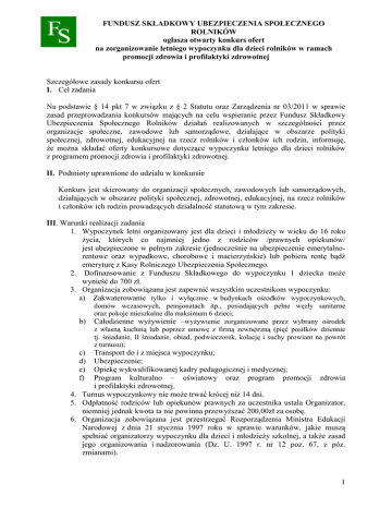 FUNDUSZ SKŁADKOWY UBEZPIECZENIA SPOŁECZNEGO ROLNIKÓW ogłasza otwarty konkurs ofert na zorganizowanie letniego wypoczynku dla dzieci rolników w ramach promocji zdrowia i profilaktyki zdrowotnej Szczegółowe zasady konkursu ofert I. Cel zadania Na podstawie § 14 pkt 7 w związku z § 2 Statutu oraz Zarządzenia nr 03/2011 w sprawie zasad przeprowadzania konkursów mających na celu wspieranie przez Fundusz Składkowy Ubezpieczenia Społecznego Rolników działań realizowanych w szczególności przez organizacje społeczne, zawodowe lub samorządowe, działające w obszarze polityki społecznej, zdrowotnej, edukacyjnej na rzecz rolników i członków ich rodzin, informuję, Ŝe moŜna składać oferty konkursowe dotyczące wypoczynku letniego dla dzieci rolników z programem promocji zdrowia i profilaktyki zdrowotnej. II. Podmioty uprawnione do udziału w konkursie Konkurs jest skierowany do organizacji społecznych, zawodowych lub samorządowych, działających w obszarze polityki społecznej, zdrowotnej, edukacyjnej, na rzecz rolników i członków ich rodzin prowadzących działalność statutową w tym zakresie. III. Warunki realizacji zadania 1. Wypoczynek letni organizowany jest dla dzieci i młodzieŜy w wieku do 16 roku Ŝycia, których co najmniej jedno z rodziców /prawnych opiekunów/ jest ubezpieczone w pełnym zakresie (jednocześnie na ubezpieczenie emerytalnorentowe oraz wypadkowe, chorobowe i macierzyńskie) lub pobiera rentę bądź emeryturę z Kasy Rolniczego Ubezpieczenia Społecznego. 2. Dofinansowanie z Funduszu Składkowego do wypoczynku 1 dziecka moŜe wynieść do 700 zł. 3. Organizacja zobowiązana jest zapewnić wszystkim uczestnikom wypoczynku: a) Zakwaterowanie tylko i wyłącznie w budynkach ośrodków wypoczynkowych, b) domów wczasowych, pensjonatach itp., posiadających pełne węzły sanitarne oraz pokoje mieszkalne dla maksimum 6 dzieci; Całodzienne wyŜywienie –wyŜywienie zorganizowane przez wybrany ośrodek z własną kuchnią lub poprzez umowę z firmą zewnętrzną (pięć posiłków dziennie tj. śniadanie, II śniadanie, obiad, podwieczorek, kolację i suchy prowiant na powrót z turnusu); c) d) e) f) Transport do i z miejsca wypoczynku; Ubezpieczenie; Opiekę wykwalifikowanej kadry pedagogicznej i medycznej; Program kulturalno – oświatowy oraz program promocji zdrowia i profilaktyki zdrowotnej. 4. Turnus wypoczynkowy nie moŜe trwać krócej niŜ 14 dni. 5. Odpłatność rodziców lub opiekunów prawnych za uczestnika ustala Organizator, niemniej jednak kwota ta nie powinna przewyŜszać 200,00zł za osobę. 6. Organizacja zobowiązana jest przestrzegać Rozporządzenia Ministra Edukacji Narodowej z dnia 21 stycznia 1997 roku w sprawie warunków, jakie muszą spełniać organizatorzy wypoczynku dla dzieci i młodzieŜy szkolnej, a takŜe zasad jego organizowania i nadzorowania (Dz. U. 1997 r. nr 12 poz. 67, z póz. zmianami). 1 7. Koszty przedstawione w rozliczeniu mogą dotyczyć jedynie pkt. 3 a-f 8. Dofinansowanie z Funduszu Składkowego nie moŜe wynieść więcej niŜ 80% kosztów zadania, a Organizacja zobowiązana jest ponieść min. 20 % kosztów z własnych środków lub innych źródeł i przedstawić je w rozliczeniu. IV. Tryb składania ofert 1. Oferty naleŜy składać do dnia 2 maja 2011 r. w siedzibie Funduszu Składkowego USR w Warszawie przy ul. śurawiej 32/34 w godzinach 8-16, lub przesłać na adres: Fundusz Składkowy Ubezpieczenia Społecznego Rolników ul. śurawia 32/34, 00-515 Warszawa (decyduje data wpływu do Biura Zarządu FSUSR). 2. Wzór oferty konkursowej dostępny jest na stronie internetowej Funduszu Składkowego USR www.bip.fsusr.gov.pl 3. Oferta musi zawierać poprawnie wypełniony formularz oraz załączniki: – aktualny wypis z właściwego rejestru, – statut Organizacji – zaświadczenie z banku stwierdzające wolny od zajęć i egzekucji nr rachunku bankowego Organizacji W przypadku dostarczenia kopii dokumentów muszą być one potwierdzone za zgodność z oryginałem przez osobę upowaŜnioną ze strony Organizacji. V. Kryteria stosowane przy wyborze ofert: 1. wnioskowana kwota dofinansowania, 2. udział własnych środków, 3. ogólny koszt całego przedsięwzięcia, 4. wysokość wpłat rodziców / opiekunów 5. miejsce realizacji turnusów, 6. region rekrutacji uczestników, 7. zakres programu w ramach promocji zdrowia i profilaktyki zdrowotnej, 8. wiarygodność Organizacji, 9. dotychczasową współpracę z Funduszem Składkowym, 10. spełnienie wymogów formalno-prawnych niezbędnych do uzyskania wsparcia finansowego ze środków Funduszu Składkowego. VI. Przekazanie środków finansowych Fundusz Składkowy podpisze porozumienia z Organizacjami, które otrzymają największą liczbę punktów. Kwota dofinansowania w zaleŜności od wysokości dofinansowania zostanie przekazana w dwóch transzach na rachunek bankowy wskazany w porozumieniu przez Wnioskodawcę. Pierwsza transza w wysokości 50% przyznanego dofinansowania, będzie przekazana po podpisaniu porozumienia i po wystawieniu przez Fundusz Składkowy Noty uznaniowej. Druga transza, w wysokości pozostałych 50% dofinansowania, będzie przekazana w terminie 14 dni po zaakceptowaniu przez Fundusz Składkowy złoŜonego przez Organizatora pełnego rozliczenia zawierającego sprawozdanie merytoryczne i rozliczenie finansowe. 2 VII. Rozliczenie działania Organizacja zobowiązana jest do pełnego rozliczenia poniesionych kosztów do dnia określonego w Porozumieniu. Podstawę rozliczenia stanowić będą: 1. szczegółowe sprawozdanie merytoryczne, 2. oryginały list uczestników potwierdzone przez ośrodki i Organizację, 3. oryginały list zbiorczych lub zaświadczeń indywidualnych rolników (rodziców dzieci lub ich prawnych opiekunów) objętych rolniczym systemem ubezpieczenia społecznego, potwierdzone lub wystawione przez Oddziały Regionalne lub Placówki Terenowe KRUS, 4. rozliczenie finansowe zawierające kopie faktur i 