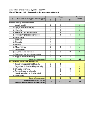 Zawód: sprzedawca; symbol 522301 Kwalifikacje: K1 - Prowadzenie sprzedaży (A.18.) Obowiązkowe zajęcia edukacyjne Lp Klasa III Tyg. liczba godzin I II Język polski Język obcy nowożytny Historia Wiedza o społeczeństwie Podstawy przedsiębiorczości Geografia Biologia Chemia Fizyka Matematyka Informatyka Wychowanie fizyczne Edukacja dla bezpieczeństwa Zajęcia z wychowawcą 2 2 1 3 2 1 1 1 1 1 1 1 2 1 3 1 1 1 1 1 3 Łączna liczba godzin Kształcenie zawodowe teoretyczne 17 13 6 36 3 2 1 3 3 1 3 1 6 2 1 2 3 5 9 6 20 22 22 12 56 Przedmioty ogólnokształcace 1 2 3 4 5 6 7 8 9 10 11 12 13 14 Towar jako przedmiot handlu Organizacja i techniki sprzedaży Obsługa klientów Przedsiębiorca w handlu Język angielski w działalności 5 handlowej 1 2 3 4 Łączna liczba godzin Tygodniowy wymiar godzin obowiązkowych zajęć edukacyjnych 5 4 2 1 1 2 1 1 1 1 1 4 1 3 3 9 1 4 5