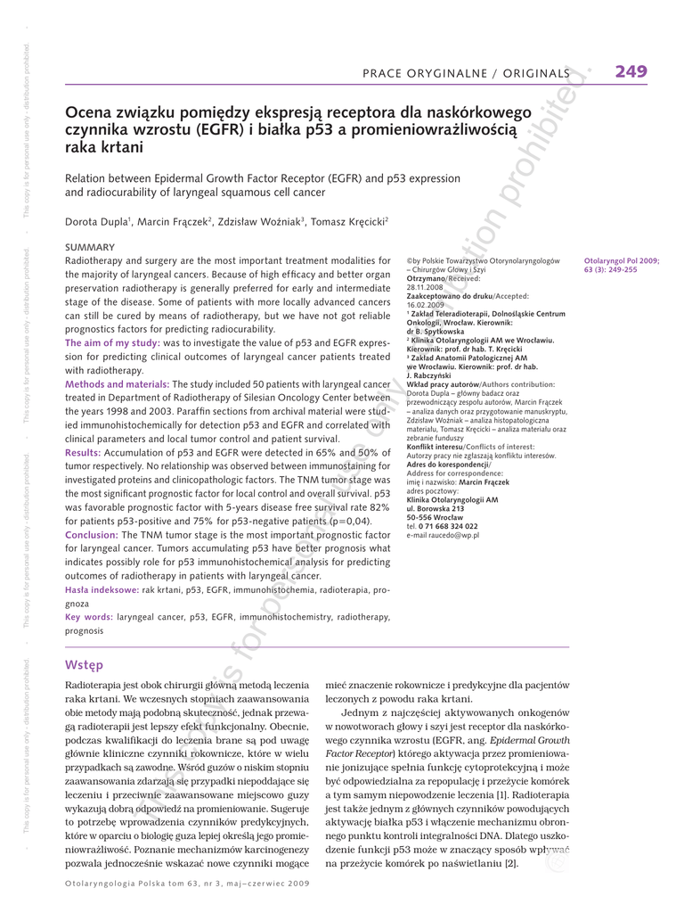 ibu tio np roh ibit Dorota Dupla1, Marcin Frączek 2, Zdzisław Woźniak 3, Tomasz Kręcicki2 ©by Polskie Towarzystwo Otorynolaryngologów – Chirurgów Głowy i Szyi Otrzymano/Received: 28.11.2008 Zaakceptowano do druku/Accepted: 16.02.2009 1 Zakład Teleradioterapii, Dolnośląskie Centrum Onkologii, Wrocław. Kierownik: dr B. Spytkowska 2 Klinika Otolaryngologii AM we Wrocławiu. Kierownik: prof. dr hab. T. Kręcicki 3 Zakład Anatomii Patologicznej AM we Wrocławiu. Kierownik: prof. dr hab. J. Rabczyński Wkład pracy autorów/Authors contribution: Dorota Dupla – główny badacz oraz przewodniczący zespołu autorów, Marcin Frączek – analiza danych oraz przygotowanie manuskryptu, Zdzisław Woźniak – analiza histopatologiczna materiału, Tomasz Kręcicki – analiza materiału oraz zebranie funduszy Konflikt interesu/Conflicts of interest: Autorzy pracy nie zgłaszają konfliktu interesów. Adres do korespondencji/ Address for correspondence: imię i nazwisko: Marcin Frączek adres pocztowy: Klinika Otolaryngologii AM ul. Borowska 213 50-556 Wrocław tel. 0 71 668 324 022 e-mail [email protected] pe rs on al us eo nly -d istr SUMMARY Radiotherapy and surgery are the most important treatment modalities for the majority of laryngeal cancers. Because of high efficacy and better organ preservation radiotherapy is generally preferred for early and intermediate stage of the disease. Some of patients with more locally advanced cancers can still be cured by means of radiotherapy, but we have not got reliable prognostics factors for predicting radiocurability. The aim of my study: was to investigate the value of p53 and EGFR expression for predicting clinical outcomes of laryngeal cancer patients treated with radiotherapy. Methods and materials: The study included 50 patients with laryngeal cancer treated in Department of Radiotherapy of Silesian Oncology Center between the years 1998 and 2003. Paraffin sections from archival material were studied immunohistochemically for detection p53 and EGFR and correlated with clinical parameters and local tumor control and patient survival. Results: Accumulation of p53 and EGFR were detected in 65% and 50% of tumor respectively. No relationship was observed between immunostaining for investigated proteins and clinicopathologic factors. The TNM tumor stage was the most significant prognostic factor for local control and overall survival. p53 was favorable prognostic factor with 5-years disease free survival rate 82% for patients p53-positive and 75% for p53-negative patients (p=0,04). Conclusion: The TNM tumor stage is the most important prognostic factor for laryngeal cancer. Tumors accumulating p53 have better prognosis what indicates possibly role for p53 immunohistochemical analysis for predicting outcomes of radiotherapy in patients with laryngeal cancer. Hasła indeksowe: rak krtani, p53, EGFR, immunohistochemia, radioterapia, prognoza Key words: laryngeal cancer, p53, EGFR, immunohistochemistry, radiotherapy, prognosis for This copy is for personal use only - distribution prohibited. This copy is for personal use only - distribution prohibited. 249 Relation between Epidermal Growth Factor Receptor (EGFR) and p53 expression and radiocurability of laryngeal squamous cell cancer - y is Wstęp is c op Radioterapia jest obok chirurgii główną metodą leczenia raka krtani. We wczesnych stopniach zaawansowania obie metody mają podobną skuteczność, jednak przewagą radioterapii jest lepszy efekt funkcjonalny. Obecnie, podczas kwalifikacji do leczenia brane są pod uwagę głównie kliniczne czynniki rokownicze, które w wielu przypadkach są zawodne. Wśród guzów o niskim stopniu zaawansowania zdarzają się przypadki niepoddające się leczeniu i przeciwnie zaawansowane miejscowo guzy wykazują dobrą odpowiedź na promieniowanie. Sugeruje to potrzebę wprowadzenia czynników predykcyjnych, które w oparciu o biologię guza lepiej określą jego promieniowrażliwość. Poznanie mechanizmów karcinogenezy pozwala jednocześnie wskazać nowe czynniki mogące Th This copy is for personal use only - distribution prohibited. - ed . - Ocena związku pomiędzy ekspresją receptora dla naskórkowego czynnika wzrostu (EGFR) i białka p53 a promieniowrażliwością raka krtani - This copy is for personal use only - distribution prohibited. PRACE ORYGINALNE / ORIGINALS Otolar yngologia Polska tom 63, nr 3, maj – c zer wiec 20 0 9 mieć znaczenie rokownicze i predykcyjne dla pacjentów leczonych z powodu raka krtani. Jednym z najczęściej aktywowanych onkogenów w nowotworach głowy i szyi jest receptor dla naskórkowego czynnika wzrostu (EGFR, ang. Epidermal Growth Factor Receptor) którego aktywacja przez promieniowanie jonizujące spełnia funkcję cytoprotekcyjną i może być odpowiedzialna za repopulację i przeżycie komórek a tym samym niepowodzenie leczenia [1]. Radioterapia jest także jednym z głównych czynników powodujących aktywację białka p53 i włączenie mechanizmu obronnego punktu kontroli integralności DNA. Dlatego uszkodzenie funkcji p53 może w znaczący sposób wpływać na przeżycie komórek po naświetlaniu [2]. Otolaryngol Pol 2009; 63 (3): 249-255 ed . - PRACE ORYGINALNE / ORIGINALS is c op y is for pe rs on al us ibu tio np roh ibit eo Do badań włączono 50 chorych leczonych w Zakładzie Teleradioterapii Dolnośląskiego Centrum Onkologii we Wrocławiu w latach 1998–2003. Wśród chorych było 40 mężczyzn i 10 kobiet. Wiek pacjentów wahał się od 33 do 82 lat (średnia 61 lat). Kliniczne zaawansowanie nowotworu określone za pomocą klasyfikacji TNM wg UICC. Wśród chorych były 4 przypadki raka przedinwazyjnego (Tis), 20 chorych z guzem T1, 20 z T2, 5 z T3 i 1 z T4. W 46 przypadkach nie stwierdzono obecności przerzutów do węzłów chłonnych, 2 chorych oceniono jako N1 a pozostałych 2 jako N2. Pierwszy stopień zaawansowania stwierdzono u 19 chorych, II u 18, III u 7 i IVa u 2 pacjentów. U 39 pac