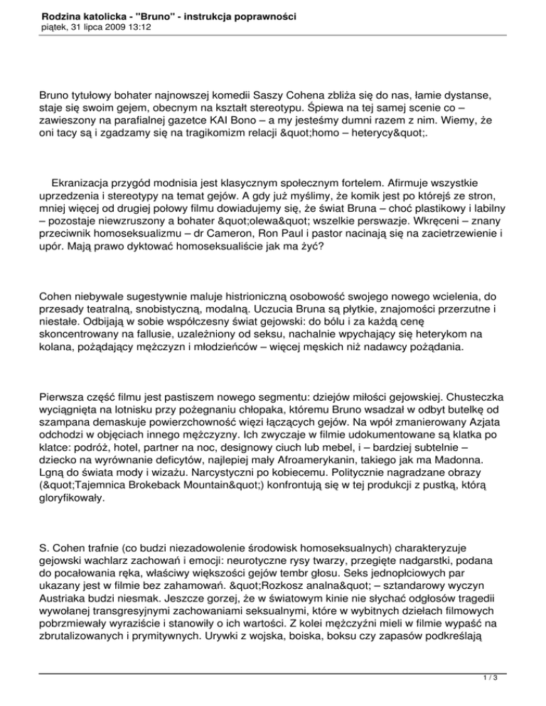 Rodzina katolicka - "Bruno" - instrukcja poprawności piątek, 31 lipca 2009 13:12 Bruno tytułowy bohater najnowszej komedii Saszy Cohena zbliża się do nas, łamie dystanse, staje się swoim gejem, obecnym na kształt stereotypu. Śpiewa na tej samej scenie co – zawieszony na parafialnej gazetce KAI Bono – a my jesteśmy dumni razem z nim. Wiemy, że oni tacy są i zgadzamy się na tragikomizm relacji "homo – heterycy". Ekranizacja przygód modnisia jest klasycznym społecznym fortelem. Afirmuje wszystkie uprzedzenia i stereotypy na temat gejów. A gdy już myślimy, że komik jest po którejś ze stron, mniej więcej od drugiej połowy filmu dowiadujemy się, że świat Bruna – choć plastikowy i labilny – pozostaje niewzruszony a bohater "olewa" wszelkie perswazje. Wkręceni – znany przeciwnik homoseksualizmu – dr Cameron, Ron Paul i pastor nacinają się na zacietrzewienie i upór. Mają prawo dyktować homoseksualiście jak ma żyć? Cohen niebywale sugestywnie maluje histrioniczną osobowość swojego nowego wcielenia, do przesady teatralną, snobistyczną, modalną. Uczucia Bruna są płytkie, znajomości przerzutne i niestałe. Odbijają w sobie współczesny świat gejowski: do bólu i za każdą cenę skoncentrowany na fallusie, uzależniony od seksu, nachalnie wpychający się heterykom na kolana, pożądający mężczyzn i młodzieńców – więcej męskich niż nadawcy pożądania. Pierwsza część filmu jest pastiszem nowego segmentu: dziejów miłości gejowskiej. Chusteczka wyciągnięta na lotnisku przy pożegnaniu chłopaka, któremu Bruno wsadzał w odbyt butelkę od szampana demaskuje powierzchowność więzi łączących gejów. Na wpół zmanierowany Azjata odchodzi w objęciach innego mężczyzny. Ich zwyczaje w filmie udokumentowane są klatka po klatce: podróż, hotel, partner na noc, designowy ciuch lub mebel, i – bardziej subtelnie – dziecko na wyrównanie deficytów, najlepiej mały Afroamerykanin, takiego jak ma Madonna. Lgną do świata mody i wizażu. Narcystyczni po kobiecemu. Politycznie nagradzane obrazy ("Tajemnica Brokeback Mountain") konfrontują się w tej produkcji z pustką, którą gloryfikowały. S. Cohen trafnie (co budzi niezadowolenie środowisk homoseksualnych) charakteryzuje gejowski wachlarz zachowań i emocji: neurotyczne rysy twarzy, przegięte nadgarstki, podana do pocałowania ręka, właściwy większości gejów tembr głosu. Seks jednopłciowych par ukazany jest w filmie bez zahamowań. "Rozkosz analna" – sztandarowy wyczyn Austriaka budzi niesmak. Jeszcze gorzej, że w światowym kinie nie słychać odgłosów tragedii wywołanej transgresyjnymi zachowaniami seksualnymi, które w wybitnych dziełach filmowych pobrzmiewały wyraziście i stanowiły o ich wartości. Z kolei mężczyźni mieli w filmie wypaść na zbrutalizowanych i prymitywnych. Urywki z wojska, boiska, boksu czy zapasów podkreślają 1/3 Rodzina katolicka - "Bruno" - instrukcja poprawności piątek, 31 lipca 2009 13:12 atawizmy, ale nie dyskwalifikują koszarowej męskości. Oryginalność głównego bohatera kontrastuje z myśliwymi, wojakami, czy po prostu heteroseksualistami, którzy cierpliwie tłumaczą jak to jest z kobietą. Utylitaryzm gejów spłaszcza mężczyznę do roli rekwizytu, szybko przemijającej – z dewastacją męskości – przygody i materii seksualnego użycia, co pogłębia przepaści i prowokuje wybuchy agresji. Film bezlitośnie nasuwa widzowi wniosek o niemożności porozumienia się homo- i heteroseksualnej organizacji społeczeństwa. Dosłownie jak w trakcie projekcji. Geje w sali kinowej śmieją się z czego innego, niż heterycy. Ich subkultura operuje błyskawicznymi kodami, nierozpoznawalnymi dla mężczyzny heteroseksualnego. Sfeminizowany homoseksualista nie budzi zainteresowania, jest nieciekawy. Mężczyzna pożąda kobiety, prawdziwej. Koledzy w wojsku próbują czegoś nauczyć Bruna, ale jego wartością jest pasek od Dolce&Gabbana. Zapamiętujemy rozdarcie obu światów, ich hermetyczność i niepokonane różnice. Cohen wydobywa tragikomizm tej utrwalonej w naszym wieku sytuacji omijając szerokim łukiem tematy niepoprawne: np. nietolerancję brytyjskich urzędników, którzy odmawiają prawa do adopcji dwojgu staruszkom wiernym swojemu sumieniu. (Nie chcieli uczyć swoich wnuków o homoseksualizmie). Stalowo neutralna względem religii a momentami kpiąca z chrześcijaństwa satyra wpisuje się w starą hollywoodzką tradycję. Adoptowany "murzynek" wiszący na krzyżu nasuwa skojarzenie z agresywnie laickim Jezusem Martina Scorsese. Odziera nas z empatii. Współczucie dla dziecka wiszącego na krzyżu i adoptowanego przez geja naraża na śmieszność. Sztywne rozumienie mechanizmów konstruujących męską tożsamość jest konsekwencją programowego naginania postaw. W przypadku Bruna są one przewidywalne, bohater obraca się wokół jednej, wyeksploatowanej w kinie osi. Z jednym wyjątkiem, gdy udający twardziela gej zaczyna się namiętnie całować i uprawiać seks z porzuconym kochankiem. Kamera rejestruje konfuzję, rozjuszenie i łzy kibiców. Kino może współczuć gejom, ale rzadko się teraz zdarza by wnikało w kulisy przeżyć, które towarzyszą dekonstrukcji męskości i byciu mężczyzną. Bruno jest produktem subkultury gejowskiej, mikrospołeczeństwa, które wędruje obok heteroseksualnego mainstreamu będąc ważne do czasu, gdy bardziej zacznie się cenić żołnierzy niż designerów. Gdy już to się stanie – w cieniu takich czy innych wydarzeń – geje przestaną się manierować; wzorem nie obserwowanych staruszków produkujących setki objawów, które zwracają na nich uwagę. Epilog wpasował się w model kiczowatego kina gejowskiego, które bez umiaru operuje sentymentalizmem i jednowymiarowymi schematami. Cohen żegna nas krótkim i nieciekawym moralitetem, do znudzenia przywoływanym w dyskusjach z społecznością homoseksualną: skoro chcą być szczęś