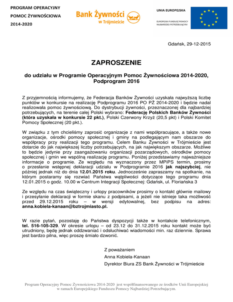 Gdańsk, 29-12-2015 ZAPROSZENIE do udziału w Programie Operacyjnym Pomoc Żywnościowa 2014-2020, Podprogram 2016 Z przyjemnością informujemy, że Federacja Banków Żywności uzyskała najwyższą liczbę punktów w konkursie na realizację Podprogramu 2016 PO PŻ 2014-2020 i będzie nadal realizowała pomoc żywnościową. Do dystrybucji żywności, przeznaczonej dla najbardziej potrzebujących, na terenie całej Polski wybrano: Federację Polskich Banków Żywności (która uzyskała w konkursie 22 pkt.), Polski Czerwony Krzyż (20,5 pkt) i Polski Komitet Pomocy Społecznej (20 pkt.). W związku z tym chcieliśmy zaprosić organizacje z nami współpracujące, a także nowe organizacje, ośrodki pomocy społecznej i gminy na podlegającym nam obszarze do współpracy przy realizacji tego programu. Celem Banku Żywności w Trójmieście jest dotarcie do jak największej liczby potrzebujących, na jak największym obszarze. Możliwe to będzie jedynie przy zaangażowaniu organizacji pozarządowych, ośrodków pomocy społecznej i gmin we wspólną realizację programu. Poniżej przedstawiamy najważniejsze informacje o programie. Ze względu na wyznaczony przez MPiPS termin, prosimy o przesłanie wstępnej deklaracji udziału w Podprogramie 2016 jak najszybciej, nie później jednak niż do dnia 12.01.2015 roku. Jednocześnie zapraszamy na spotkanie, na którym postaramy się rozwiać Państwa wątpliwości dotyczące tego programu dnia 12.01.2015 o godz. 10.00 w Centrum Integracji Społecznej: Gdańsk, ul. Floriańska 3 Ze względu na czas świąteczny i urlopy pracowników prosimy o kontakt głównie mailowy i przesyłanie deklaracji w formie skanu z podpisami, a jeżeli nie istnieje taka możliwość przed 29.12.2015 roku – w wersji edytowalnej, bez podpisu na adres: [email protected]. W razie pytań, pozostaję do Państwa dyspozycji także w kontakcie telefonicznym, tel. 516-105-329. W okresie urlopu – od 23.12 do 31.12.2015 roku kontakt może być utrudniony, będę jednak oddzwaniać i odsłuchiwać wiadomości min. raz dziennie. Sprawa jest bardzo pilna, więc proszę śmiało dzwonić. Z poważaniem Anna Kobiela-Kanaan Dyrektor Biura ZS Bank Żywności w Trójmieście Program Operacyjny Pomoc Żywnościowa 2014-2020 jest współfinansowanego ze środków Unii Europejskiej w ramach Europejskiego Funduszu Pomocy Najbardziej Potrzebującym. Program Operacyjny Pomoc Żywnościowa 2014-2020 Program Operacyjny Pomoc Żywnościowa 2014-2020 (PO PŻ) jest krajowym programem operacyjnym współfinansowanym ze środków Europejskiego Funduszu Najbardziej Potrzebującym, który realizowany jest w oparciu o rozporządzenie Parlamentu Europejskiego i Rady Nr 223/2014 z dnia 11 marca 2014 r. w sprawie Europejskiego Funduszu Pomocy Najbardziej Potrzebującym (Dz. Urz. UE L 72 z 12.03.2014 r., str. 1), zwanego dalej rozp. FEAD. PO PŻ jest finansowany ze środków Unii Europejskiej (FEAD) i ze środków krajowych (budżet państwa) w podziale 85% i 15%. Alokacja Funduszu dla Polski na okres realizacji w latach 2014-2020 wynosi około 473 mln EUR (w cenach bieżących). Wkład środków krajowych wynosić będzie około 83 mln EUR. PO PŻ przyczyniać się będzie do ograniczania ubóstwa poprzez zwiększenie bezpieczeństwa żywnościowego osób najbardziej potrzebujących i realizację działań na rzecz włączenia społecznego. Pomoc w ramach PO PŻ kierowana jest do tych osób i rodzin, które z powodu niskich dochodów nie mogą zapewnić sobie/rodzinie odpowiednich produktów żywnościowych (posiłków) i dlatego też trafiać będzie do ograniczonej liczby osób znajdujących się w najtrudniejszej sytuacji (określonej przesłankami z art. 7 ustawy o pomocy społecznej oraz poziomem dochodów odniesionych do procentowej wartości odpowiedniego kryterium dochodowego określonego w tej ustawie), stanowiąc systematyczne wsparcie. Pomoc udzielana będzie w postaci artykułów spożywczych lub posiłków, które będą przekazywane osobom najbardziej potrzebującym bezpłatnie. Należy mieć jednak na uwadze, że pomoc w ramach nowego programu nie zaspokoi wszystkich potrzeb żywieniowych osób/rodzin kwalifikujących się do tej pomocy, ale chociaż częściowo uzupełni ich niedobory związane z ograniczeniami finansowymi. Organizacje realizujące proces dystrybucji artykułów spożywczych wśród osób najbardziej potrzebujących zobowiązane są prowadzić działania w ramach środków towarzyszących mające na celu w szczególności: 1. włączenie osób doświadczających deprywacji materialnej w funkcjonowanie społeczności lokalnych, 2. pomoc towarzyszącą niezbędną do zaspokajania podstawowych potrzeb życiowych osób korzystających z pomocy żywnościowej (z wyłączeniem pomocy rzeczowej), 3. wzmacnianie samodzielności i kompetencji w zakresie prowadzenia gospodarstwa domowego. Program Operacyjny Pomoc Żywnościowa 2014-2020 jest współfinansowanego ze środków Unii Europejskiej w ramach Europejskiego Funduszu Pomocy Najbardziej Potrzebującym. Osoby kierowane są do pomocy przez ośrodki pomocy społecznej, a w przypadku osób bezdomnych, mogą być także kierowane bezpośrednio przez organizację partnerską. Dodatkowo, każda z OPR i OPL we współpracy z ośrodkami pomocy społecznej (OPS) zobowiązana jest: • dostarczać odbiorcom pomocy informacje o miejscach, w których osoby mogą skorzystać z działań w ramach projektów EFS oraz pomoc osobom potrzebującym w korzystaniu z takich działań, • współpracować z OPS w celu udzielenia pomocy osobom korzystającym ze wsparcia FEAD na drodze do aktywizacji społecznej, • oceniać w uzgodnieniu z OPS czy poszczególne osoby objęte pomocą żywnościową wymagają wsparcia aktywizacyjnego oraz informować odbiorców końcowych o możliwościach uzyskania takiego wsparcia ze środków EFS w poszczególnych regionach (informowanie o możliwości uczestnictwa w konkretnych projektach), • kierować 