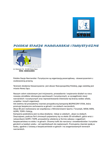 Al. Wolności 19 33-300 Nowy Sącz KRS: 0000322993 Polskie Stacje Narciarskie i Turystyczne są organizacją pozarządową - stowarzyszeniem z osobowością prawną. Terenem działania Stowarzyszenia jest obszar Rzeczpospolitej Polskiej, jego siedzibą jest miasto Nowy Sącz. Naszym celem statutowym jest inicjowanie, prowadzenie i wspieranie działań na rzecz rozwoju ośrodków rekreacyjno-sportowych i turystycznych, w szczególności stacji narciarskich i turystycznych oraz reprezentowanie interesów tej branży wobec władz, urzędów i innych organizacji. Od siedmiu lat prowadzimy rownież prospołeczną kampanię BEZPIECZNY STOK, która promuje bezpieczne zachowania w górach i na stokach narciarskich. Akcja BS jest realizowana we współpracy z Ministerstwem Sportu i Turystyki, MSW, MEN, GOPR, TOPR i Policją. Kampania podzielona jest na dwa działania : lekcje w szkołach , akcje na stokach. Zwyczajowo, podczas ferii zimowych pojawiamy się na około 20 ośrodkach, gdzie wraz z ratownikami GOPR i TOPR, prowadzimy szkolenia w formie zabawy z zagadnień bezpieczeństwa na stoku i w górach. Chcemy trafić do narciarzy i snowbordzistów i turystów górskich w każdym wieku - od najmłodszych do najstarszych. Promujemy również jazdę w kasku, zgodnie z Ustawą o bezpieczeństwie w górach i na zorganizowanych terenach narciarskich. Oto lista 82 ośrodków, z podziałem na regiony, należących do PSNiT: Tatry i Podhale: Bania-Białka Tatrzańska Grapa-Litwinka Czarna Góra Harenda - Zakopane Hawrań-Jurgów Kaniówka - Białka Tatrzańska Centrum Narciarskie Nosal Zakopane Polana Szymoszkowa Zakopane Polskie Koleje Linowe Rusiń-ski Bukowina Tatrzańska Stacja Narciarska Małe Ciche Kotelnica Białczańska Witów - Ski Kasprowy Wierch PKL Gubałówka PKL Stacja Narciarska Długa Polana Suche SKI Wyciąg Narciarski na Kalatówkach Beskid Śląski, Żywiecki, Makowski i Mały: Beskid-Spytkowice Czarny Groń Andrychów Kol. Linowa Czantoria Ustroń Nowa Osada Wisła Wyciąg Narciarski Klepki Wisła Stacja Narciarska Soszów Wisła Szczyrkowski Ośrodek Narciarski Góra Żar PKL Wyciąg Cypisek Korbielów Wyciagi Hotel & SPA Kocierz Złoty Groń Istebna Pod Starym Groniem Brenna Stacja Narciarska Cieńków Wisła Mosorny Groń Zawoja PKL Pilsko-Jontek Korbielów Stacja Narciarska Żywieckie Beskid Wyspowy, Sądecki, Gorce, Pieniny i Pogórze: Palenica Szczawnica PKL SŁOTWINY Arena Czorsztyn - Ski Kluszkowce K. G. Jaworzyna Krynicka ON Henryk Krynica Zdrój Polana Sosny w Niedzicy POLCZAKÓWKA SKI Ryterski Raj Rytro Góra Parkowa w Krynicy PKL Stacja Narciarska Koninki Stacja Narciarska Myślenice Śnieżnica Kasina Wielka Stajkowa-Krościenko Siepraw Ski Szklana Góra Ski Harbutowice Beskid Niski, Bieszczady, Pogórze Karpackie: KiczeraSki Puławy Pod Dziedzicem Gogołów Stacja Narciarska Lubinka Stacja Narciarska Chyrowa-ski Stacja Narciarska Kamianna Stok Narciarski w Przemyślu Wyciąg Narciarski OBIDOWA Sudety: Kolorowa Karpacz Czarna Góra Sienna SKI Arena Łysa Góra - Dziwiszów Mieszko Zieleniec MKL Karpacz SKI&SUN Świeradów Zdrój Stacja Narciarska Spalona Stacja Narciarska Kamienica SudetyLift Szklarska Poręba Winterpol Zieleniec Winterpol Karpacz Biały Jar Stacja Narciarska Czarnów Nartorama Zieleniec Góry Świętokrzyskie: ON Niestachów Wyżyna Lubelska i Roztocze: Nartraj Chrzanów Nartsport Rąblów ON w Batorzu Stacja Narciarska Jacnia Stacja Narciarska Kazimierz Stok Narciarski Bobliwo Stok Narciarski Parchatka Wyciągi Narciarskie Szopowe Mazury i Suwalszczyzna: Góra 4 Wiatrów Mrągowo Piękna Góra Gołdap WOSiR Szelment Stacja Narciarska Rybno Pomorze i Kaszuby: Koszałkowo - Wieżyca Góra Chrobrego Elbląg Zielona Brama w Przywidzu Nasze serwisy internetowe: