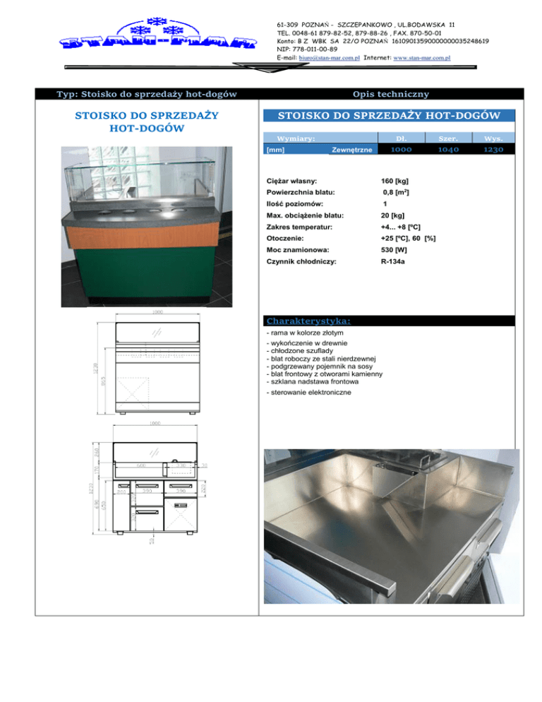 61-309 POZNAŃ - SZCZEPANKOWO , UL.BODAWSKA 11 TEL. 0048-61 879-82-52, 879-88-26 , FAX. 870-50-01 Konto: B Z WBK SA 22/O POZNAŃ 16109013590000000035248619 NIP: 778-011-00-89 E-mail: [email protected] Internet: www.stan-mar.com.pl Typ: Stoisko do sprzedaży hot-dogów Opis techniczny STOISKO DO SPRZEDAŻY HOT-DOGÓW STOISKO DO SPRZEDAŻY HOT-DOGÓW Wymiary: [mm] Zewnętrzne Dł. Szer. Wys. 1000 1040 1230 Ciężar własny: 160 [kg] Powierzchnia blatu: 0,8 [m2] Ilość poziomów: 1 Max. obciążenie blatu: 20 [kg] Zakres temperatur: +4... +8 [ºC] Otoczenie: +25 [ºC], 60 [%] Moc znamionowa: 530 [W] Czynnik chłodniczy: R-134a Charakterystyka: - rama w kolorze złotym - wykończenie w drewnie - chłodzone szuflady - blat roboczy ze stali nierdzewnej - podgrzewany pojemnik na sosy - blat frontowy z otworami kamienny - szklana nadstawa frontowa - sterowanie elektroniczne