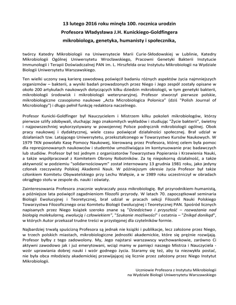 13 lutego 2016 roku minęła 100. rocznica urodzin Profesora Władysława J.H. Kunickiego-Goldfingera mikrobiologa, genetyka, humanisty i społecznika, twórcy Katedry Mikrobiologii na Uniwersytecie Marii Curie-Skłodowskiej w Lublinie, Katedry Mikrobiologii Ogólnej Uniwersytetu Wrocławskiego, Pracowni Genetyki Bakterii Instytucie Immunologii i Terapii Doświadczalnej PAN im. L. Hirszfelda oraz Instytutu Mikrobiologii na Wydziale Biologii Uniwersytetu Warszawskiego. Ten wielki uczony swą karierę zawodową poświęcił badaniu różnych aspektów życia najmniejszych organizmów – bakterii, a wyniki badań prowadzonych przez Niego i Jego zespół zostały opisane w około 200 artykułach naukowych dotyczących kilku dziedzin mikrobiologii, w tym genetyki bakterii, mikrobiologii środowisk i mikrobiologii weterynaryjnej. Profesor stworzył pierwsze polskie, mikrobiologiczne czasopismo naukowe „Acta Microbiologica Polonica” (dziś "Polish Journal of Microbiology") i długo pełnił funkcję redaktora naczelnego. Profesor Kunicki-Goldfinger był Nauczycielem i Mistrzem kilku pokoleń mikrobiologów, którzy pierwsze szlify zdobywali, słuchając Jego znakomitych wykładów i studiując "Życie bakterii", świetny i najpowszechniej wykorzystywany w powojennej Polsce podręcznik mikrobiologii ogólnej. Obok pracy naukowej i dydaktycznej, wiele czasu poświęcał działalności społecznej. Brał udział w działaniach tzw. Latającego Uniwersytetu, przekształconego w Towarzystwo Kursów Naukowych. W 1979 TKN powołało Kasę Pomocy Naukowej, kierowaną przez Profesora, której celem była pomoc dla represjonowanych naukowców i studentów umożliwiająca im kontynuowanie prac badawczych lub studiów. Profesor był też jednym z organizatorów Towarzystwa Popierania i Krzewienia Nauki, a także współpracował z Komitetem Obrony Robotników. Za tę niepokorną działalność, a także aktywność w podziemiu "solidarnościowym" został internowany 13 grudnia 1981 roku, jako jedyny członek rzeczywisty Polskiej Akademii Nauk. W późniejszym okresie życia Profesor był także członkiem Komitetu Obywatelskiego przy Lechu Wałęsie, a w 1989 roku uczestniczył w obradach okrągłego stołu w zespole ds. nauki i oświaty. Zainteresowania Profesora znacznie wykraczały poza mikrobiologię. Był przyrodnikiem-humanistą, a późniejsze lata poświęcił zagadnieniom filozofii przyrody. W latach 70. zapoczątkował seminaria Biologii Ewolucyjnej i Teoretycznej, brał udział w pracach sekcji Filozofii Nauki Polskiego Towarzystwa Filozoficznego oraz Komitetu Biologii Ewolucyjnej i Teoretycznej PAN. Spośród licznych napisanych przez Niego książek szeroko znane są "Dziedzictwo i przyszłość – rozważania nad biologią molekularną, ewolucją i człowiekiem", "Szukanie możliwości" i ostatnia – "Znikąd donikąd", w których Autor przekazał trudne treści w przystępnej dla czytelników formie. Najbardziej trwałą spuścizną Profesora są jednak nie książki i publikacje, lecz założone przez Niego, w trzech polskich miastach, mikrobiologiczne jednostki akademickie, które się prężnie rozwijają. Profesor byłby z tego zadowolony. My, Jego najstarsi warszawscy wychowankowie, zarówno Ci aktywni zawodowo jak i już emerytowani, wciąż mamy w pamięci naszego Mistrza i Nauczyciela wzór uprawiania dobrej nauki i wzór godnego życia. Staramy się też, aby ta niezwykła postać, nie była obca młodzieży akademickiej przewijającej się licznie przez założony przez Niego Instytut Mikrobiologii. Uczniowie Profesora z Instytutu Mikrobiologii na Wydziale Biologii Uniwersytetu Warszawskiego