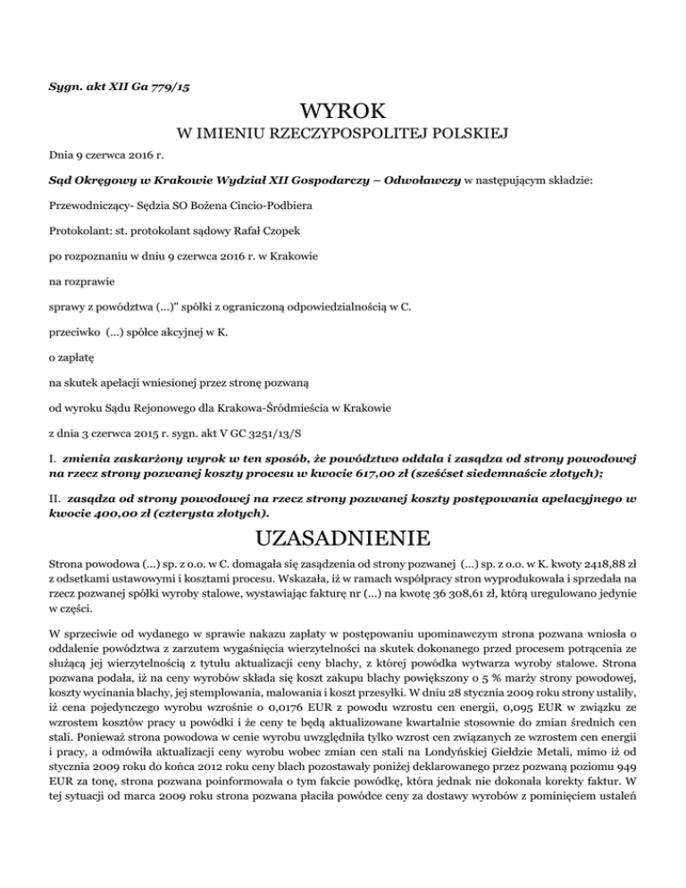 Sygn. akt XII Ga 779/15 WYROK W IMIENIU RZECZYPOSPOLITEJ POLSKIEJ Dnia 9 czerwca 2016 r. Sąd Okręgowy w Krakowie Wydział XII Gospodarczy – Odwoławczy w następującym składzie: Przewodniczący- Sędzia SO Bożena Cincio-Podbiera Protokolant: st. protokolant sądowy Rafał Czopek po rozpoznaniu w dniu 9 czerwca 2016 r. w Krakowie na rozprawie sprawy z powództwa (...)" spółki z ograniczoną odpowiedzialnością w C. przeciwko (...) spółce akcyjnej w K. o zapłatę na skutek apelacji wniesionej przez stronę pozwaną od wyroku Sądu Rejonowego dla Krakowa-Śródmieścia w Krakowie z dnia 3 czerwca 2015 r. sygn. akt V GC 3251/13/S I. zmienia zaskarżony wyrok w ten sposób, że powództwo oddala i zasądza od strony powodowej na rzecz strony pozwanej koszty procesu w kwocie 617,00 zł (sześćset siedemnaście złotych); II. zasądza od strony powodowej na rzecz strony pozwanej koszty postępowania apelacyjnego w kwocie 400,00 zł (czterysta złotych). UZASADNIENIE Strona powodowa (...) sp. z o.o. w C. domagała się zasądzenia od strony pozwanej (...) sp. z o.o. w K. kwoty 2418,88 zł z odsetkami ustawowymi i kosztami procesu. Wskazała, iż w ramach współpracy stron wyprodukowała i sprzedała na rzecz pozwanej spółki wyroby stalowe, wystawiając fakturę nr (...) na kwotę 36 308,61 zł, którą uregulowano jedynie w części. W sprzeciwie od wydanego w sprawie nakazu zapłaty w postępowaniu upominawczym strona pozwana wniosła o oddalenie powództwa z zarzutem wygaśnięcia wierzytelności na skutek dokonanego przed procesem potrącenia ze służącą jej wierzytelnością z tytułu aktualizacji ceny blachy, z której powódka wytwarza wyroby stalowe. Strona pozwana podała, iż na ceny wyrobów składa się koszt zakupu blachy powiększony o 5 % marży strony powodowej, koszty wycinania blachy, jej stemplowania, malowania i koszt przesyłki. W dniu 28 stycznia 2009 roku strony ustaliły, iż cena pojedynczego wyrobu wzrośnie o 0,0176 EUR z powodu wzrostu cen energii, 0,095 EUR w związku ze wzrostem kosztów pracy u powódki i że ceny te będą aktualizowane kwartalnie stosownie do zmian średnich cen stali. Ponieważ strona powodowa w cenie wyrobu uwzględniła tylko wzrost cen związanych ze wzrostem cen energii i pracy, a odmówiła aktualizacji ceny wyrobu wobec zmian cen stali na Londyńskiej Giełdzie Metali, mimo iż od stycznia 2009 roku do końca 2012 roku ceny blach pozostawały poniżej deklarowanego przez pozwaną poziomu 949 EUR za tonę, strona pozwana poinformowała o tym fakcie powódkę, która jednak nie dokonała korekty faktur. W tej sytuacji od marca 2009 roku strona pozwana płaciła powódce ceny za dostawy wyrobów z pominięciem ustaleń porozumienia z dnia 28 stycznia 2009 roku. W wyniku fluktuacji cen blachy w okresie tym strona pozwana nadpłaciła stronie powodowej około 13 000 EUR, co doprowadziło do złożenia w dniu 22 czerwca 2011 roku oświadczenia o potrąceniu służących jej wierzytelności wynikających z aktualizacji cen blachy z wierzytelnościami powódki. Z ostrożności analogiczne oświadczenia złożyła strona pozwana w dniach 20 lipca 2012 roku i 22 stycznia 2013 roku. Te potrącenia odwoływały się do średnich cen stali w danym kwartale. Okoliczności zafakturowania przedmiotowej dostawy oraz złożenia oświadczeń o potrąceniu przez stronę pozwaną pozostawały bezsporne. Sąd Rejonowy przeprowadził w sprawie pełne postępowanie dowodowe, uwzględniając wnioski dowodowe w zakresie przesłuchania świadków i stron na okoliczności wieloletniej współpracy stron, jej przebiegu, treści zawartego porozumienia, różnicy w cenach stali, sposobu rozumienia porozumienia przez strony, wysokości strat po stronie pozwanej oraz dalsze dowody na okoliczność skutecznego złożenia oświadczeń o potrąceniu. Wyrokiem z dnia 3 czerwca 2015 roku Sąd Rejonowy uwzględnił powództwo w całości. Sąd Rejonowy wskazał, iż pełne postępowanie dowodowe w zakresie dowodów osobowych zostało przeprowadzone omyłkowo. Sąd Rejonowy wywiódł, iż zgodnie z treścią art. 505/4/ par. 2 kpc zarzut potrącenia w postępowaniu uproszczonym dopuszczalny jest tylko wówczas, gdy roszczenie zgłoszone do potrącenia nadaje się do rozpoznania w postępowaniu uproszczonym. Ponieważ wierzytelność przedstawiana przez stronę pozwaną we wszystkich trzech oświadczeniach o potrąceniu przekraczała kwotę 10 000 zł, wskazaną w art. 505/1/kpc z jako maksymalną wartość przedmiotu sporu w postępowaniu uproszczonym, Sąd Rejonowy uznał zarzut potrącenia zgłoszony przez stronę pozwaną za niedopuszczalny. Zgodnie bowiem z treścią art. 505/4/ par. 2 kpc istnieje zakaz zgłoszenia procesowego zarzutu potrącenia, w tym zarzutu potrącenia już dokonanego czyli zakaz powołania się na umorzenie w całości lub w części dochodzonej wierzytelności w następstwie złożonego oświadczenia o potrąceniu. Dodatkowo Sąd Rejonowy wskazał, że strona pozwana nie wykazała by przedstawiona przez nią do potrącenia wierzytelność była wymagalna i z tego też powodu potrącenie nie mogła być uznane za skuteczne. W apelacji od tego wyroku strona pozwana zarzuciła Sądowi Rejonowemu nierozpoznanie istoty sprawy na skutek zaniechania zbadania merytorycznych zarzutów obronnych strony pozwanej, to jest zarzutu nieistnienia wierzytelności strony powodowej, wskazując iż Sąd Rejonowy błędnie przyjął, że istnieje przesłanka procesowa wyłączająca potrzebę zbadania tego zarzutu. Zdaniem strony skarżącej przepis art. 505/4/ par.2 kpc wyłącza możliwość zgłoszenia w toku procesu zarzutu potrącenia lecz nie znajduje zastosowania w przypadku zarzutu nieistnienia wierzytelności umorzonej na skutek potrącenia dokonanego przed wniesieniem pozwu. Dalej strona pozwana zarzuciła Sądowi Rejonowemu w naruszenie art. 455 kpc poprzez wadliwe przyjęcie, iż termin świadczenia z tytułu aktualizacji cen blach i nie jes