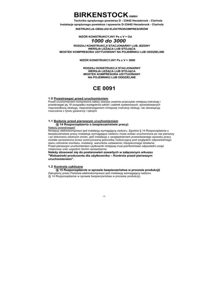 BIRKENSTOCK GMBH Technika sprężonego powietrza D - 33442 Herzebrock - Clarholz Instalacje sprężonego powietrza i spawanie D-33442 Herzebrock - Clarholz INSTRUKCJA OBSŁUGI ELEKTROKOMPRESORÓW WZÓR KONSTRUKCYJNY Ps x V > Od 1000 do 3000 RODZAJ KONSTRUKCJI STACJONARNY LUB JEZDNY WERSJA LEŻĄCA LUB STOJĄCA MOSTEK KOMPRESORA USYTUOWANY NA POJEMNIKU LUB ODDZIELNIE WZÓR KONSTRUKCYJNY Ps x V > 3000 RODZAJ KONSTRUKCJI STACJONARNY WERSJA LEŻĄCA LUB STOJĄCA MOSTEK KOMPRESORA USYTUOWANY NA POJEMNIKU LUB ODDZIELNIE CE 0091 1.0 Przestrzegać przed uruchomieniem Przed uruchomieniem kompresora należy zawsze uważnie przeczytać niniejszą instrukcję i przestrzegać jej. W przypadku wystąpienia szkód i usterek systemowych, spowodowanych nieprawidłową obsługą, nieprzestrzeganiem niniejszej instrukcji obsługi, nie obowiązują roszczenia z tytułu gwarancji i rękojmi. 1.1 Badanie przed pierwszym uruchomieniem (§ 14 Rozporządzenia o bezpieczeństwie pracy) Należy przestrzegać! Niniejszy elektrokompresor jest instalacją wymagającą nadzoru. Zgodnie § 14 Rozporządzenia o bezpieczeństwie pracy instalacja wymagająca nadzoru może zostać uruchomiona po raz pierwszy i po dokonaniu istotnych zmian, jeśli instalacja z uwzględnieniem przewidzianego sposobu pracy została sprawdzona przez autoryzowaną jednostkę nadzorującą pod względem odpowiedniego stanu odnośnie montażu, instalacji, warunków ustawienia i bezpiecznego działania. Przed pierwszym uruchomieniem użytkownik niniejszej musi poinformować odpowiedni urząd miejscowy oraz uzgodnić termin sprawdzenia. Należy stosować się do postanowień zawartych w załączonym arkuszu "Wskazówki producenta dla użytkownika – Kontrola przed pierwszym uruchomieniem". 1.2 Kontrole cykliczne (§ 15 Rozporządzenie w sprawie bezpieczeństwa w procesie produkcji) Zakupiony przez Państwa elektrokompresor jest instalacją wzmagającą nadzoru (§ 14 Rozporządzenie w sprawie bezpieczeństwa w procesie produkcji). -1- Niniejsze instalacje podlegają, zgodnie z §15 Rozporządzenia w sprawie bezpieczeństwa w procesie produkcji kontrolom cyklicznym. W związku z tym należy postępować zgodnie z załączonym arkuszem "Ważne wskazówki producenta dla użytkownika Kontrole cykliczne". 1.3 Ocena zagrożenia Dla niniejszego elektrokompresora producent dokonał oceny zagrożeń w sensie § 3 BetrSichV (Rozporządzenia o bezpieczeństwie pracy) w zakładzie producenta. 2.0 Dane techniczne Wskazówki dla użytkownika: W celu identyfikacji Państwa elektrokompresora znajdą Państwo wszystkie ważne dane techniczne na tabliczce znamionowej, przykładowo znajdą Państwo następujące dane: Typ kompresora Maks. strumień objętości Maks. ilość dostawy Moc silnika Dop. ciśnienie końcowe kompresora Maks. liczba obrotów kompresora Liczba cylindrów Wielkość zbiornika Oznakowanie CE Nr urządzenia Rok produkcji K 30 7501 2501 400 750 l/min 580 l/min (400 V) 4 KW 10 bar 900 obr/min 2 1250 litrów CE -0091 ________ ________ 2.1 Kierunek obrotów kompresora W przypadku kompresorów z silnikami indukcyjnymi trójfazowymi (400 V) należy zwrócić uwagę na odpowiedni kierunek obrotów (jak pokazuje czerwona strzałka na osłonie paska klinowego). Jeśli kompresor obraca się w złym kierunku, to należy zamienić wzajemnie 2 fazy. ! UWAGA! Czynność tę może wykonać tylko elektryk. 3.0 Sprawdzenie rodzaju konstrukcji! Należy przestrzegać: Ingerencja z zewnątrz zabroniona! Elektrokompresor jest sprawdzony odnośnie rodzaju konstrukcji. Przy kompresorze nie wolno wykonywać żadnych ingerencji z zewnątrz lub innych zmian technicznych. Zmiany i/lub uzupełnienia konstrukcji mogą odbywać się tylko za zgodą producenta, w przypadku niezgodnego postępowania wygasa rękojmia i gwarancja oraz ogólne pozwolenie na użytkowanie. ! Wa±ne! Zwrócic szczególna uwage! Elektrokompresor wyposażony jest w zawór zabezpieczający przed przekroczeniem ciśnienia. Zawór ten posiada ważną funkcję bezpieczeństwa zabezpieczającą przed przekraczaniem dopuszczalnego nadciśnienia roboczego i jest zaplombowany przez -2- producenta. Jakiekolwiek zmiany i/lub ustawienia tego zaworu są zabronione. W przypadku uszkodzona zawór zabezpieczający przed przekroczeniem ciśnienia może zostać wymieniony tylko na nowy. W przypadku naruszenia zaplombowania zaworu bezpieczeństwa pozwolenie na eksploatację ulega natychmiastowemu wygaśnięciu. Automatyczną pracę elektrokompresora zapewnia presostat elektropneumatyzny. Punkty W ŁĄCZANIA I WYŁĄCZANIA są ustawione fabrycznie w sposób optymalny. Nale±y przestrzegac! Wa±na wskazówka! Zmiany punktów przełączania WŁ lub WYŁ mogą być wykonywane tylko przez elektryka gdy zbiornik znajduje się pod ciśnieniem. W przypadku uszkodzona presostat może zostać wymieniony tylko na nowy. W razie przestawienia się punktów włączania lub wyłączania wymagają one ponownego ustawienia - w przeciwnym razie nie będzie zapewniona trwałość zbiornika sprężonego powietrza. Należy stosować się do zaleceń producenta zbiornika dotyczących ustawiana zbiornika. Można je znaleźć w instrukcji obsługi zbiornika ciśnieniowego. Instrukcja obsługi każdego urządzenia jest dołączona jako załącznik 4.0 Przytacze elektryczne ! Wa±na wskazówka! Zanim kompresor zostanie podłączony do sieci, należy upewnić się, że rodzaj prądu i napięcie podane na tabliczce znamionowej jest zgodny z rodzajem prądu i napięciem Państwa sieci zasilającej. Przestrzegać przepisów zakładu energetycznego. Elektrokompresory z wersji z silnikiem 3-fazowym (400 V / 50 Hz) o mocy napędowej do 4 kW są dostarczane z wtyczką do podłączenia do gniazdka. Elektrokompresory o mocy napędowej powyżej 4 kW są sterowane w układzie gwiazda-trójkąt i do ich włączania służy umieszczony tutaj wyłącznik. ! UWAGA! Montaż przełączenia gwiazda-trójkąt może być wykonywany tylko przez elektryka. 4.1 Ustaw