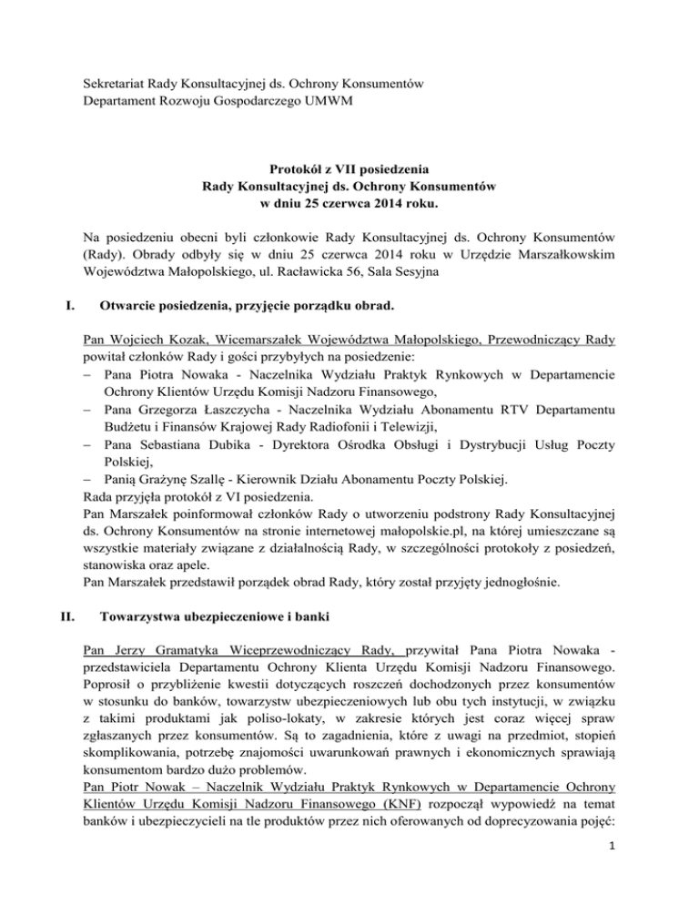 Sekretariat Rady Konsultacyjnej ds. Ochrony Konsumentów Departament Rozwoju Gospodarczego UMWM Protokół z VII posiedzenia Rady Konsultacyjnej ds. Ochrony Konsumentów w dniu 25 czerwca 2014 roku. Na posiedzeniu obecni byli członkowie Rady Konsultacyjnej ds. Ochrony Konsumentów (Rady). Obrady odbyły się w dniu 25 czerwca 2014 roku w Urzędzie Marszałkowskim Województwa Małopolskiego, ul. Racławicka 56, Sala Sesyjna I. Otwarcie posiedzenia, przyjęcie porządku obrad. Pan Wojciech Kozak, Wicemarszałek Województwa Małopolskiego, Przewodniczący Rady powitał członków Rady i gości przybyłych na posiedzenie: Pana Piotra Nowaka - Naczelnika Wydziału Praktyk Rynkowych w Departamencie Ochrony Klientów Urzędu Komisji Nadzoru Finansowego, Pana Grzegorza Łaszczycha - Naczelnika Wydziału Abonamentu RTV Departamentu Budżetu i Finansów Krajowej Rady Radiofonii i Telewizji, Pana Sebastiana Dubika - Dyrektora Ośrodka Obsługi i Dystrybucji Usług Poczty Polskiej, Panią Grażynę Szallę - Kierownik Działu Abonamentu Poczty Polskiej. Rada przyjęła protokół z VI posiedzenia. Pan Marszałek poinformował członków Rady o utworzeniu podstrony Rady Konsultacyjnej ds. Ochrony Konsumentów na stronie internetowej małopolskie.pl, na której umieszczane są wszystkie materiały związane z działalnością Rady, w szczególności protokoły z posiedzeń, stanowiska oraz apele. Pan Marszałek przedstawił porządek obrad Rady, który został przyjęty jednogłośnie. II. Towarzystwa ubezpieczeniowe i banki Pan Jerzy Gramatyka Wiceprzewodniczący Rady, przywitał Pana Piotra Nowaka przedstawiciela Departamentu Ochrony Klienta Urzędu Komisji Nadzoru Finansowego. Poprosił o przybliżenie kwestii dotyczących roszczeń dochodzonych przez konsumentów w stosunku do banków, towarzystw ubezpieczeniowych lub obu tych instytucji, w związku z takimi produktami jak poliso-lokaty, w zakresie których jest coraz więcej spraw zgłaszanych przez konsumentów. Są to zagadnienia, które z uwagi na przedmiot, stopień skomplikowania, potrzebę znajomości uwarunkowań prawnych i ekonomicznych sprawiają konsumentom bardzo dużo problemów. Pan Piotr Nowak – Naczelnik Wydziału Praktyk Rynkowych w Departamencie Ochrony Klientów Urzędu Komisji Nadzoru Finansowego (KNF) rozpoczął wypowiedź na temat banków i ubezpieczycieli na tle produktów przez nich oferowanych od doprecyzowania pojęć: 1 klasycznej poliso –lokaty, czyli umowy ubezpieczeń na życie i dożycie oferowanej przez banki o charakterze krótkoterminowym, tzn. klient wpłacał pieniądze, a ubezpieczyciel zobowiązywał się, że zostaną one wypłacone w przypadku śmierci, bądź dożycia określonego wieku. Do tych produktów KNF miała zastrzeżenia dotyczące sposobów promocji tych produktów i przekazów reklamowych. Klienci byli przekonani, że dokonali zakupu lokaty, a było to ubezpieczenie. Jest to istotna różnica w kwestii gwarancji. W przypadku produktu ubezpieczenia roszczenia zaspakaja Ubezpieczeniowy Fundusz Gwarancji, a nie Bankowy Fundusz Gwarancyjny. Jeżeli chodzi o drugi produkt – ubezpieczenia z ubezpieczeniowym funduszem kapitałowym, przepisy nie określają jednoznacznie jakie powinny być elementy konstrukcji ubezpieczenia. Na podstawie przepisów Ustawy o działalności ubezpieczeniowej można jedynie stwierdzić, iż w umowie ubezpieczenia występuje pewien wyodrębniony fundusz kapitałowy, który jest inwestowany w sposób określony w umowie. Jest on podzielony na jednostki uczestnictwa, które są wyceniane nie rzadziej niż raz w miesiącu. Jest to produkt, który ma dłuższy horyzont czasowy i wiąże się z ryzykiem inwestycyjnym. Jego wynik nie jest pewny, ponieważ ubezpieczyciel go nie gwarantuje. Jedyne obowiązki ciążące na ubezpieczycielu to dołożenie należytej staranności przy inwestowaniu środków klienta. Następnie Pan Piotr Nowak przedstawił działania Komisji Nadzoru Finansowego w tym zakresie. Podkreślił, że KNF działa na podstawie i w granicach prawa. Z uwagi na regulacje unijne, polski ustawodawca nie wyposażył KNF w uprawnienia uprzedniej lub systematycznej kontroli odgórnej warunków ubezpieczenia. KNF nie może zatem wzywać zakładów ubezpieczeń, by systematycznie przekazywali swoje wzorce umów. Przywołał art. 138 Ustawy Prawo bankowe, który zakazuje ingerowania w treść umów, tzn. środki podejmowane w ramach nadzoru nie mogą naruszać i ingerować w treści umów zawieranych przez banki z ich klientami. Na podstawie skarg przekazywanych przez klientów i wniosków pokontrolnych KNF stwierdziła niedogodności systemu naruszające interesy konsumentów. W związku z tym KNF wypracowała założenia ustawowe, które skierowane zostały do Ministerstwa Finansów. Ich celem jest kompleksowe uregulowanie kwestii zawierania umów na rzecz osób trzecich oraz wskazanie zaleceń, by przy oferowaniu klientom produktów ubezpieczeniowych z elementem inwestycyjnym, badano przed zawarciem umowy ich profil, możliwości i oczekiwania. Z uwagi na fakt, iż trwają prace nad nowelizacją ustawy o działalności ubezpieczeniowej w tym zakresie, KNF zwróciła się z wnioskiem o rozszerzenie nowelizacji. Pan Piotr Nowak zwrócił uwagę, iż początkowo propozycje te zyskały akceptację Ministerstwa Finansów, jednakże w trakcie prac zostały usunięte. W tym momencie uwagi te znalazły się w protokole rozbieżności, który został poddany pod rozstrzygnięcie do Komitetu Rady Ministrów. Oprócz tego, dostrzegając nieprawidłowości głównie na etapie sprzedaży produktów, KNF w 2012 roku wystosowała pismo do banków i zakładów ubezpieczeń wskazując pożądane praktyki sprzedażowe. Zwróciła się również do Prezesa UOKiK, by podjął w ramach swoich uprawnień stosowne działania w tym zakresie. KNF przygotowuje rekomendacje dotyczące wydawania ubezpieczeń, do których, zgodnie z prawem bankowym, banki nie mają obowiązku się stosowa