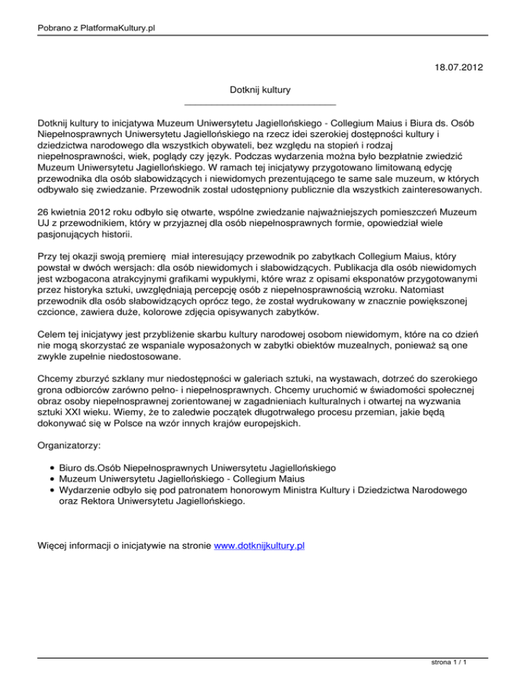 Pobrano z PlatformaKultury.pl 18.07.2012 Dotknij kultury ____________________________ Dotknij kultury to inicjatywa Muzeum Uniwersytetu Jagiellońskiego - Collegium Maius i Biura ds. Osób Niepełnosprawnych Uniwersytetu Jagiellońskiego na rzecz idei szerokiej dostępności kultury i dziedzictwa narodowego dla wszystkich obywateli, bez względu na stopień i rodzaj niepełnosprawności, wiek, poglądy czy język. Podczas wydarzenia można było bezpłatnie zwiedzić Muzeum Uniwersytetu Jagiellońskiego. W ramach tej inicjatywy przygotowano limitowaną edycję przewodnika dla osób słabowidzących i niewidomych prezentującego te same sale muzeum, w których odbywało się zwiedzanie. Przewodnik został udostępniony publicznie dla wszystkich zainteresowanych. 26 kwietnia 2012 roku odbyło się otwarte, wspólne zwiedzanie najważniejszych pomieszczeń Muzeum UJ z przewodnikiem, który w przyjaznej dla osób niepełnosprawnych formie, opowiedział wiele pasjonujących historii. Przy tej okazji swoją premierę miał interesujący przewodnik po zabytkach Collegium Maius, który powstał w dwóch wersjach: dla osób niewidomych i słabowidzących. Publikacja dla osób niewidomych jest wzbogacona atrakcyjnymi grafikami wypukłymi, które wraz z opisami eksponatów przygotowanymi przez historyka sztuki, uwzględniają percepcję osób z niepełnosprawnością wzroku. Natomiast przewodnik dla osób słabowidzących oprócz tego, że został wydrukowany w znacznie powiększonej czcionce, zawiera duże, kolorowe zdjęcia opisywanych zabytków. Celem tej inicjatywy jest przybliżenie skarbu kultury narodowej osobom niewidomym, które na co dzień nie mogą skorzystać ze wspaniale wyposażonych w zabytki obiektów muzealnych, ponieważ są one zwykle zupełnie niedostosowane. Chcemy zburzyć szklany mur niedostępności w galeriach sztuki, na wystawach, dotrzeć do szerokiego grona odbiorców zarówno pełno- i niepełnosprawnych. Chcemy uruchomić w świadomości społecznej obraz osoby niepełnosprawnej zorientowanej w zagadnieniach kulturalnych i otwartej na wyzwania sztuki XXI wieku. Wiemy, że to zaledwie początek długotrwałego procesu przemian, jakie będą dokonywać się w Polsce na wzór innych krajów europejskich. Organizatorzy: Biuro ds.Osób Niepełnosprawnych Uniwersytetu Jagiellońskiego Muzeum Uniwersytetu Jagiellońskiego - Collegium Maius Wydarzenie odbyło się pod patronatem honorowym Ministra Kultury i Dziedzictwa Narodowego oraz Rektora Uniwersytetu Jagiellońskiego. Więcej informacji o inicjatywie na stronie www.dotknijkultury.pl strona 1 / 1