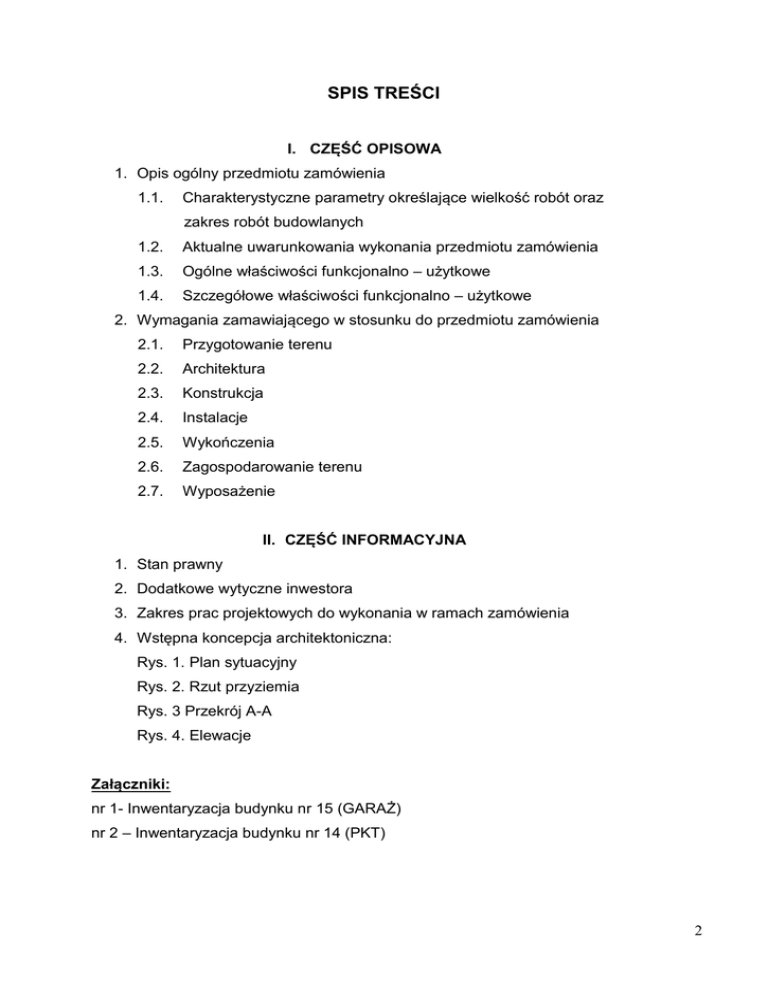 SPIS TREŚCI I. CZĘŚĆ OPISOWA 1. Opis ogólny przedmiotu zamówienia 1.1. Charakterystyczne parametry określające wielkość robót oraz zakres robót budowlanych 1.2. Aktualne uwarunkowania wykonania przedmiotu zamówienia 1.3. Ogólne właściwości funkcjonalno – użytkowe 1.4. Szczegółowe właściwości funkcjonalno – użytkowe 2. Wymagania zamawiającego w stosunku do przedmiotu zamówienia 2.1. Przygotowanie terenu 2.2. Architektura 2.3. Konstrukcja 2.4. Instalacje 2.5. Wykończenia 2.6. Zagospodarowanie terenu 2.7. Wyposażenie II. CZĘŚĆ INFORMACYJNA 1. Stan prawny 2. Dodatkowe wytyczne inwestora 3. Zakres prac projektowych do wykonania w ramach zamówienia 4. Wstępna koncepcja architektoniczna: Rys. 1. Plan sytuacyjny Rys. 2. Rzut przyziemia Rys. 3 Przekrój A-A Rys. 4. Elewacje Załączniki: nr 1- Inwentaryzacja budynku nr 15 (GARAŻ) nr 2 – Inwentaryzacja budynku nr 14 (PKT) 2 I. CZĘŚĆ OPISOWA 1. Opis ogólny przedmiotu zamówienia Przedmiotem zamówienia jest zaprojektowanie i wykonanie remontu budynku garażowego nr 15 w kompleksie należącym do Biura Ochrony Rządu w Warszawie przy ul. Podchorążych 38. 1.1. Charakterystyczne parametry określające wielkość robót oraz zakres robót budowlanych Powierzchnia użytkowa budynku ok. 1 442 m2 Kubatura budynku brutto ok. 7 316 m3 Powierzchnia zabudowy ok. 1 555 m2 Budynek jednokondygnacyjny do 12 m (niski). Obszar objęty opracowaniem 1.2. ok. 5 000 m2 Aktualne uwarunkowania wykonania przedmiotu zamówienia Przedmiotem opracowania jest istniejący budynek garażowy nr 15 z częścią przeznaczoną do obsługi bieżącej pojazdów wraz z przyległym terenem oraz budynkiem nr 14. Przedmiotowy obiekt znajduje się w północnej części chronionego kompleksu z ograniczonym dostępem osób postronnych. Obiekt usytuowany jest równolegle do granicy działki sąsiedniej, będącej w zarządzie Muzeum „Łazienki Królewskie”. Na sąsiedniej działce w ostrej granicy znajdują się budynki magazynowe i gospodarcze należące do Muzeum „Łazienki Królewskie”. Wjazd i poruszanie się po terenie kompleksu wymaga uzyskania odpowiedniej zgody służb ochrony. Do przedmiotowego obiektu zapewniony jest dojazd od ul. Podchorążych poprzez sieć dróg wewnętrznych. 1.3. Ogólne własności funkcjonalno - użytkowe W wyniku remontu przedmiotowy garaż winien spełniać następujące wymagania funkcjonalno – użytkowe: 3 - stanowisko nr 1 – stanowisko garażowe przystosowane do obsługi bieżącej autobusów i samochodów ciężarowych powyżej 3,5 t (stanowisko wyposażone w kanał rewizyjny wentylowany. Na ścianie tylnej stanowiska nr 1 istniejący węzeł sanitarny należy przebudować. Obok należy wydzielić pomieszczenie techniczne dla potrzeb rozdzielni prądu i posadowienia urządzenia UPS. - stanowisko nr 2-4 – stanowisko garażowe dla autobusów oraz samochodów ciężarowych powyżej 3,5t; - stanowisko nr 5- 22 - stanowiska garażowe dla autobusów do 20 miejsc oraz dla samochodów poniżej 3,5 t, - z pomieszczenia istniejącego węzła cieplnego należy wydzielić pom. na budynkowy punkt dystrybucyjny (BPD) o wymiarach min. 2x3 z drzwiami wzmocnionymi i wyposażony w urządzenie klimatyzacyjne. Pom węzła cieplnego należy wyremontować i przygotować do uruchomienia w przyszłości węzła – należy wymienić studzienkę schładzającą i udrożnić odpływ przykanalika do I studni zewnętrznej. Uwaga: w koncepcji oznaczono ściany podziału garażu. Wykonawca prac powinien dodatkowo uwzględnić w kosztach realizacji dodatkowe dwie ściany na szerokości garażu. Ich lokalizacja zostanie wskazana przez użytkownika na etapie wykonania projektu budowlanego. 1.4. Szczegółowe własności funkcjonalno - użytkowe L.p. Zestawienie powierzchni parter Nazwa pomieszczenia 1.1 1.2 1.3 1.4 1.5 1.6 Przedsionek W.C. RG+UPS BPD Węzeł C.O. Garaż Powierzchnia użytkowa m² 2,28 4,35 7,52 7,35 23,04 1397,08 RAZEM 1441,62 Dopuszcza się przekroczenie powierzchni projektowanych pomieszczeń o (-) 15% po uzgodnieniu z Zamawiającym. 4 2. Wymagania zamawiającego w stosunku do przedmiotu zamówienia Ze wzglądu na ciągłe użytkowanie kompleksu roboty budowlane powinny być prowadzone z zachowaniem szczególnych warunków bezpieczeństwa. Zamawiający deklaruje możliwość nieodpłatnego udostępnienia wykonawcy na czas wykonywania robót pięciu miejsc postojowych na parkingach samochodowych. Pozostałe tymczasowe miejsca należy zlokalizować na terenie budowy. Przed przystąpieniem do robót budowlanych należy wykonać następujące roboty rozbiórkowe: - bram i stolarki okiennej, - konstrukcji stalowej z zadaszeniem, - podbudowy i nawierzchni z płyt betonowych znajdujących się na tyłach garażu, - podbudowy i nawierzchni z trylinki, - ogrodzenia wraz z fundamentami, - instalacji centralnego ogrzewania. Nieprzydatne materiały rozbiórkowe i gruz należy wywieść na wysypisko. Zamawiający zapewnia możliwość składowania na terenie posesji zdemontowanych materiałów. Materiały wtórne pochodzące z rozbiórki należy zdać do magazynu wskazanego przez zamawiającego znajdującego się w odległości do 25 km. Energia elektryczna na potrzeby prac budowlanych może być pobierana z istniejącego przyłącza elektrycznego pod warunkiem jej opomiarowania. Woda dla potrzeb prac budowlanych może być pobierana z przedmiotowego budynku i będzie rozliczana wg wskazań licznika, który wykona wykonawca. Wykonawca będzie zobowiązany umową do przyjęcia odpowiedzialności od następstw i za wyniki działalności w zakresie: - organizacji i wykonywania robót budowlanych, - zabezpieczenia interesów osób trzecich, - ochrony środowiska, - warunków bezpieczeństwa pracy, - zaplecza dla potrzeb wykonawcy, - bezpieczeństwa ruchu drogowego i pieszego w otoczeniu budowy, - ochrony mienia związanego z prowadzeniem prac budowlanych. Wyroby budowlane, stosowane w trakcie wykonywania robót budowlanyc